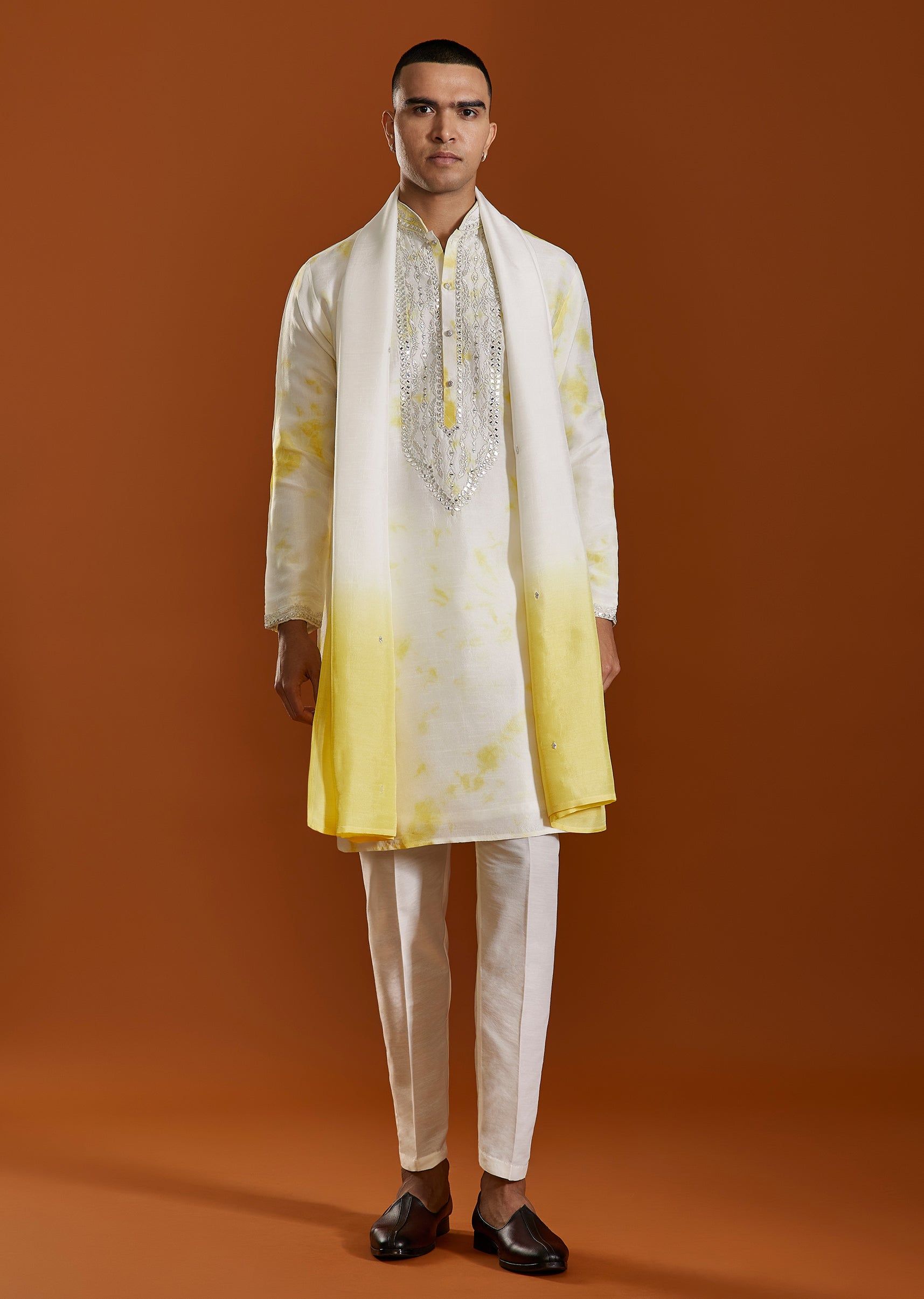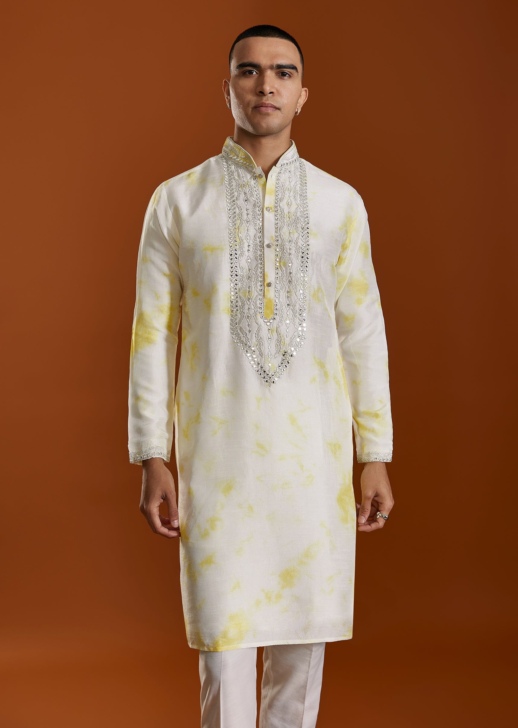 A radiant yellow art silk kurta set adorned with subtle thread and mirror embellishments that enhance its festive appeal. Featuring a mandarin collar and paired with straight pants and a dupatta, it is ideal for haldi ceremonies and daytime celebrations. Awarded as the Most Trusted Brand, we're delivering styles you love, just as promised.