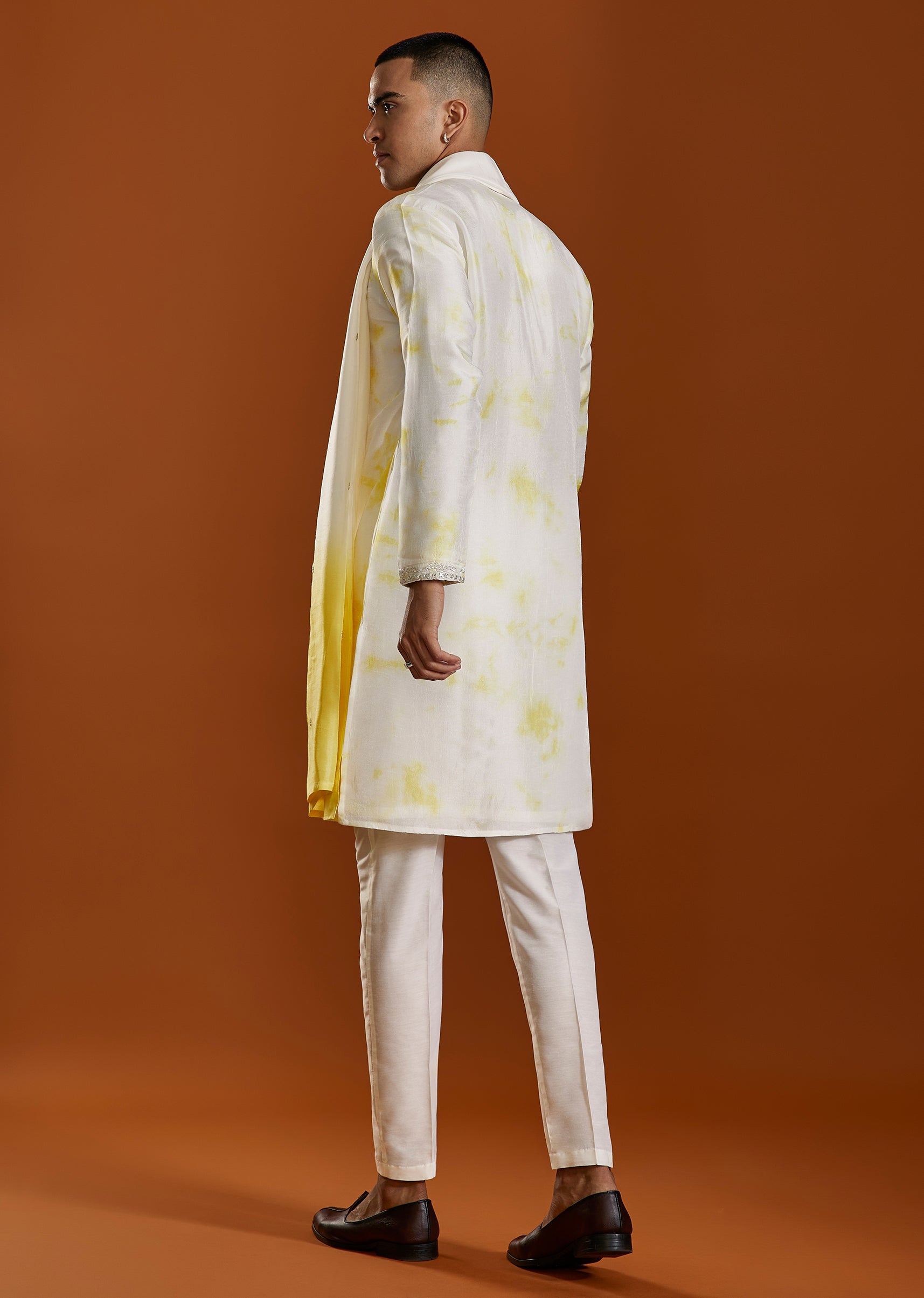 A radiant yellow art silk kurta set adorned with subtle thread and mirror embellishments that enhance its festive appeal. Featuring a mandarin collar and paired with straight pants and a... More Product Details