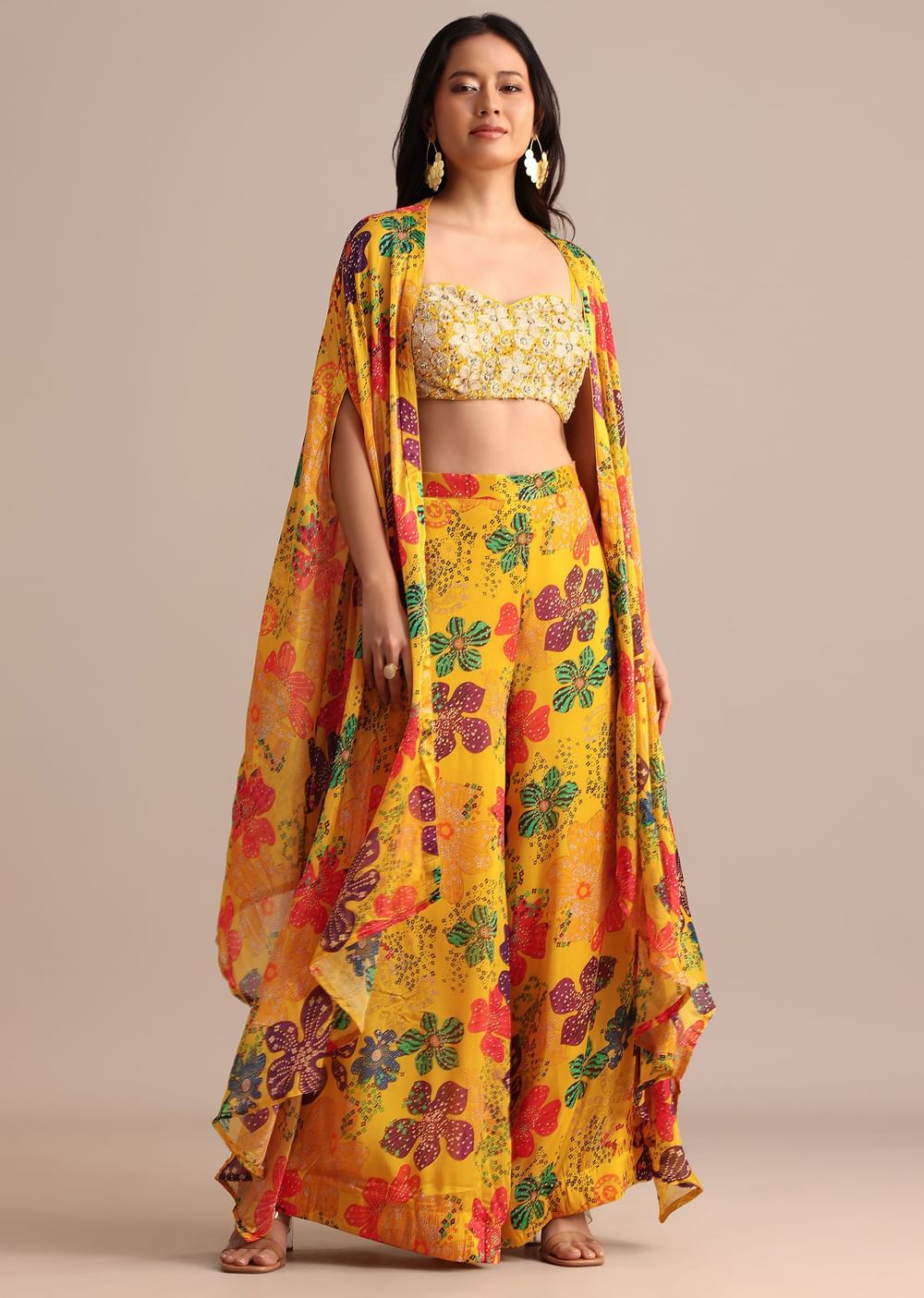 - Bask in the glow of this striking yellow chiffon set featuring a crop top palazzo and jacket.