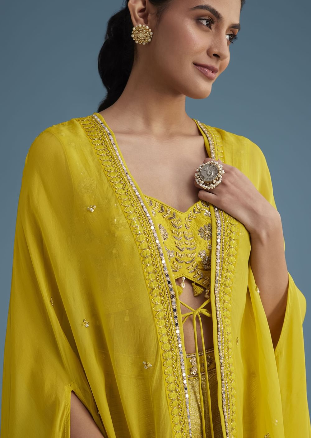 A golden ray of sunshine, this yellow embroidered croptop with a Banarasi weave palazzo and lace jacket is a perfect ensemble. With intricate Zardozi, sequins, and moti work, this outfit... More Product Details