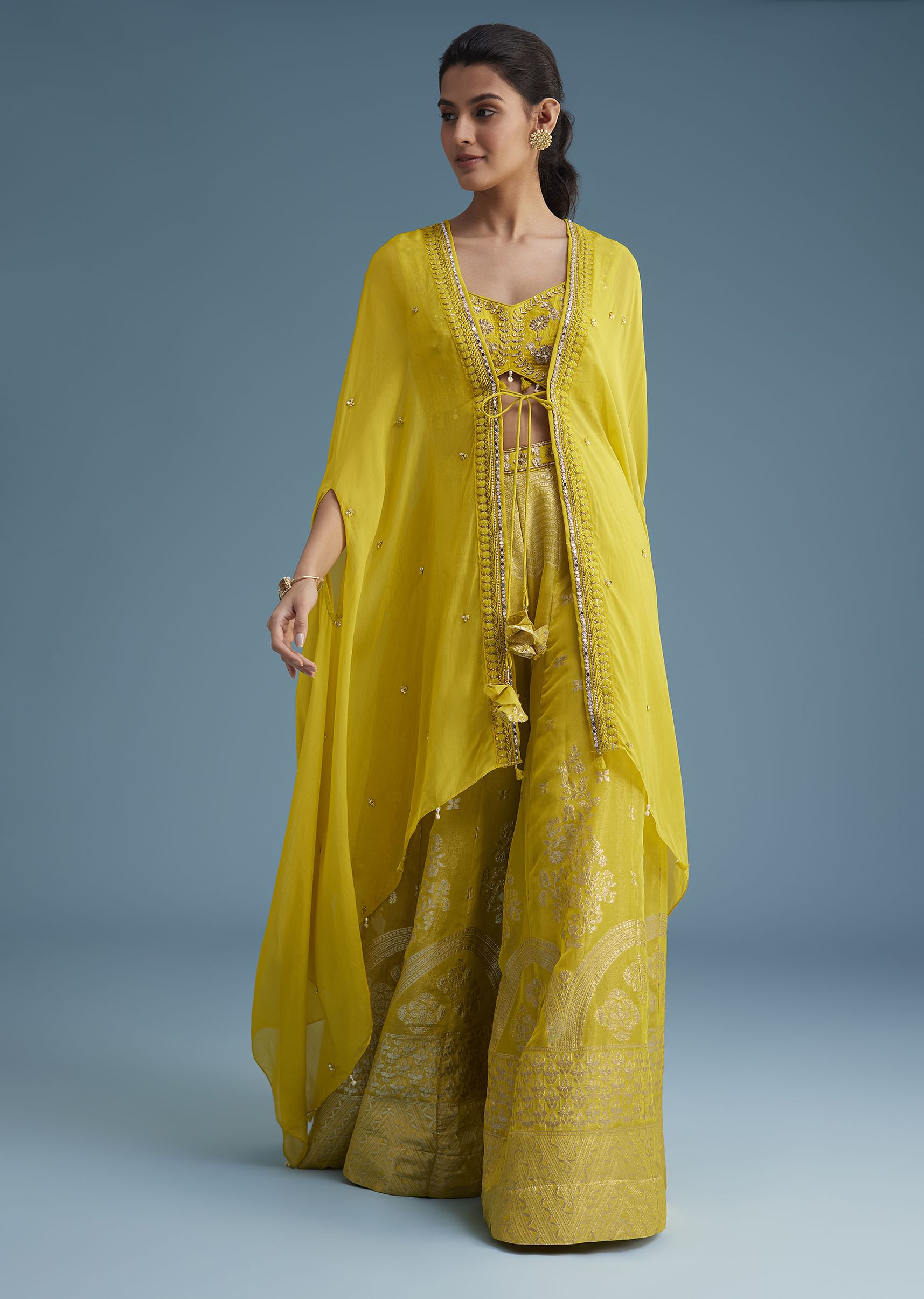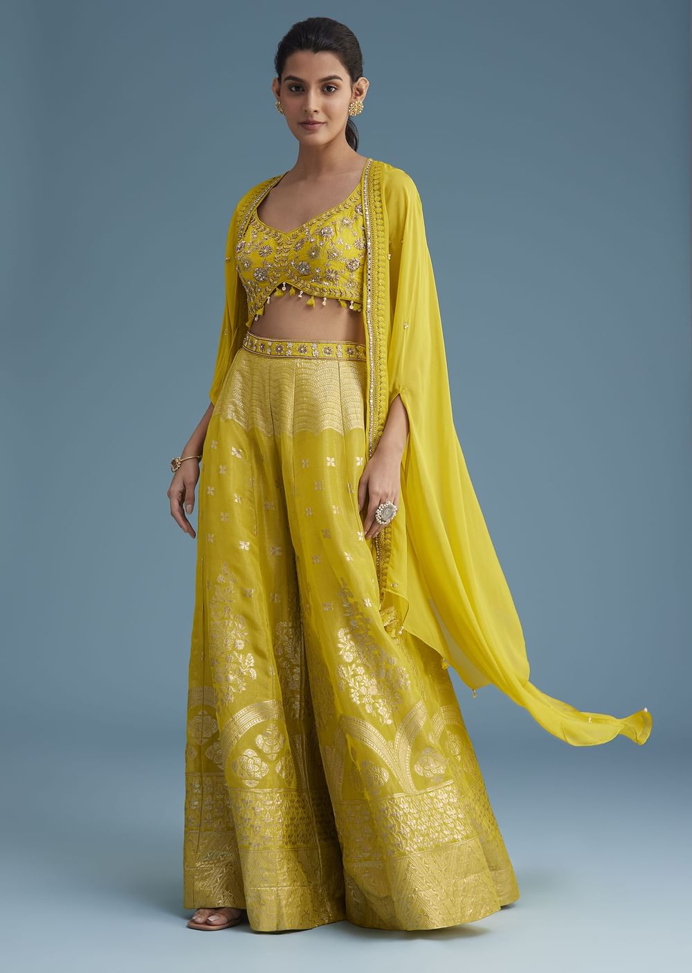 Yellow Embroidered Croptop With Banarasi Weave Palazzo And Lace Jacket