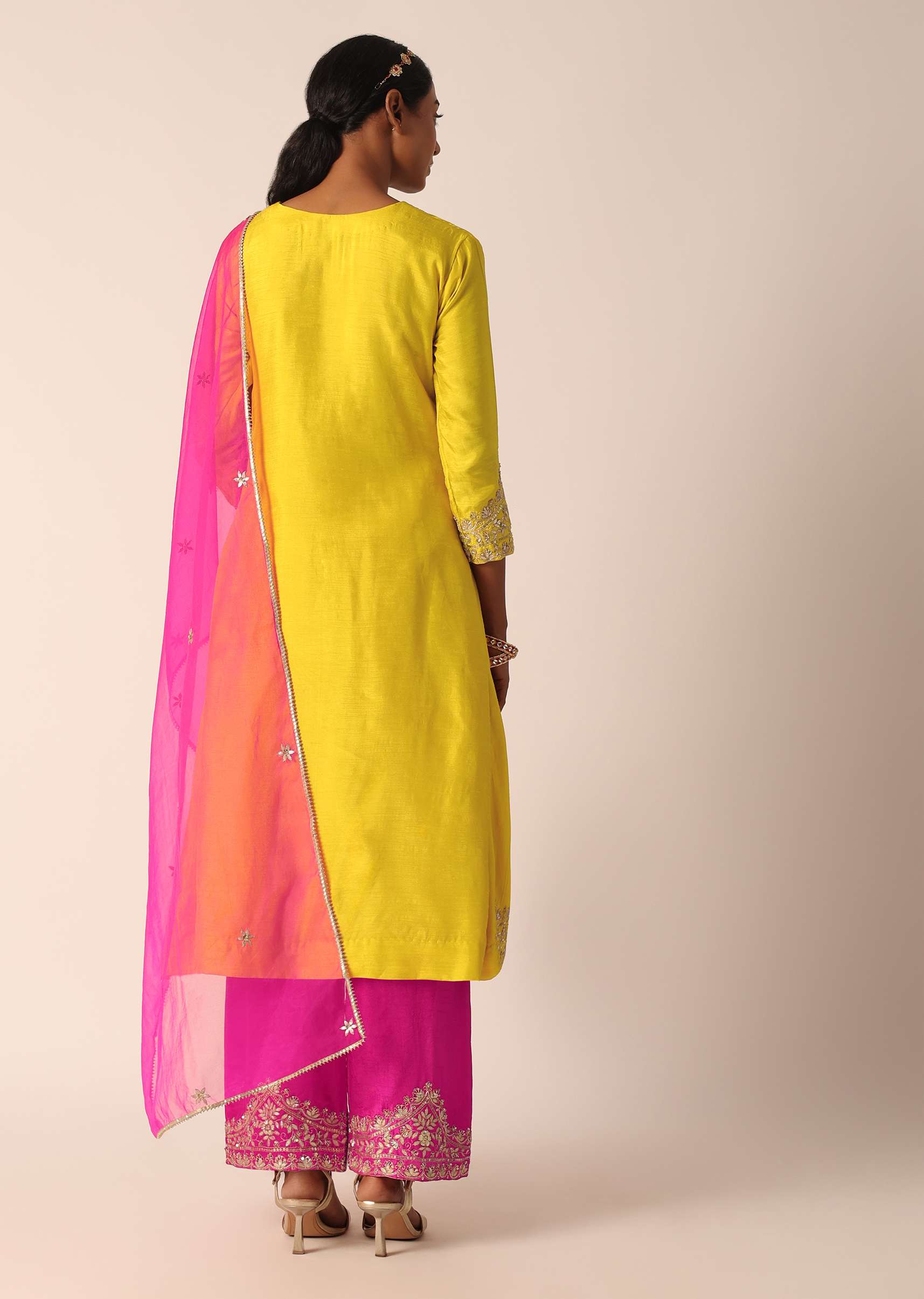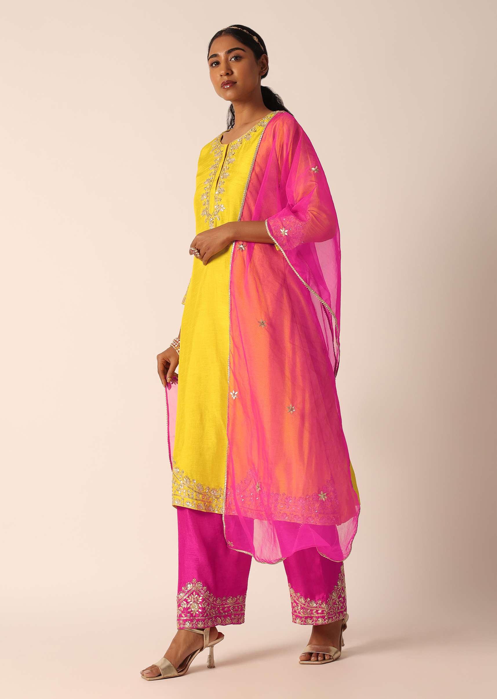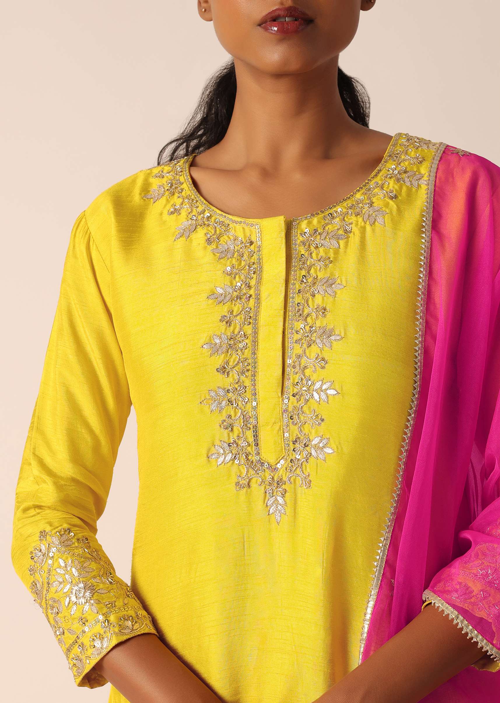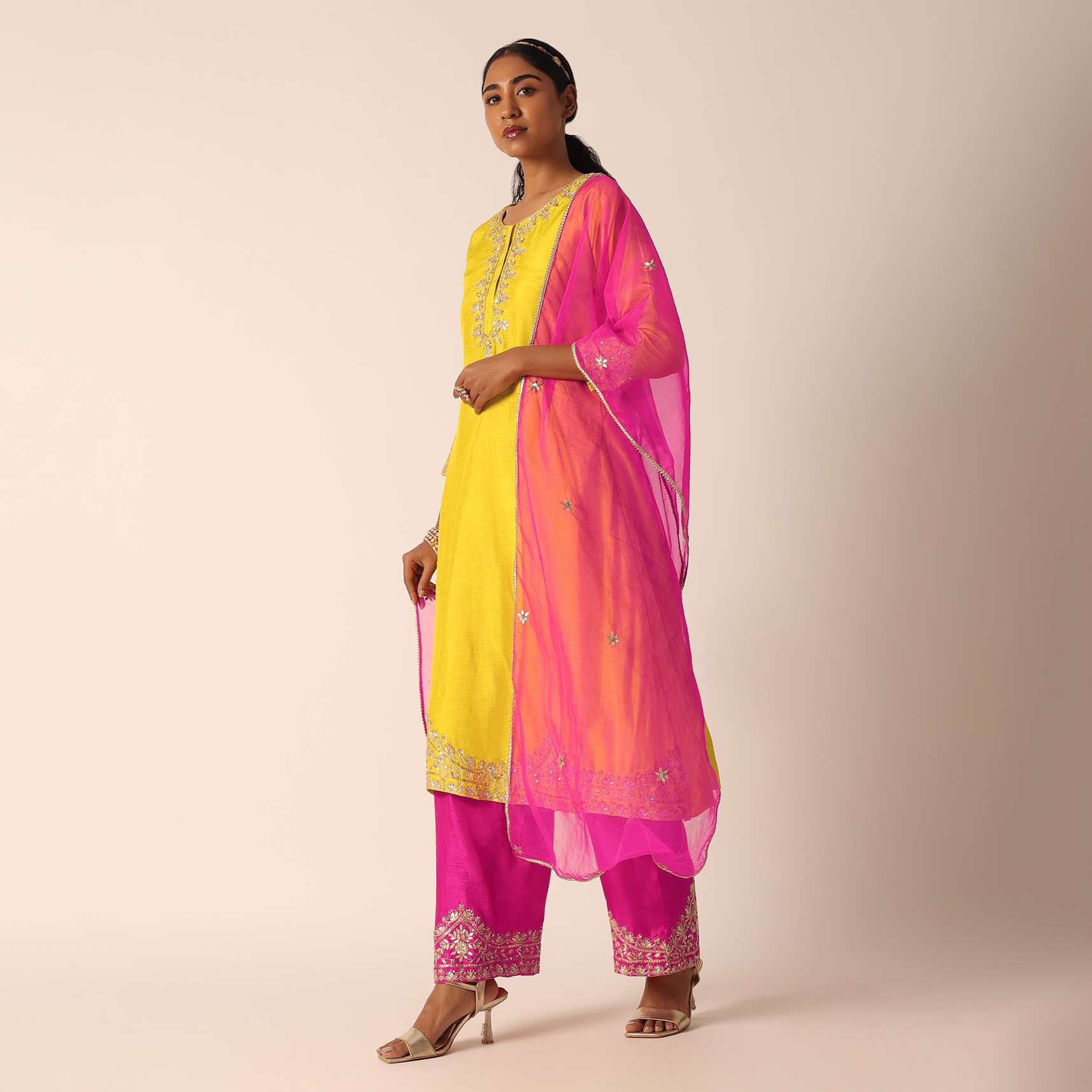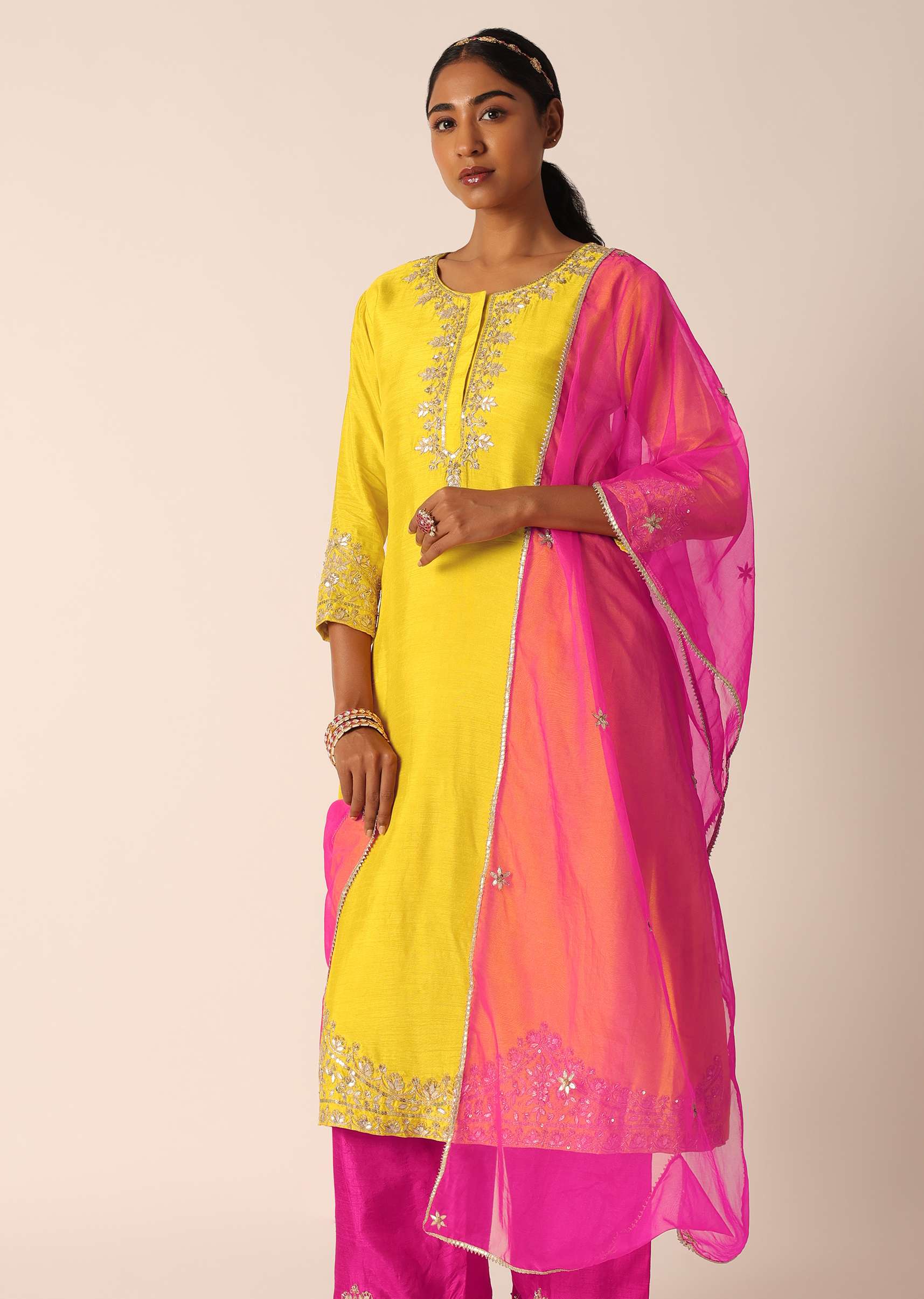 Yellow Embroidered Kurta Set With Organza Dupatta And Gota Patti Work