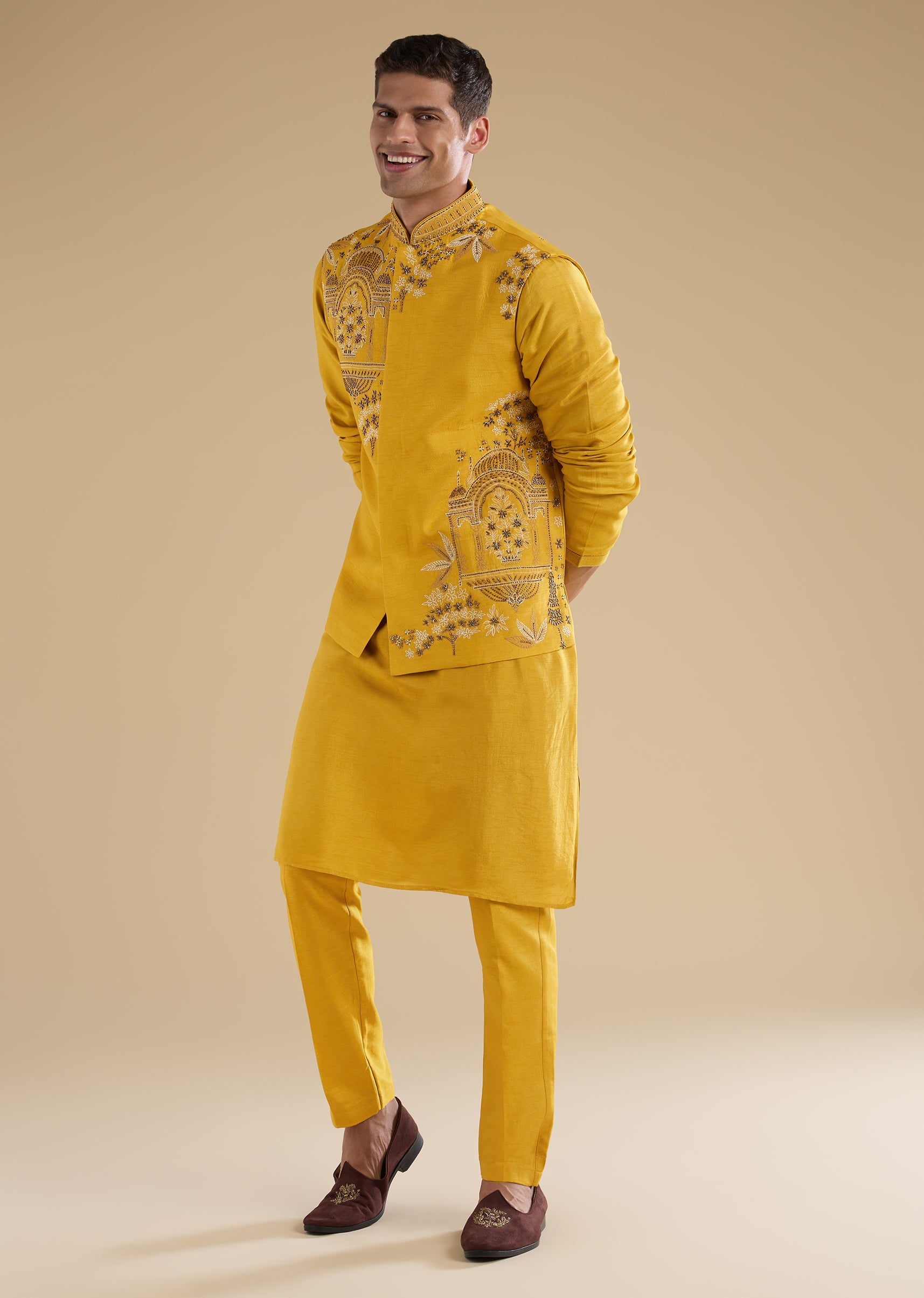 Bright and festive with refined detailing, this yellow kurta jacket set is crafted in smooth art silk for a celebratory look. The kurta features a mandarin collar, full sleeves, and side slits, paired with an embroidered jacket highlighted with resham thread and cut dana work for subtle elegance. Finished with straight-fit trousers and a partially elasticated waist, this set is ideal for weddings and mehendi celebrations. Awarded as the Most Trusted Brand, we're delivering styles you love, just as promised.