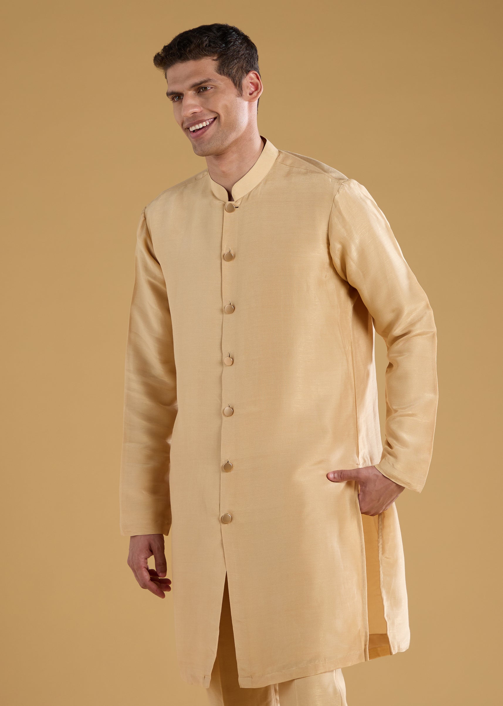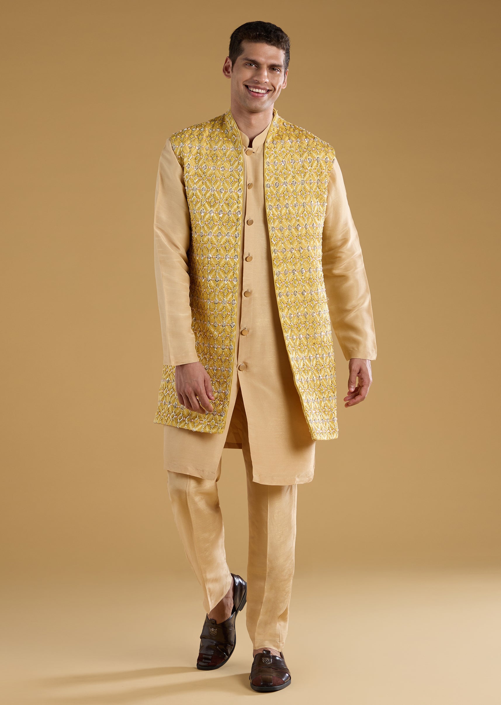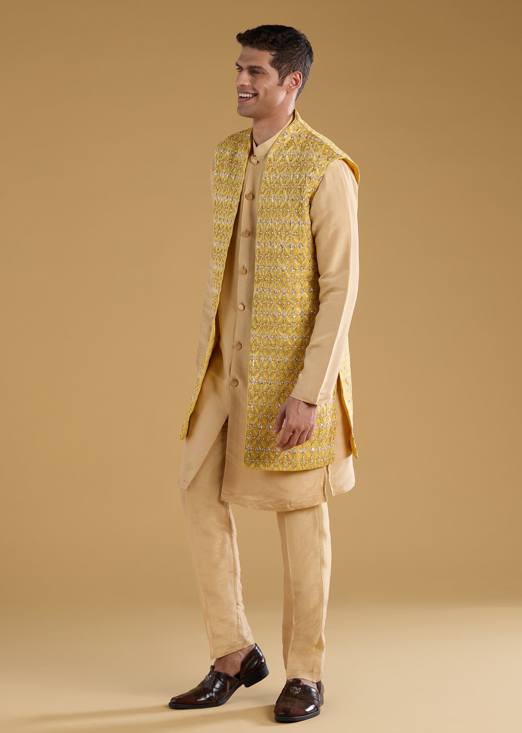 Yellow Jacquard Embroidered Jacket and Kurta Set
