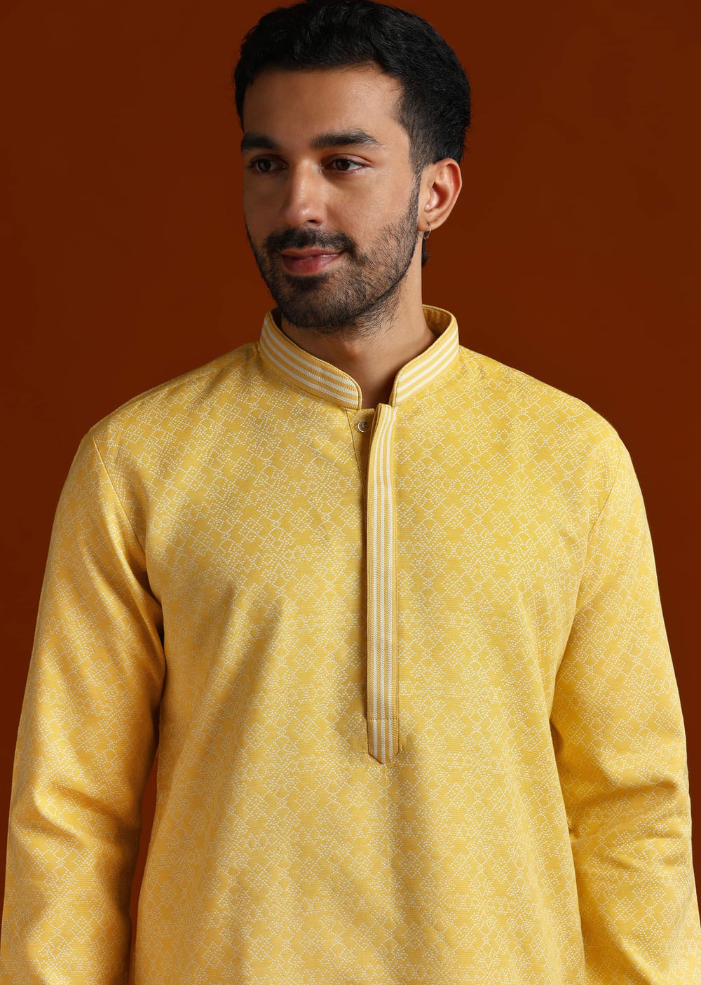 For haldi mornings and bright celebrations, this yellow jacquard men’s kurta set lays a soft print over a lively base. The texture gives the shade a gentle glow that photographs well in natural light. You feel cheerful, neat, and guest-ready. Awarded as the Most Trusted Brand, we're delivering styles you love, just as promised.