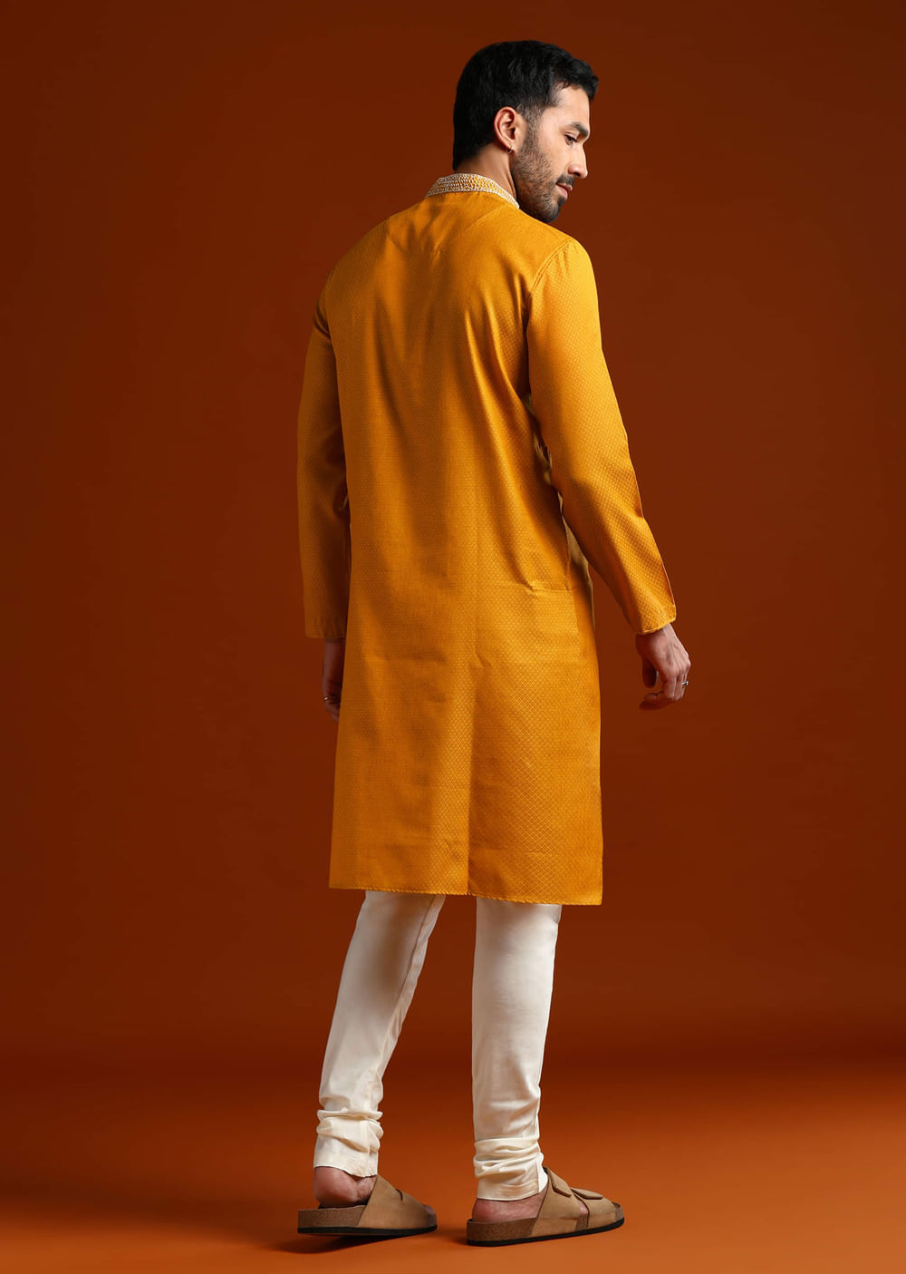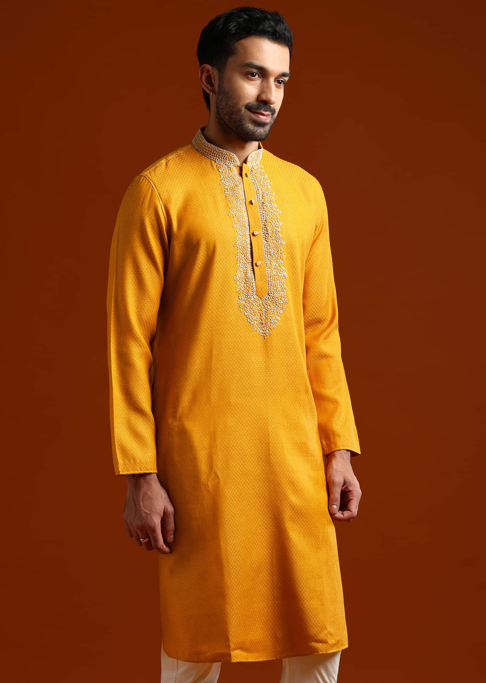 Pair with brown kolhapuris and a slim kada for a clean daytime finish.