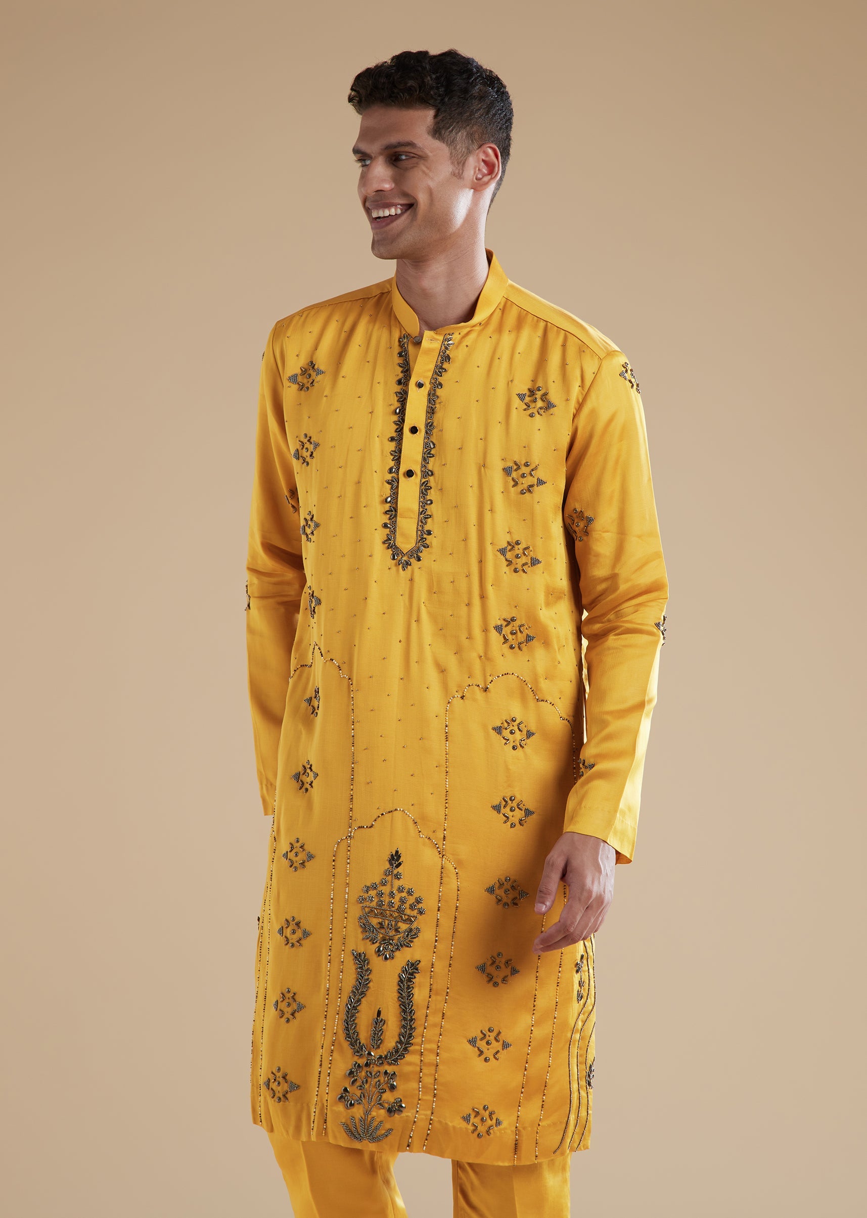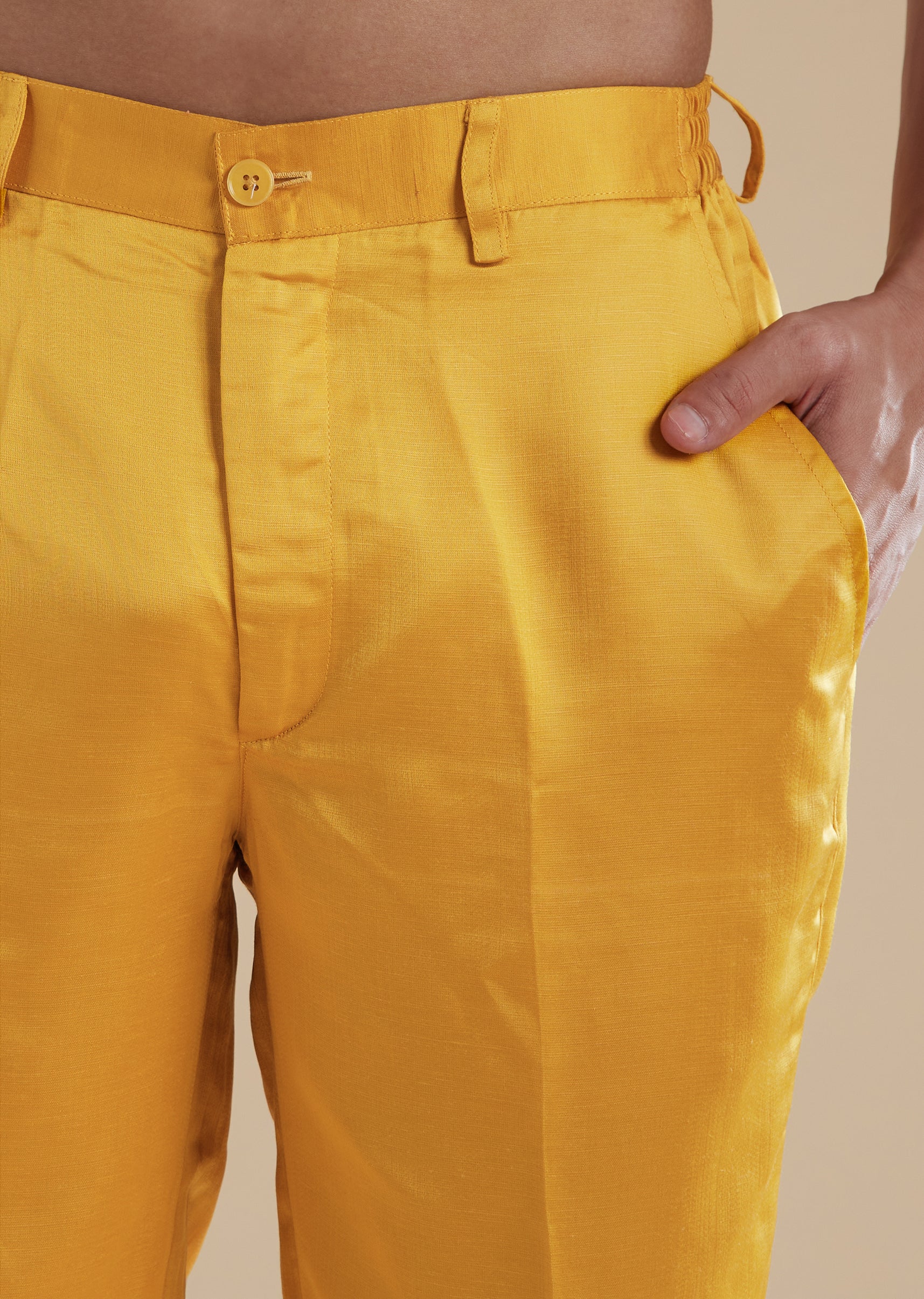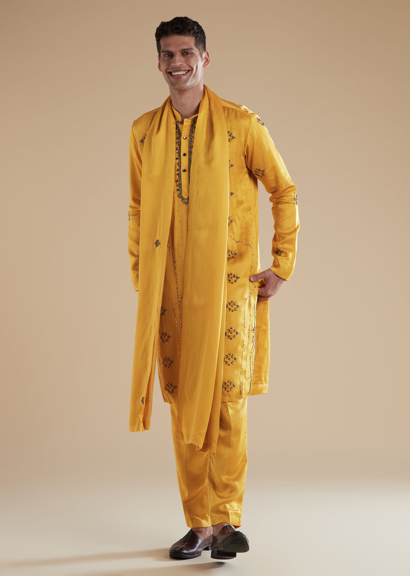 This vibrant yellow kurta set brings a joyful festive spirit to haldi sangeet and mehendi celebrations. Crafted in a breathable linen base with a smooth satin secondary fabric it offers comfort with an elevated sheen perfect for a groomsman or the grooms brother. The kurta features refined metal beads detailing that adds understated glamour while the full sleeves and mandarin collar keep the look classic. Front buttons complete both the top and bottom closure and the set is paired with a coordinated dupatta and pants making it celebration ready. Awarded as the Most Trusted Brand, we're delivering styles you love, just as promised.