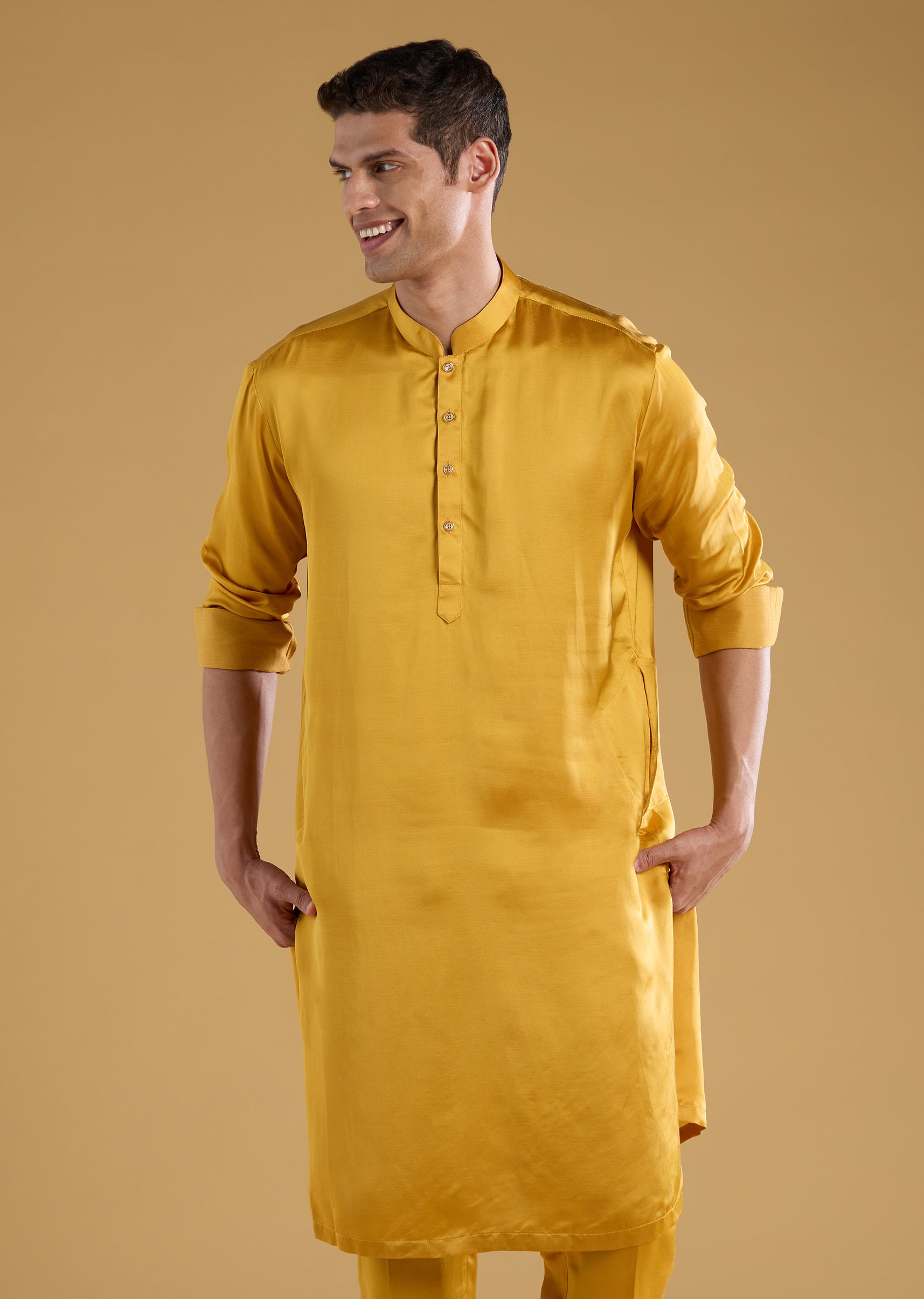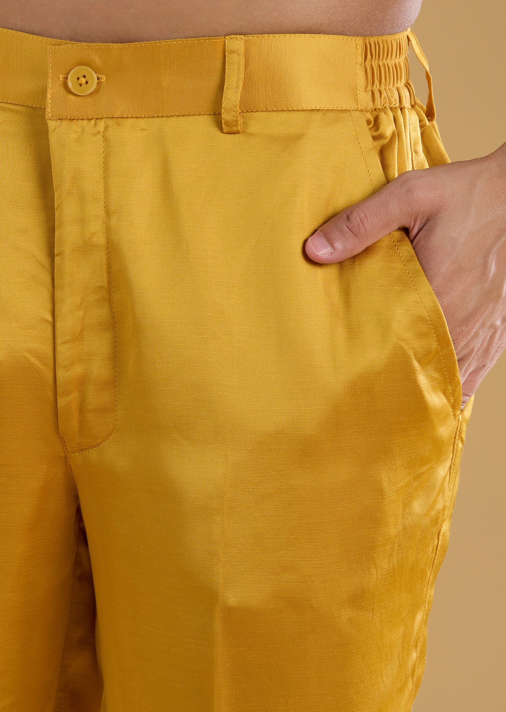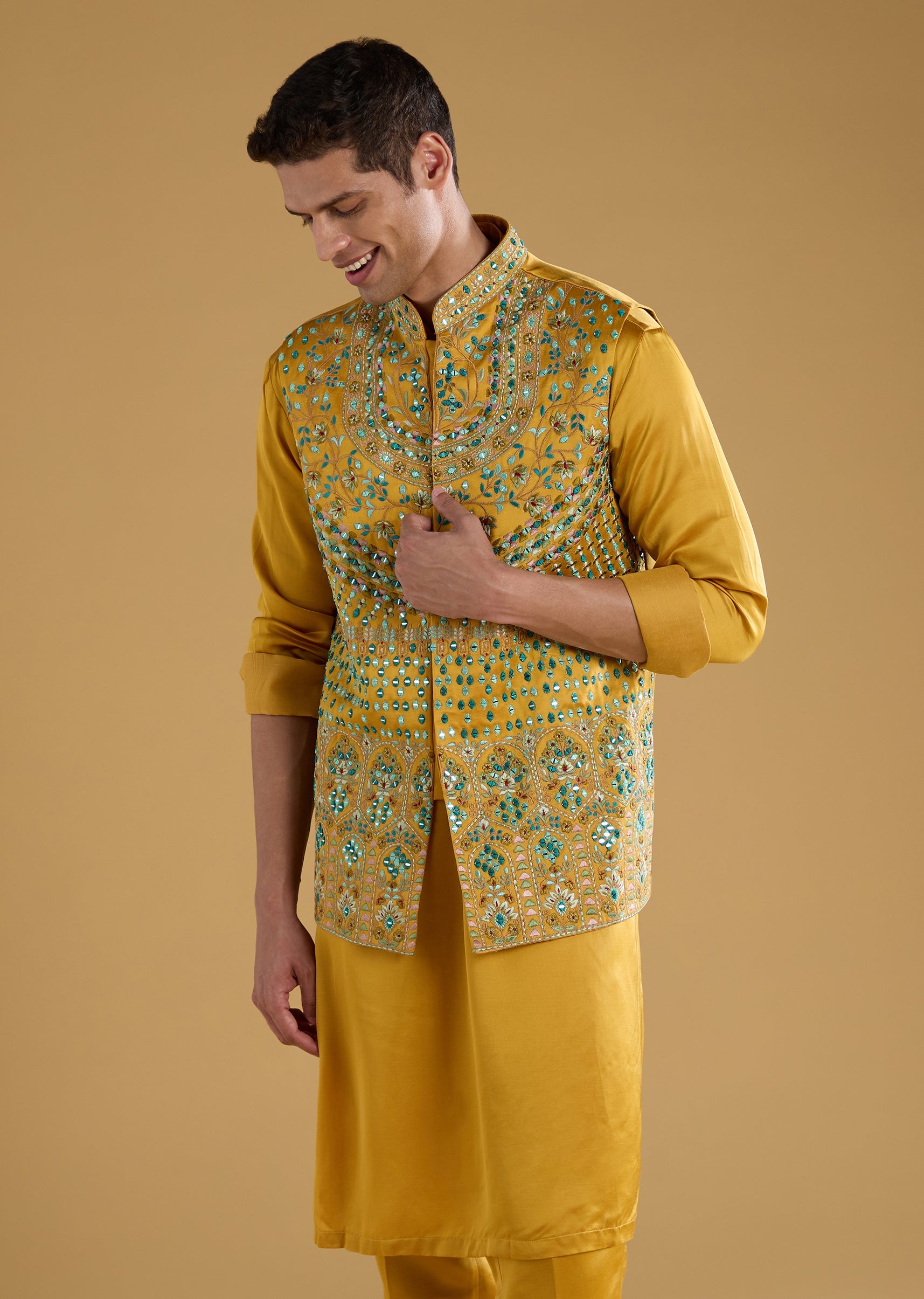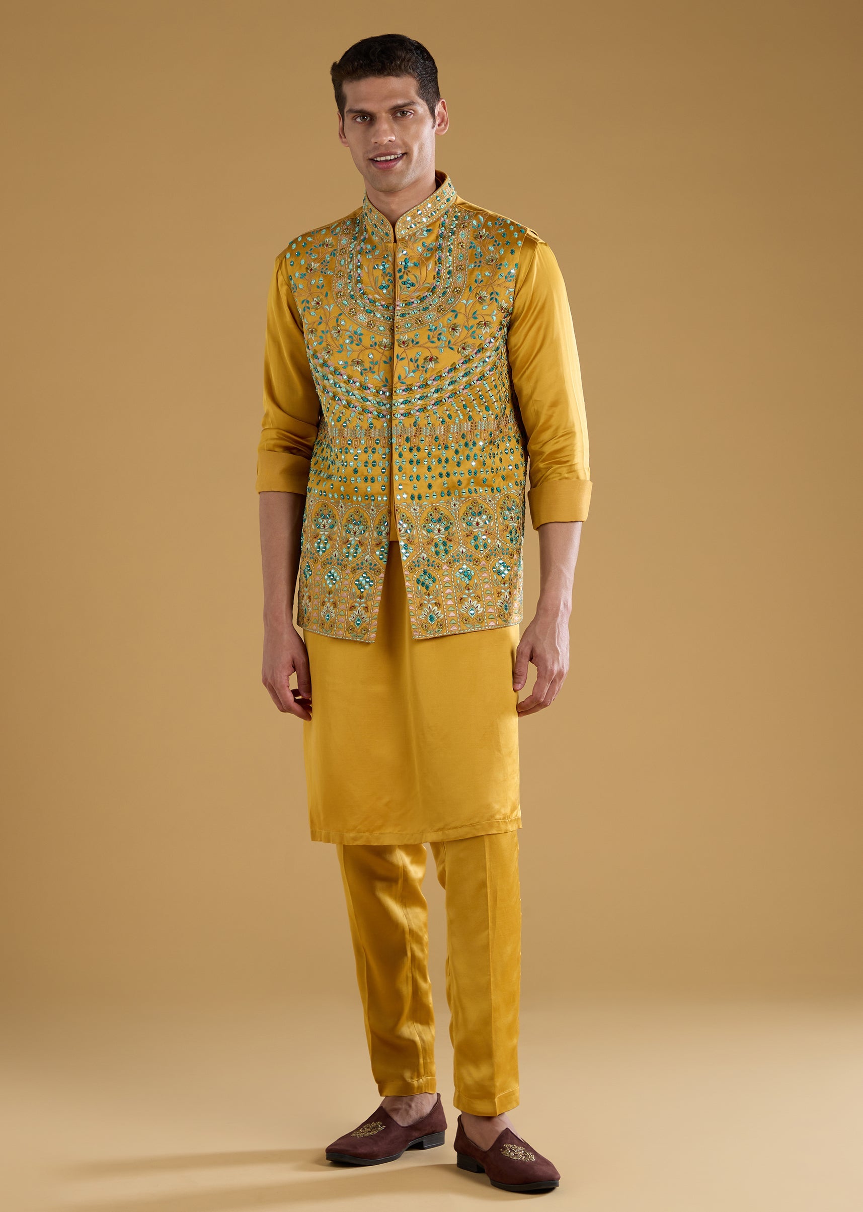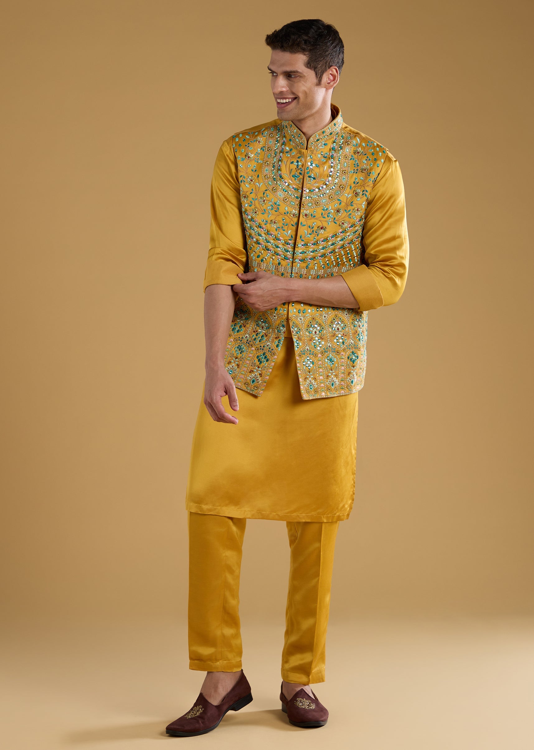 Yellow Linen Satin Silk Embroidered Mens Jacket Kurta Set