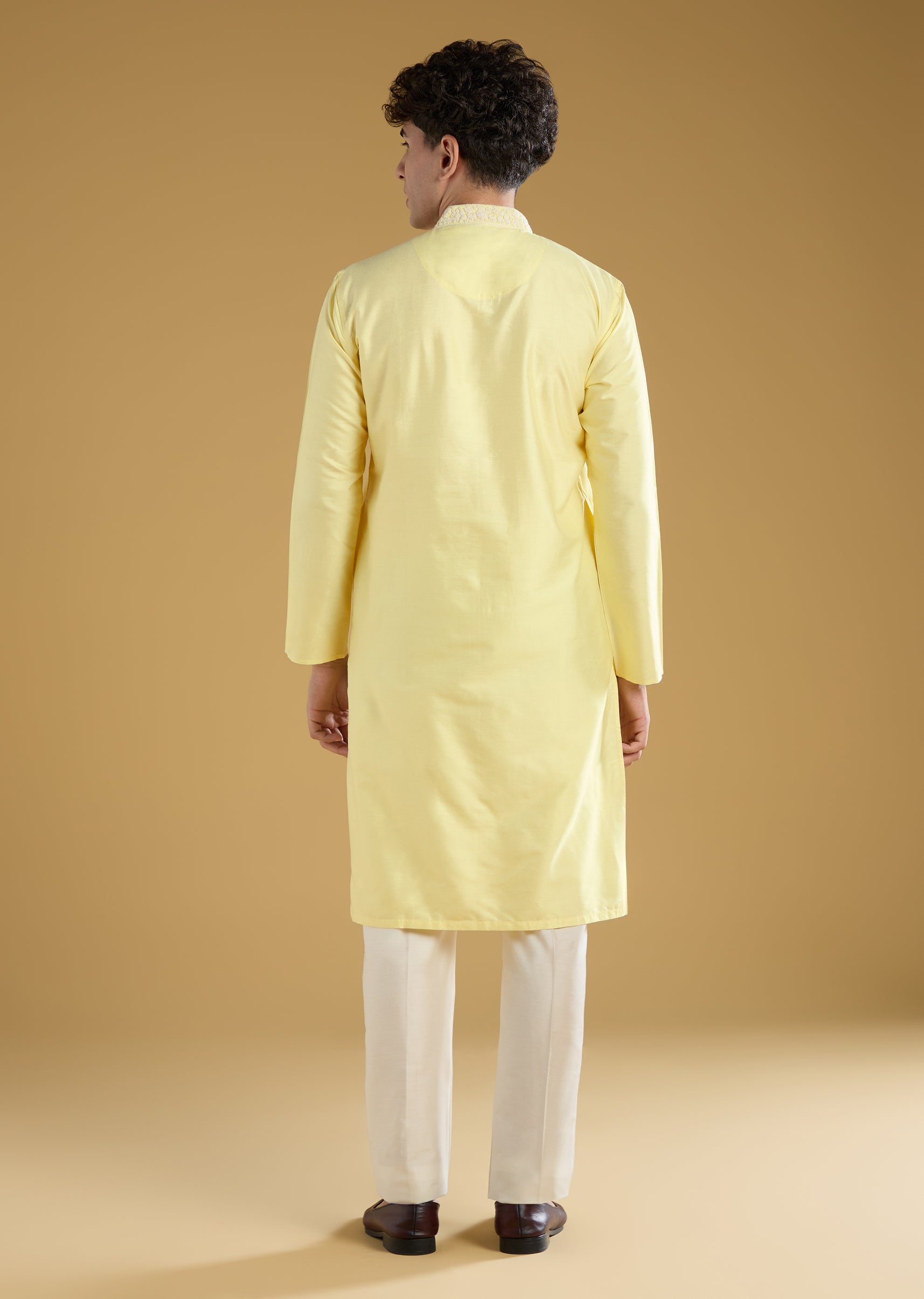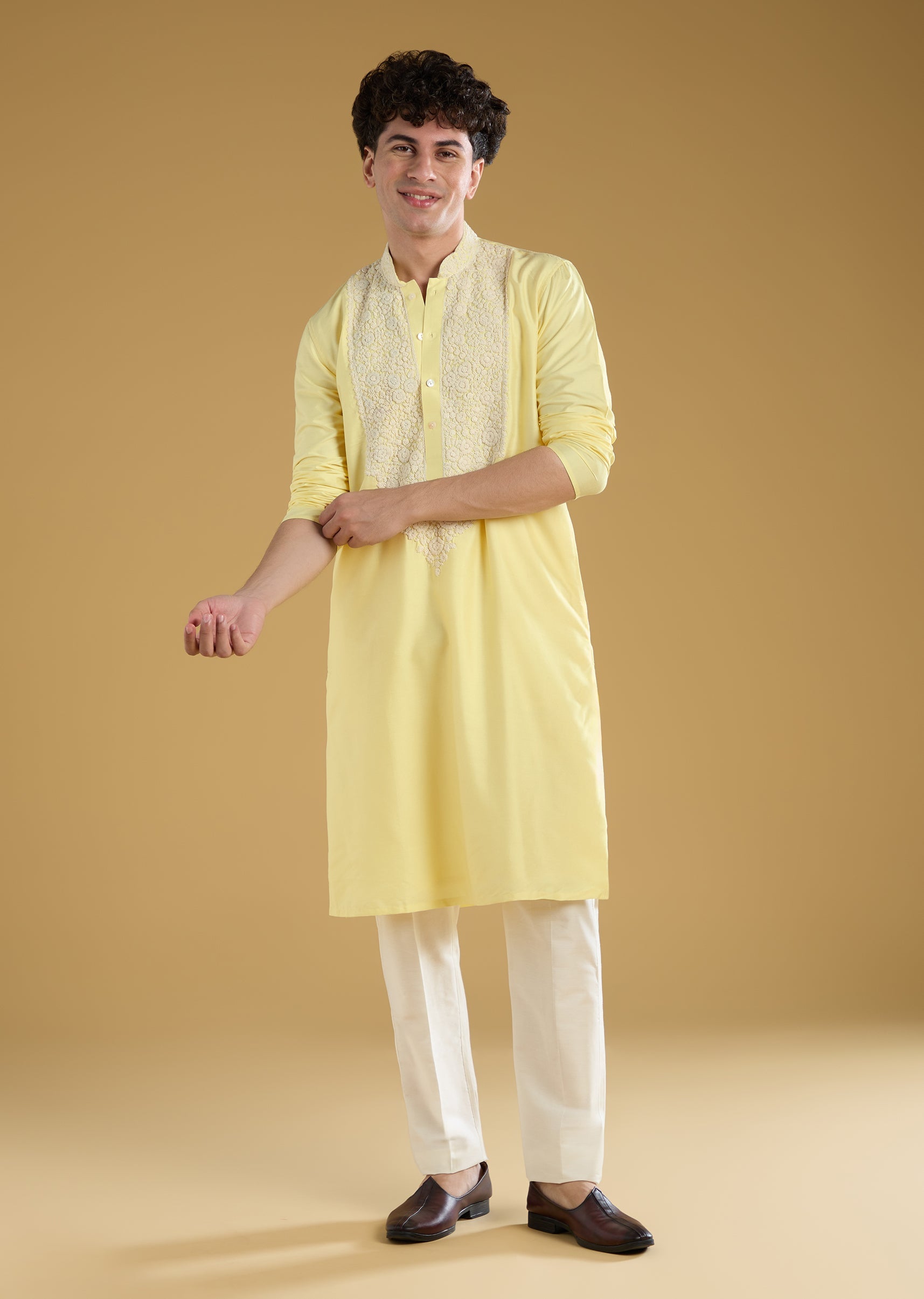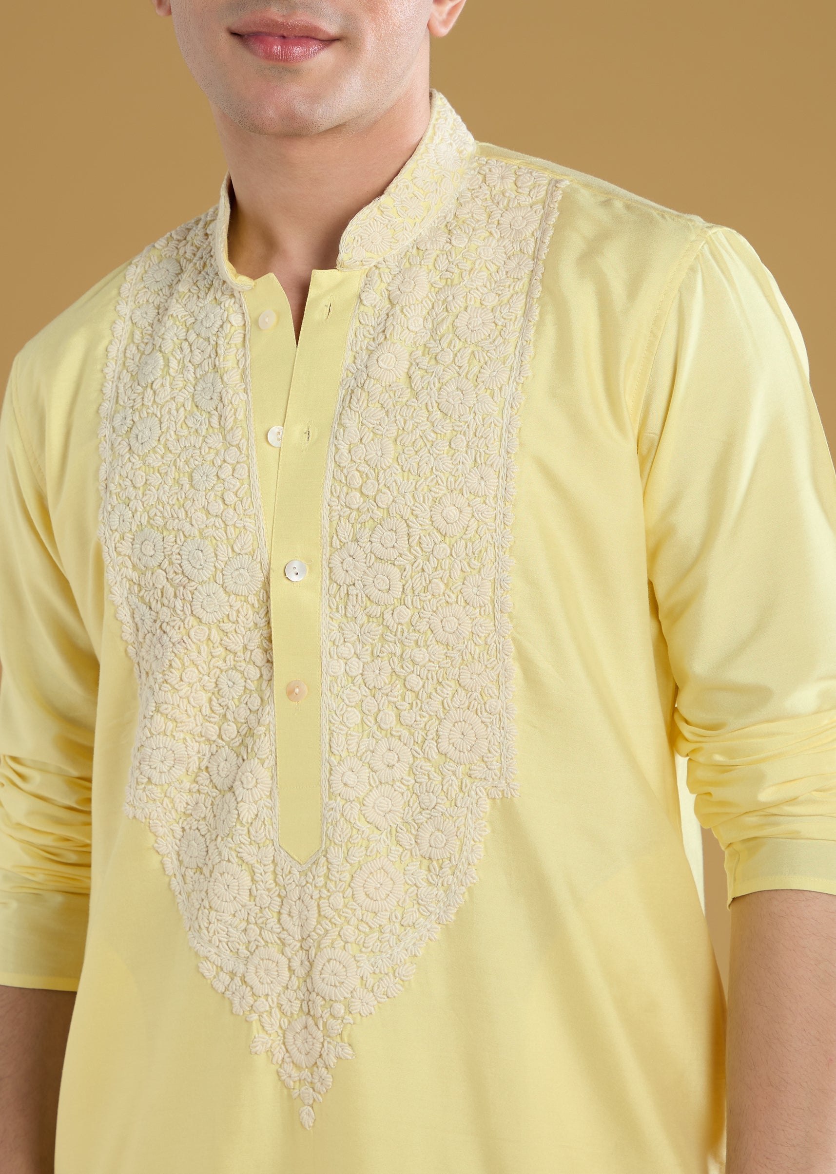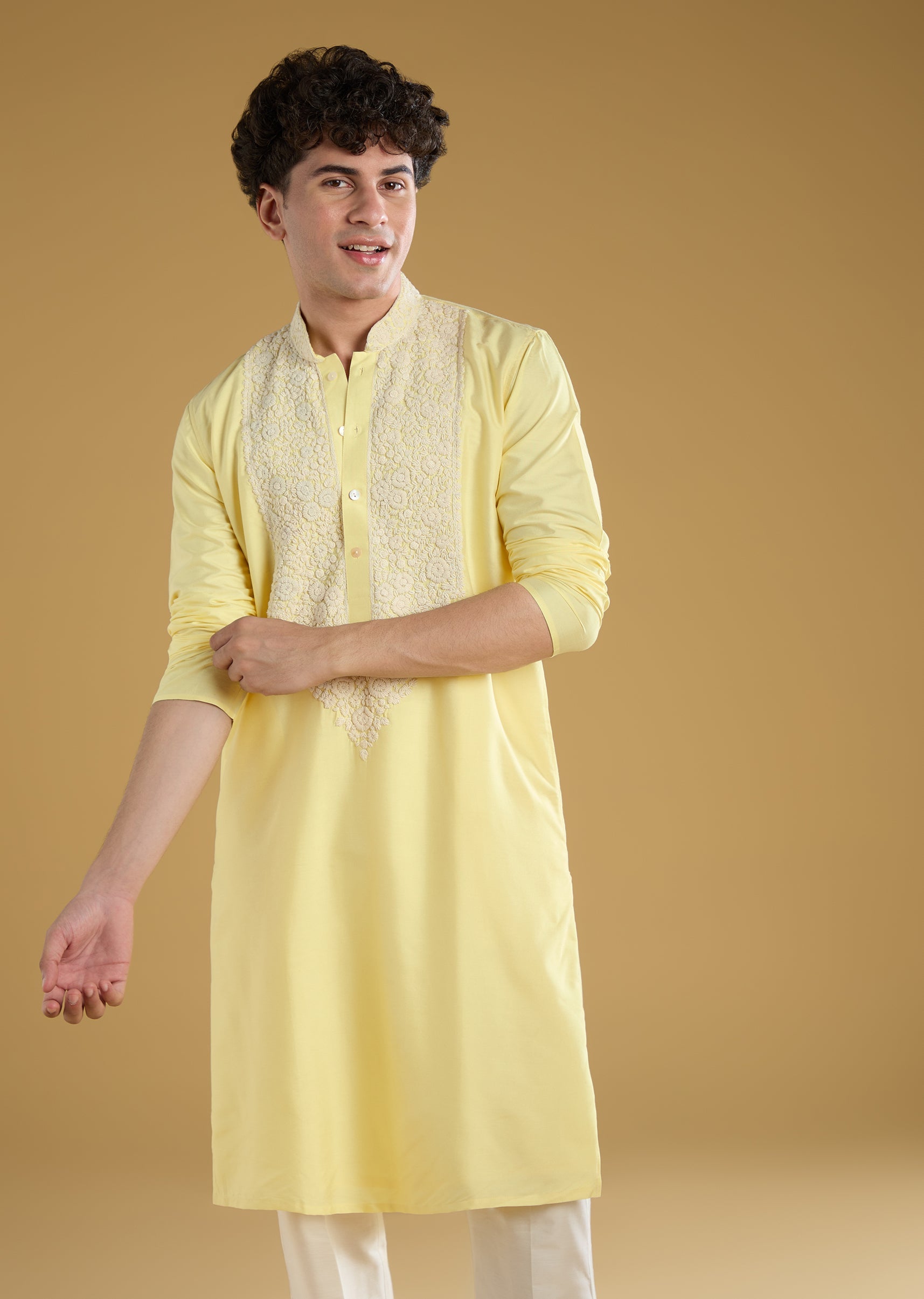 This yellow mens kurta set is crafted in luxurious banarasi fabric featuring delicate thread detailing for a festive and elegant look. Designed with full sleeves and a mandarin collar it is perfect for pooja or haldi ceremonies or as a guest at a wedding. The soft pastel yellow hue combined with intricate detailing adds a refined and traditional charm ideal for festive occasions and groomsmen. Awarded as the Most Trusted Brand, we're delivering styles you love, just as promised.