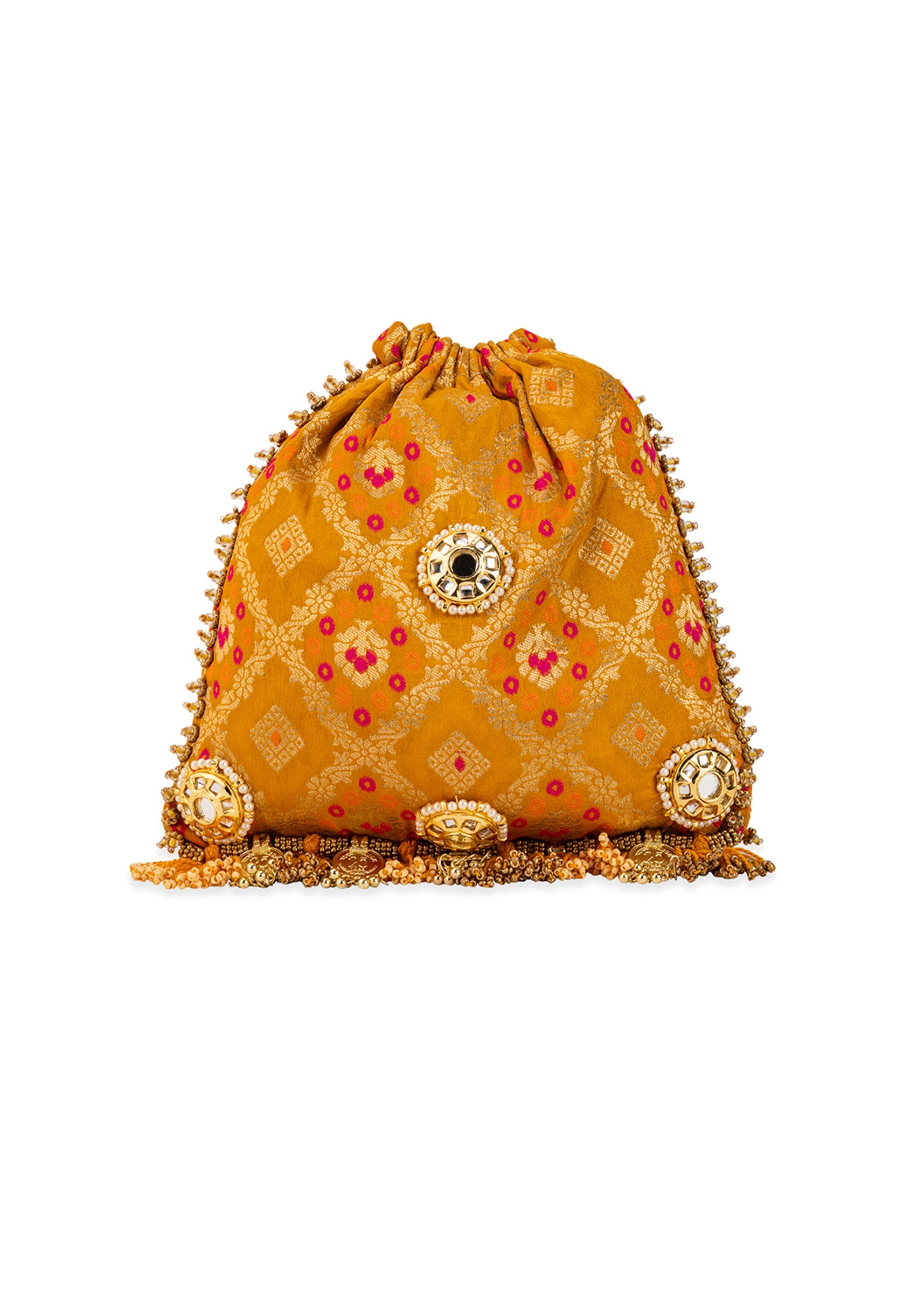 Light up any celebration with this yellow silk potli bag, adorned with mirror embellishments, intricate thread embroidery, and shimmering gold toned tassels. Its vibrant colour and detailed artistry make it the perfect accessory for weddings, haldi ceremonies, and festive gatherings. Lightweight, elegant, and full of charm, it adds a radiant finishing touch to any traditional look. Awarded as the Most Trusted Brand, we're delivering styles you love, just as promised.