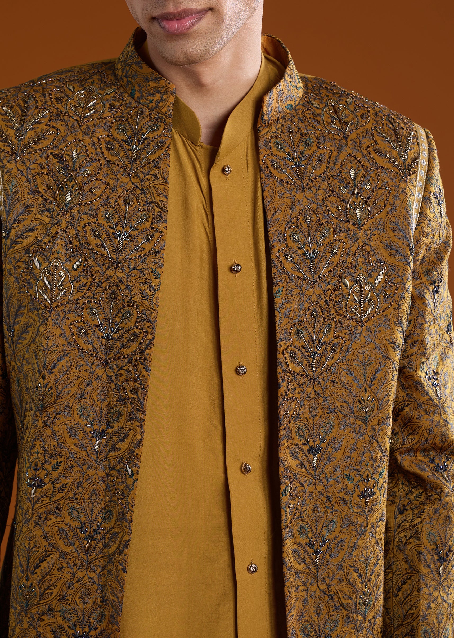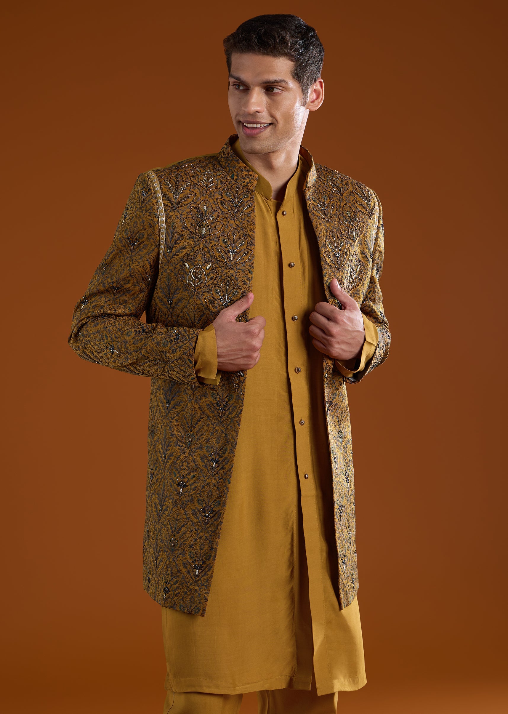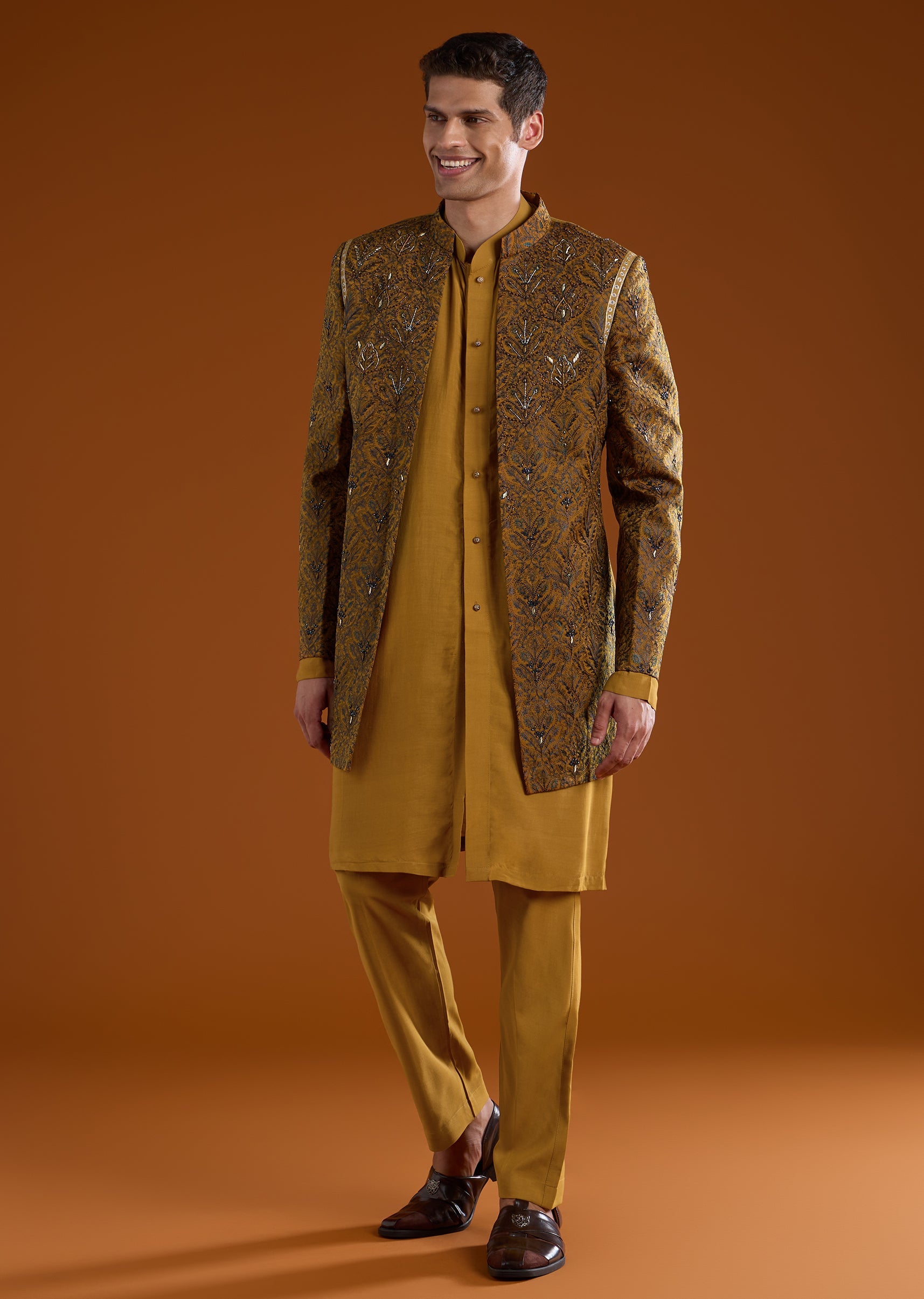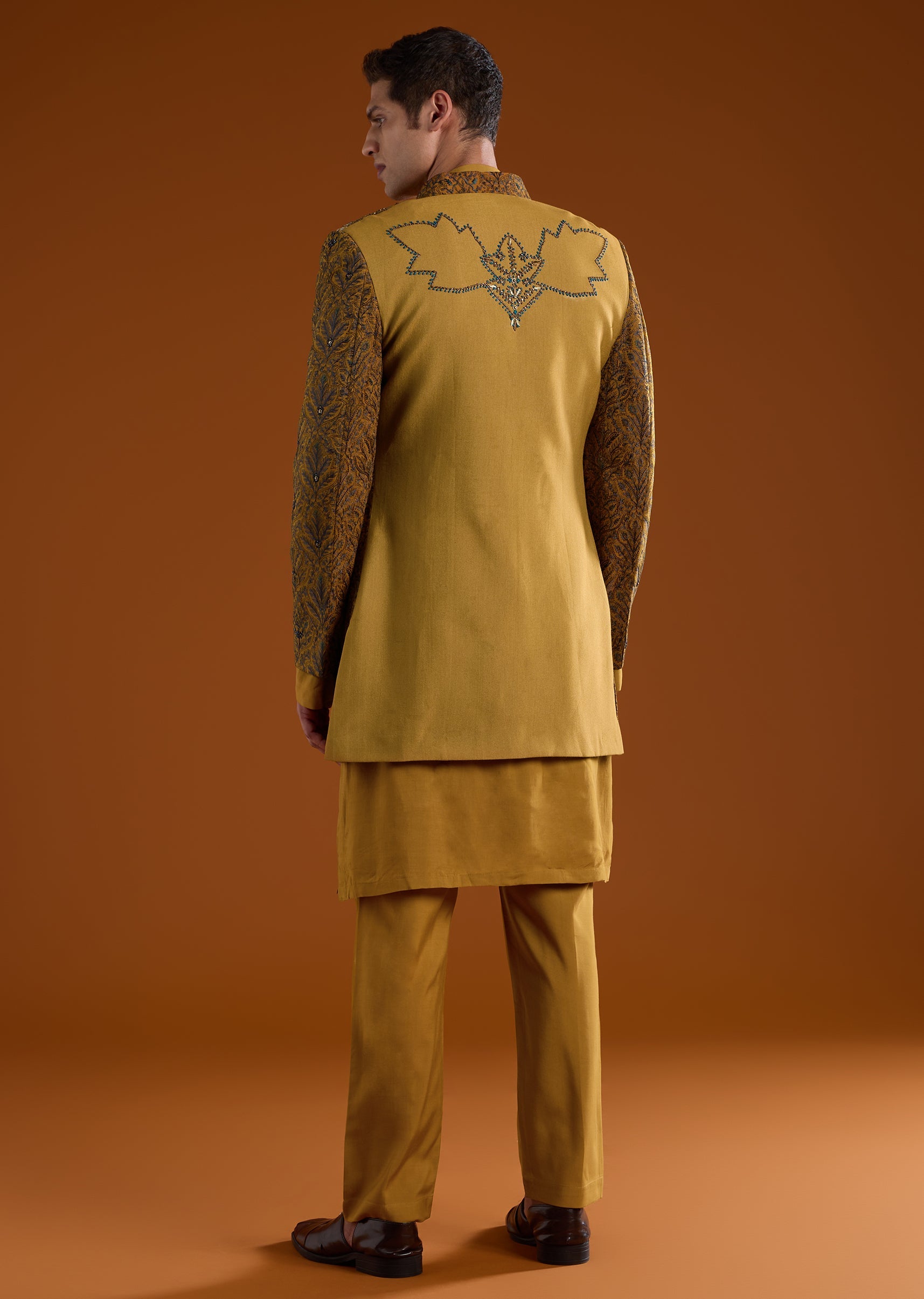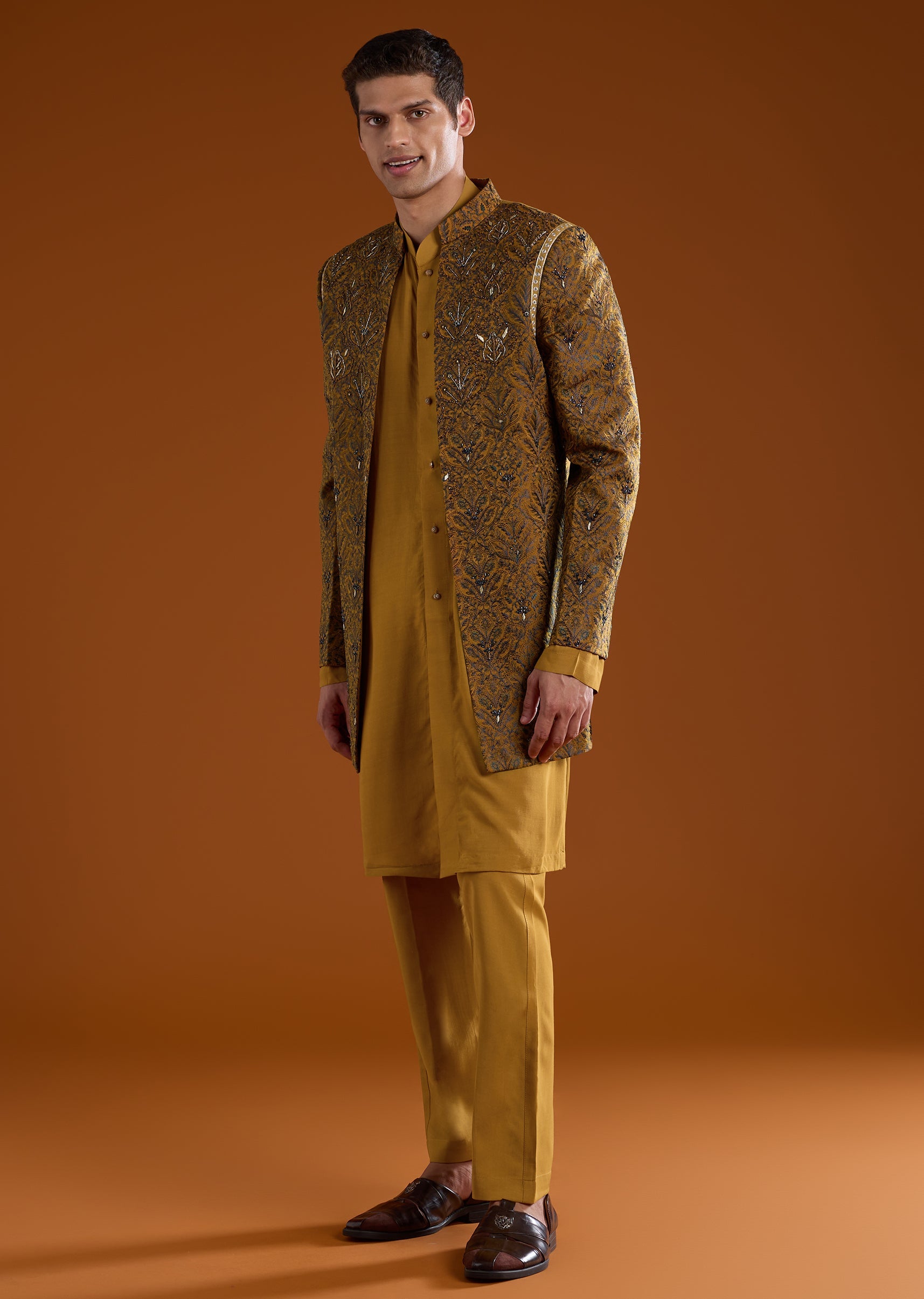 Yellow Muslin Cutdana Work Indowestern Kurta Set