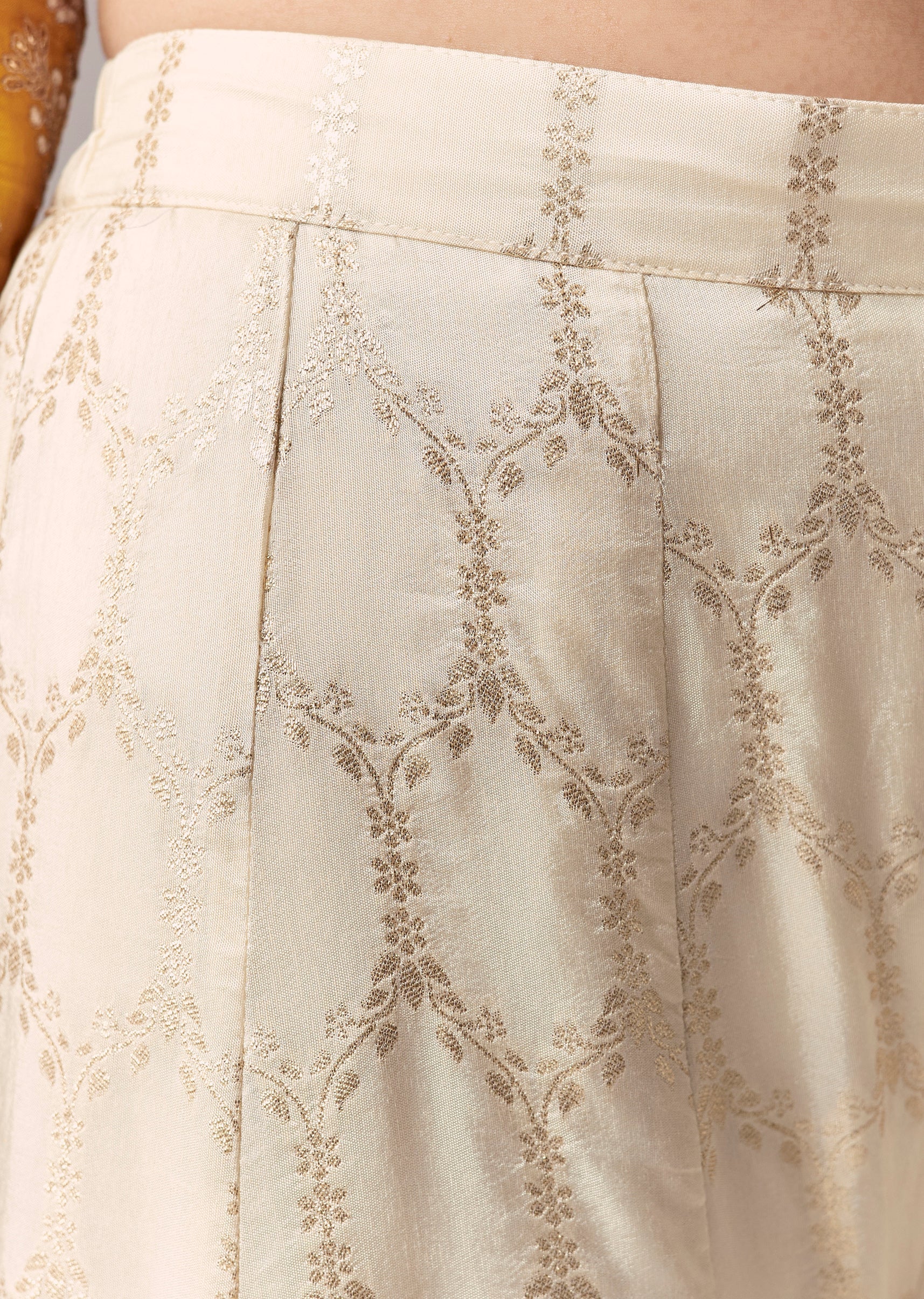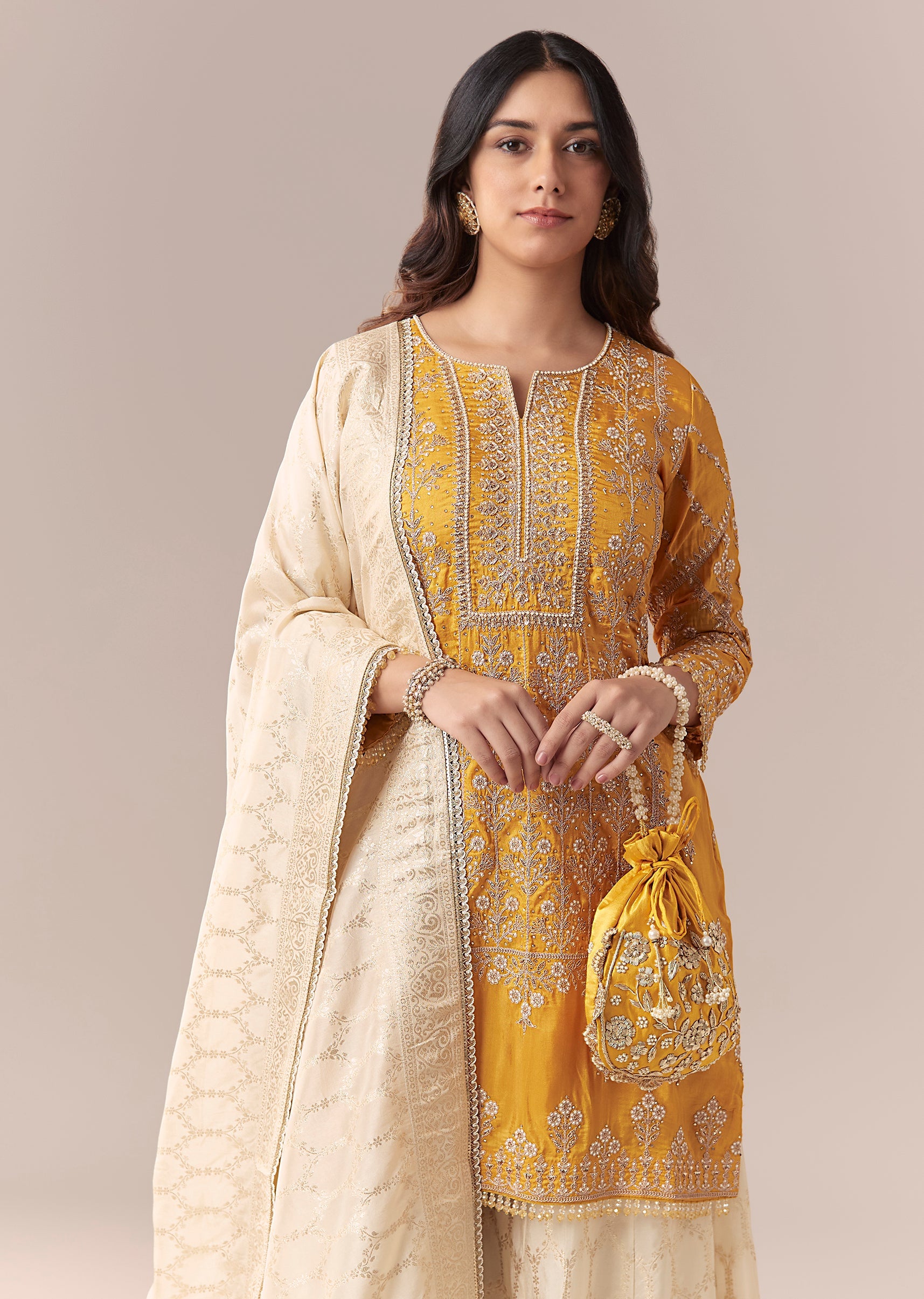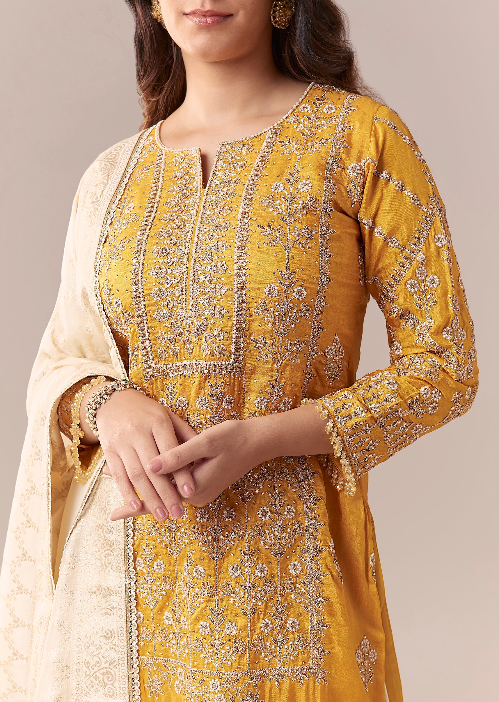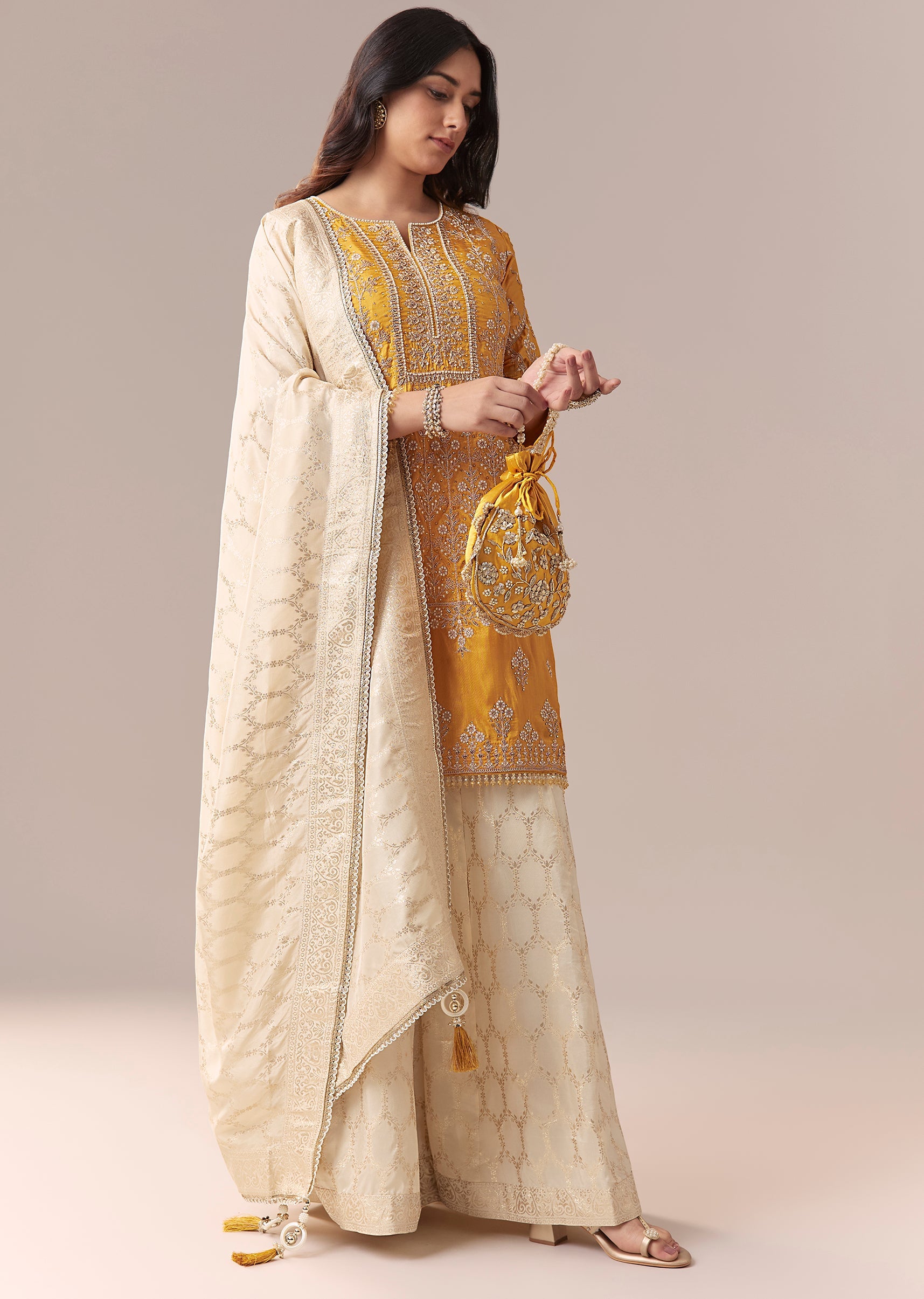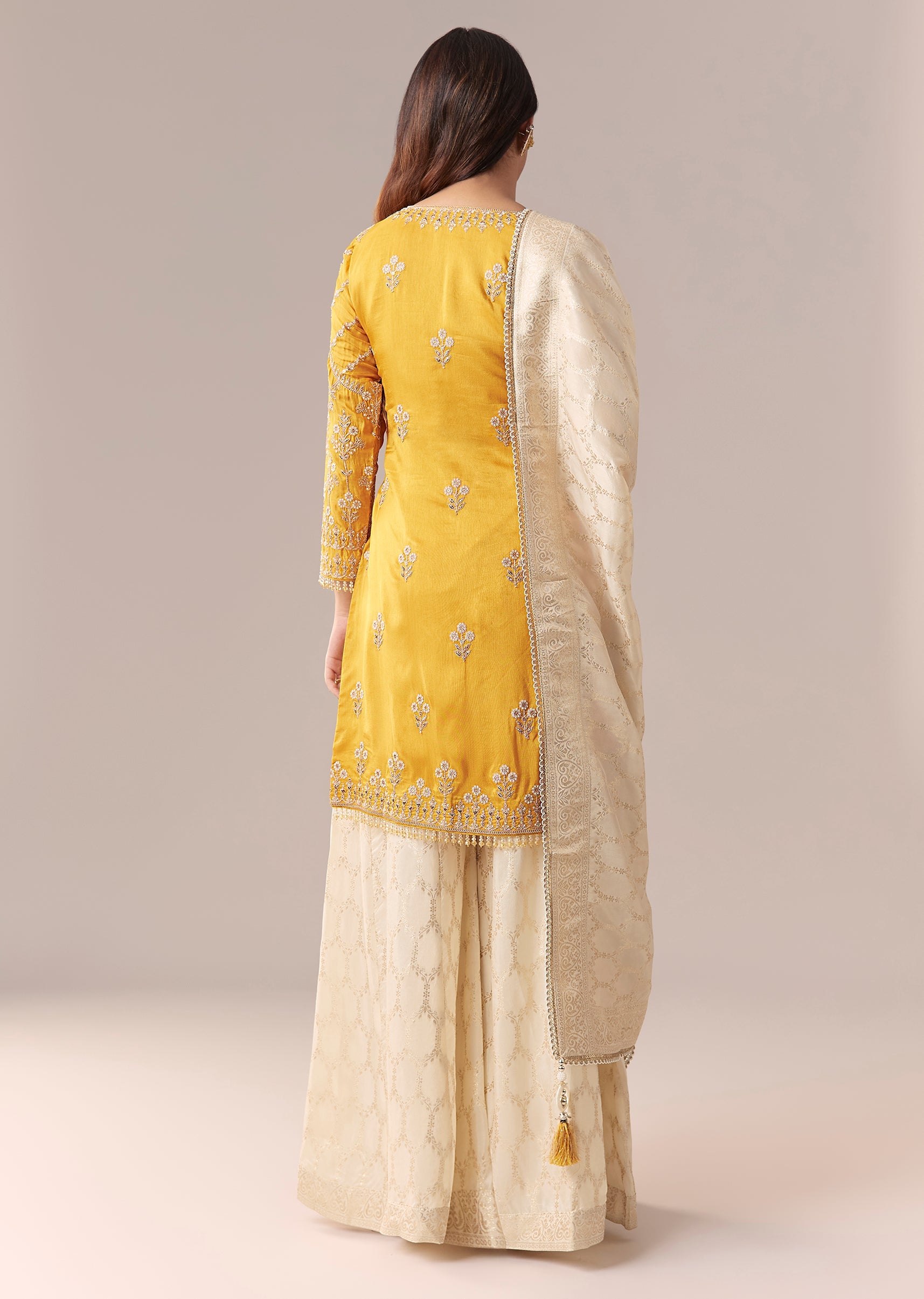 Yellow Off White Embroidered Palazzo Suit Set With Dupatta
