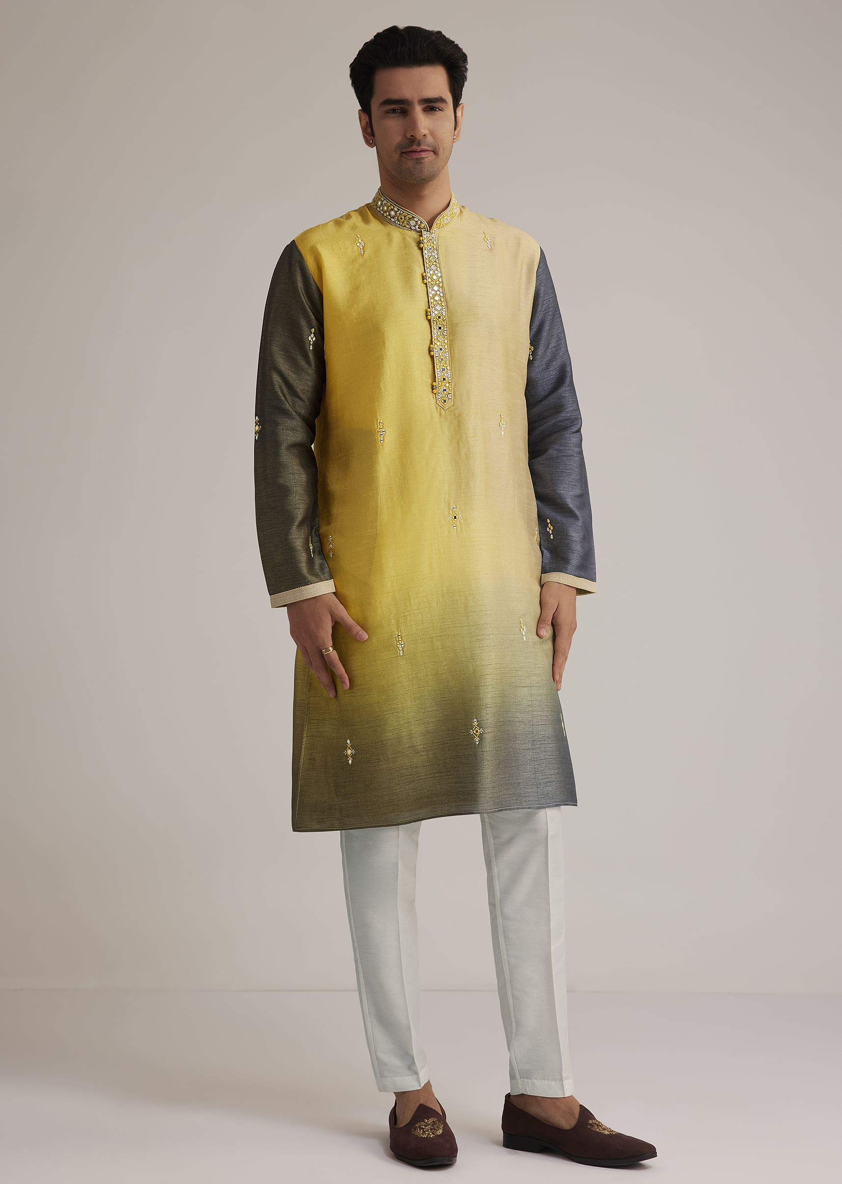 - Make A Striking Impression With This Yellow Ombre Silk Kurta Set, Transitioning Seamlessly Into Darker Tones On The Sleeves For A Bold Yet Elegant Look.