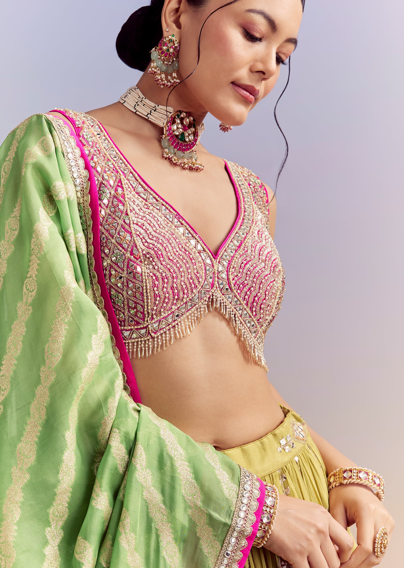 Fit Tips:The blouse should feel comfortably set with clean arm movement, and the lehenga should hug the waist lightly with an airy, effortless flare.