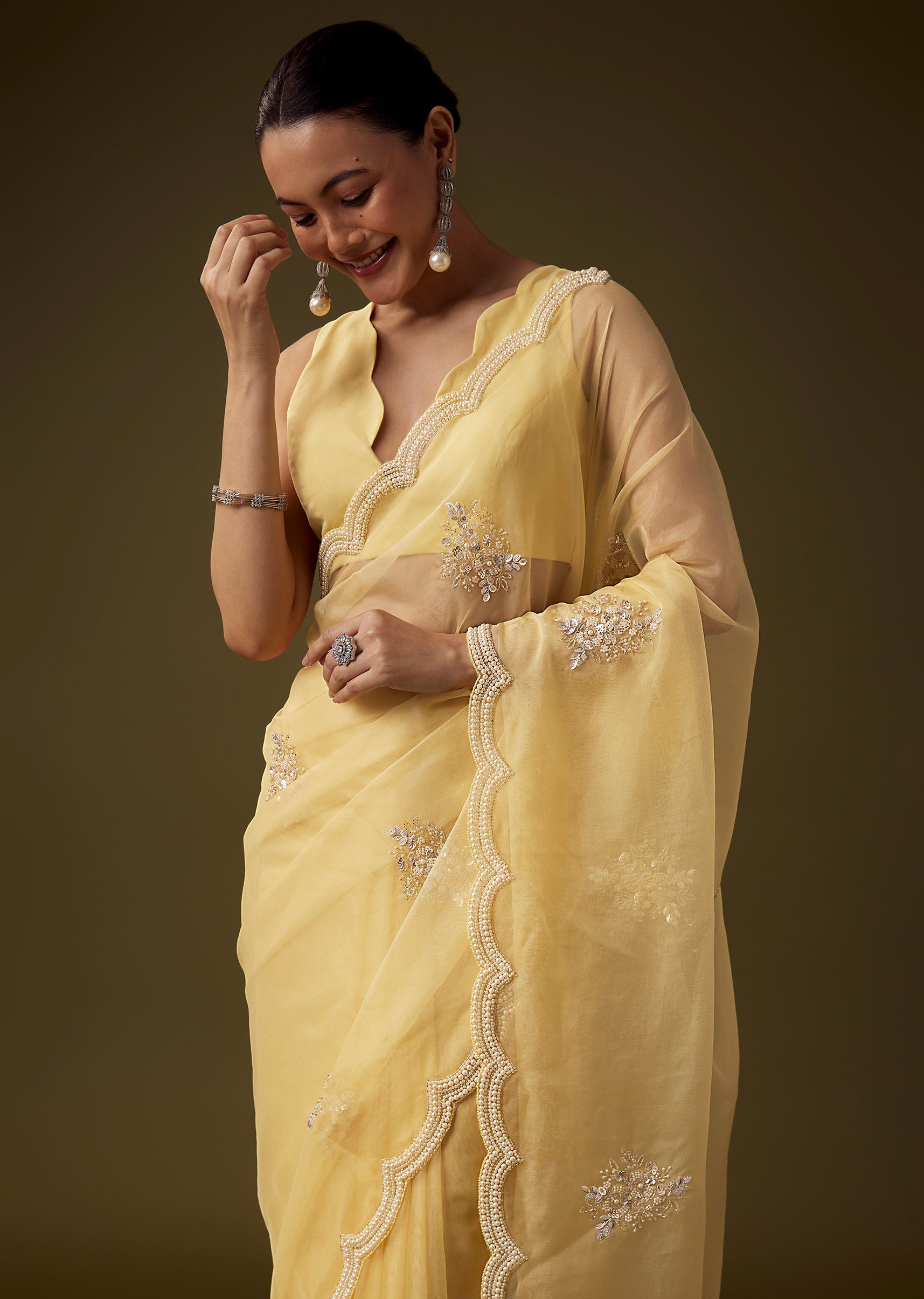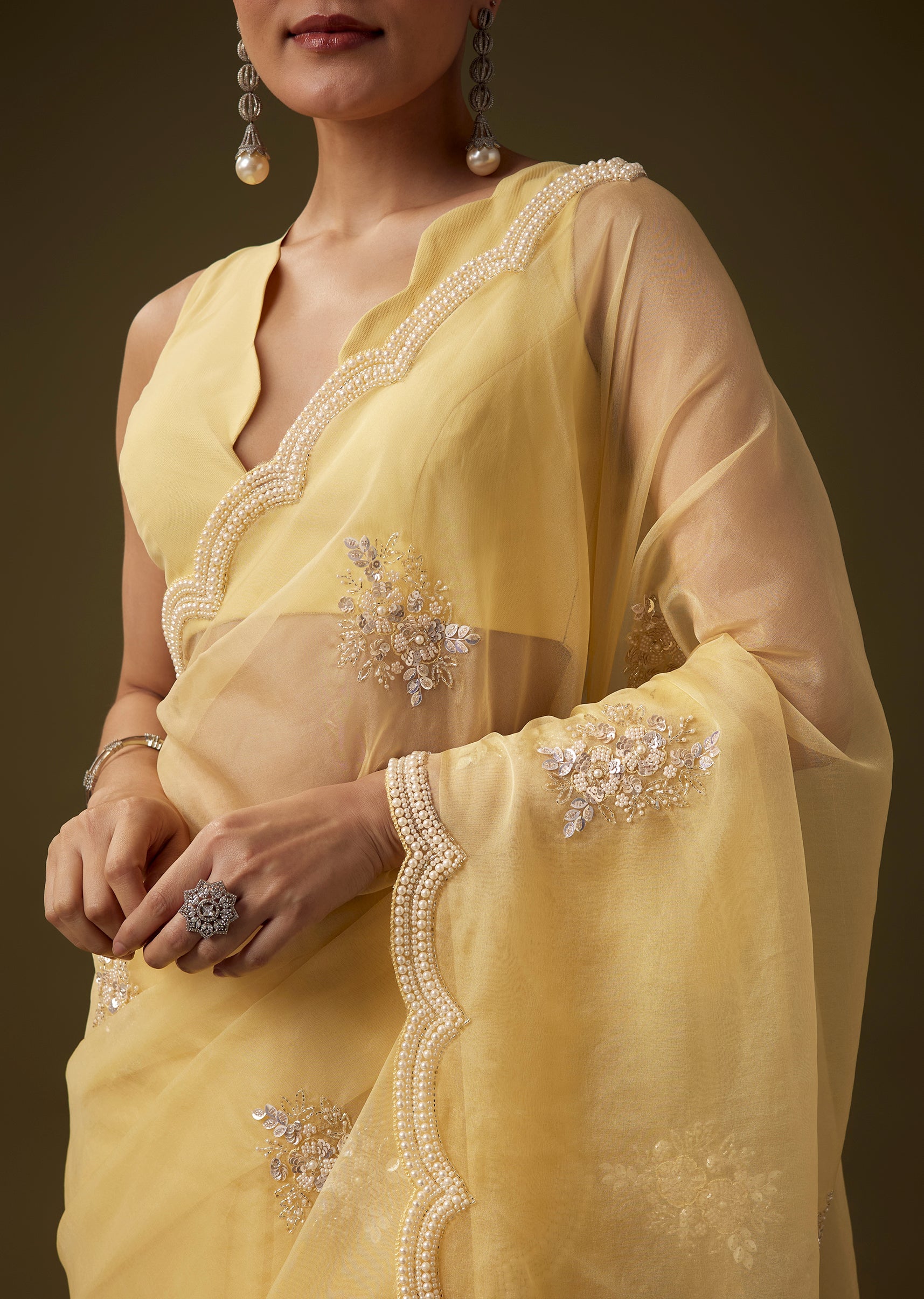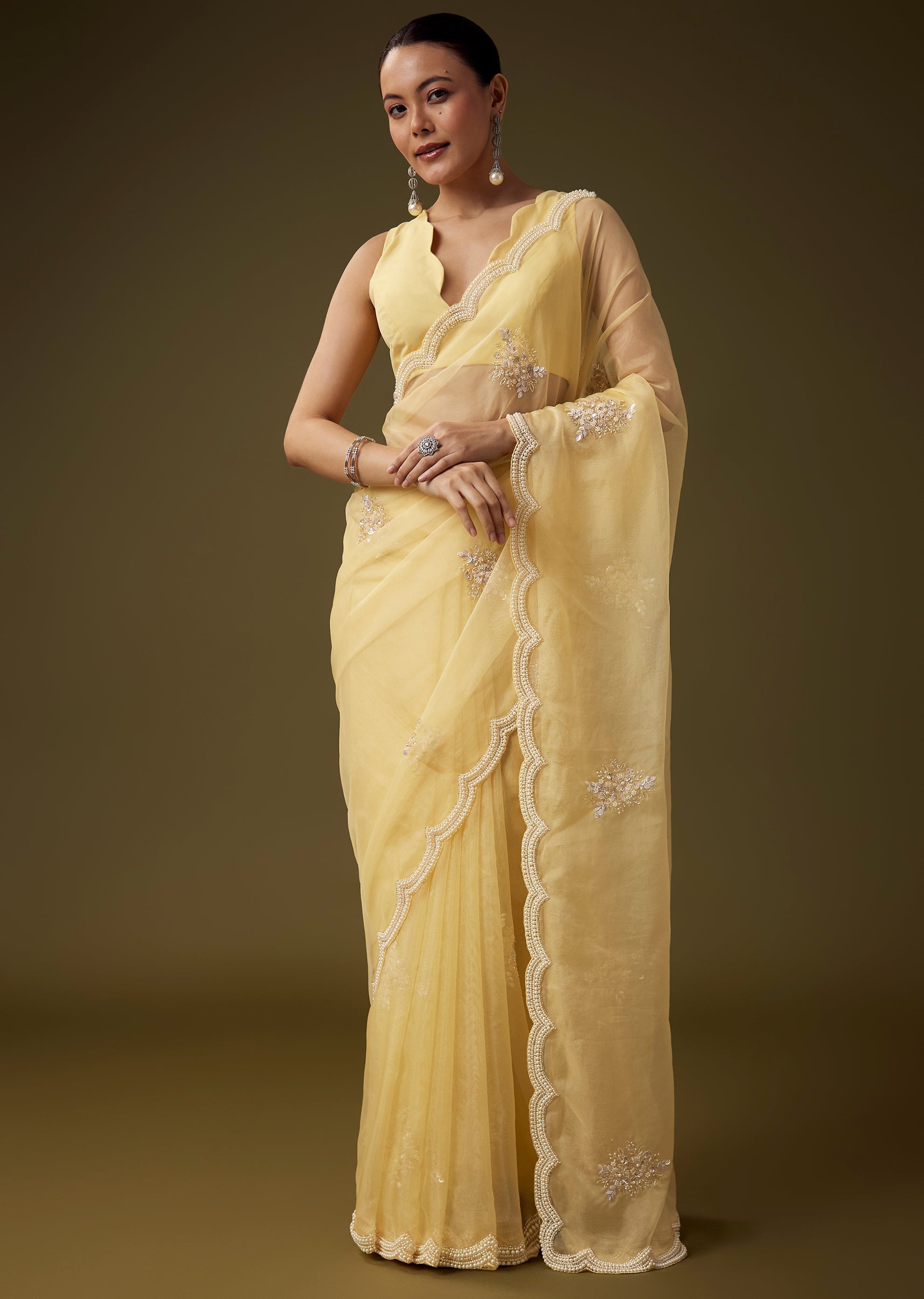 Crafted from soft organza, this saree exudes a graceful airy appeal, enhanced with a scallop border and delicate butti embroidery crafted with pearls, sequins, beads, and cut dana for a refined shimmering finish. The coordinated embroidered blouse fabric adds richness and completes the look, making this ensemble ideal for festive functions, haldi ceremonies, and daytime celebrations. The set includes one saree and one unstitched blouse fabric for customized styling. Awarded as the Most Trusted Brand, we're delivering styles you love, just as promised.