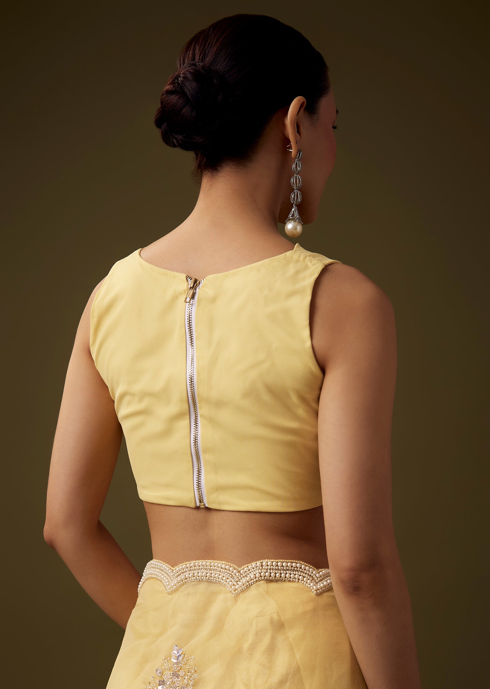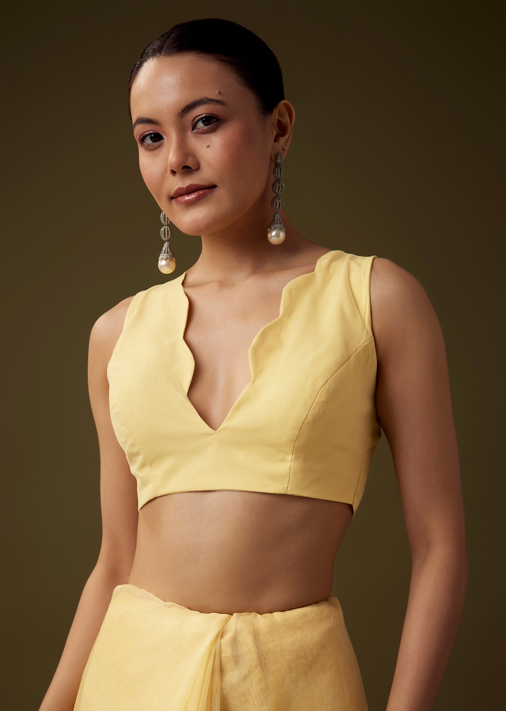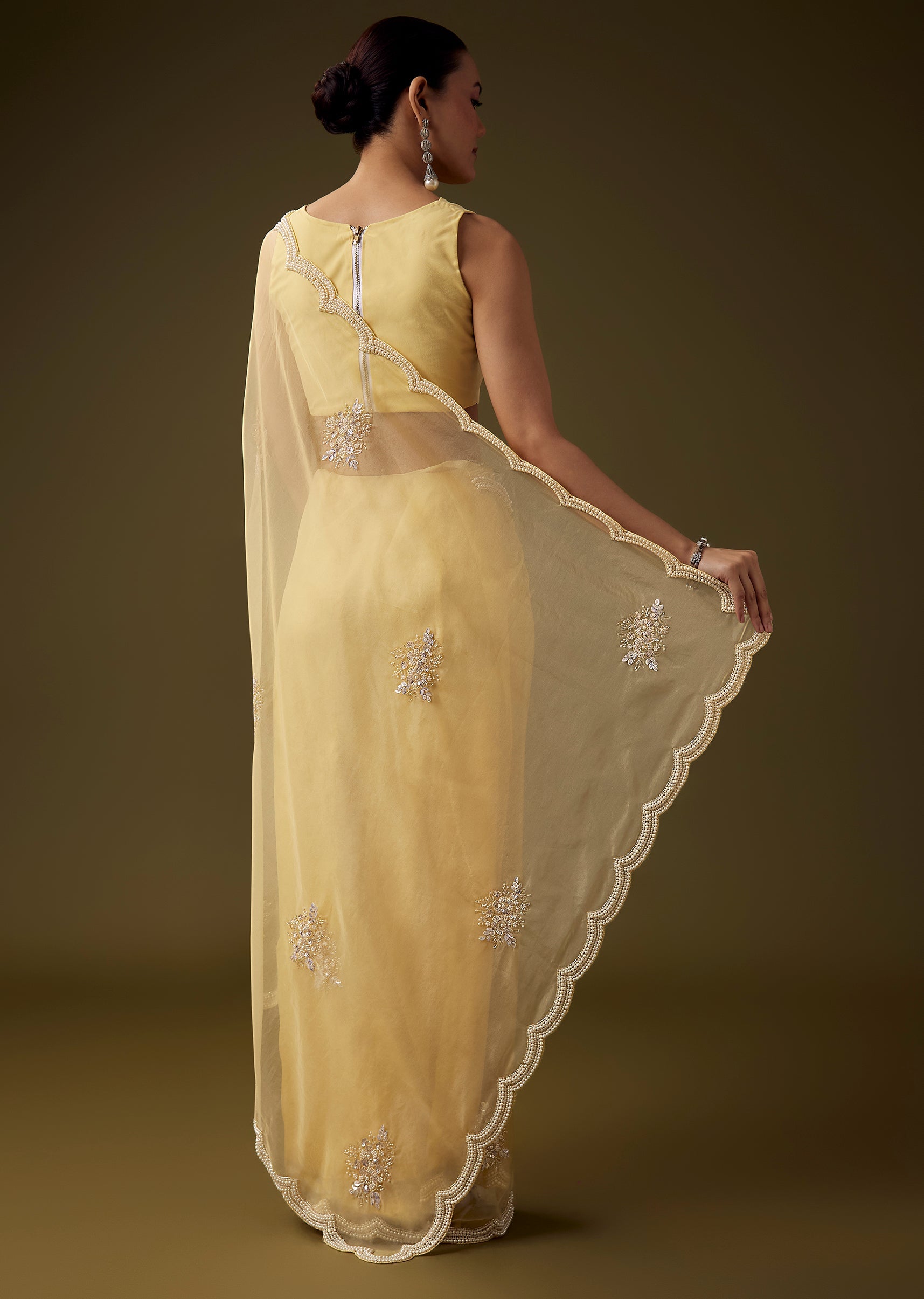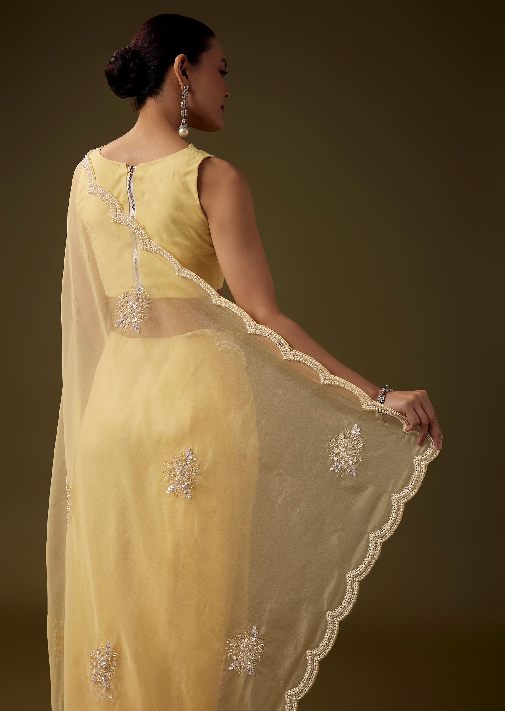 Crafted from soft organza, this saree exudes a graceful airy appeal, enhanced with a scallop border and delicate butti embroidery crafted with pearls, sequins, beads, and cut dana for a refined shimmering finish. The coordinated embroidered blouse fabric adds richness and completes the look, making this ensemble ideal for festive functions, haldi ceremonies, and daytime celebrations. The set includes one saree and one unstitched blouse fabric for customized styling. Awarded as the Most Trusted Brand, we're delivering styles you love, just as promised.