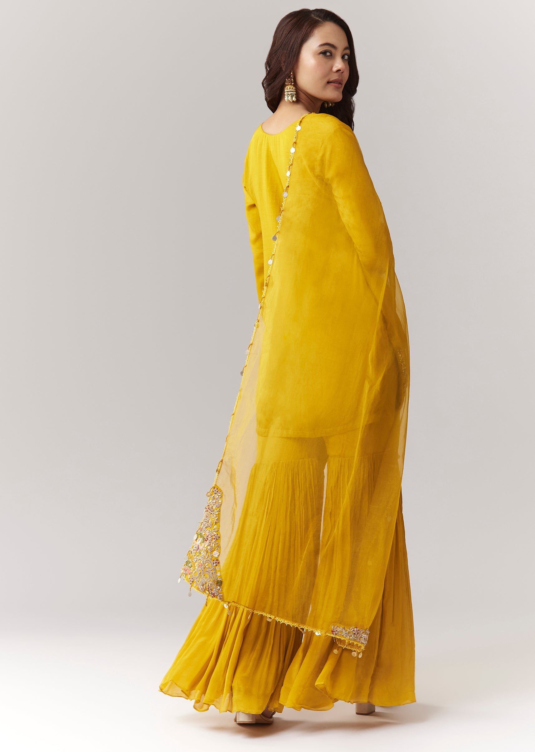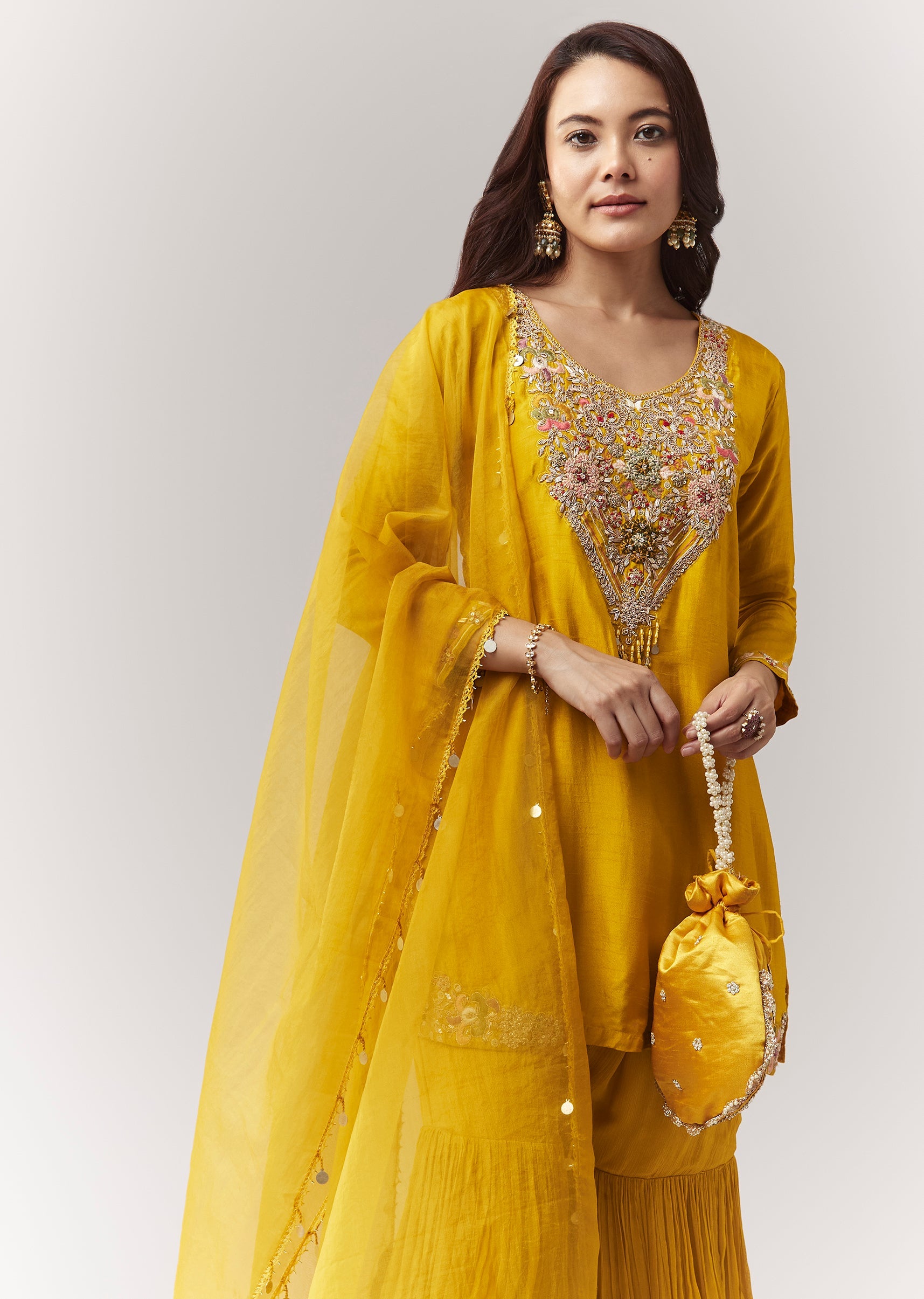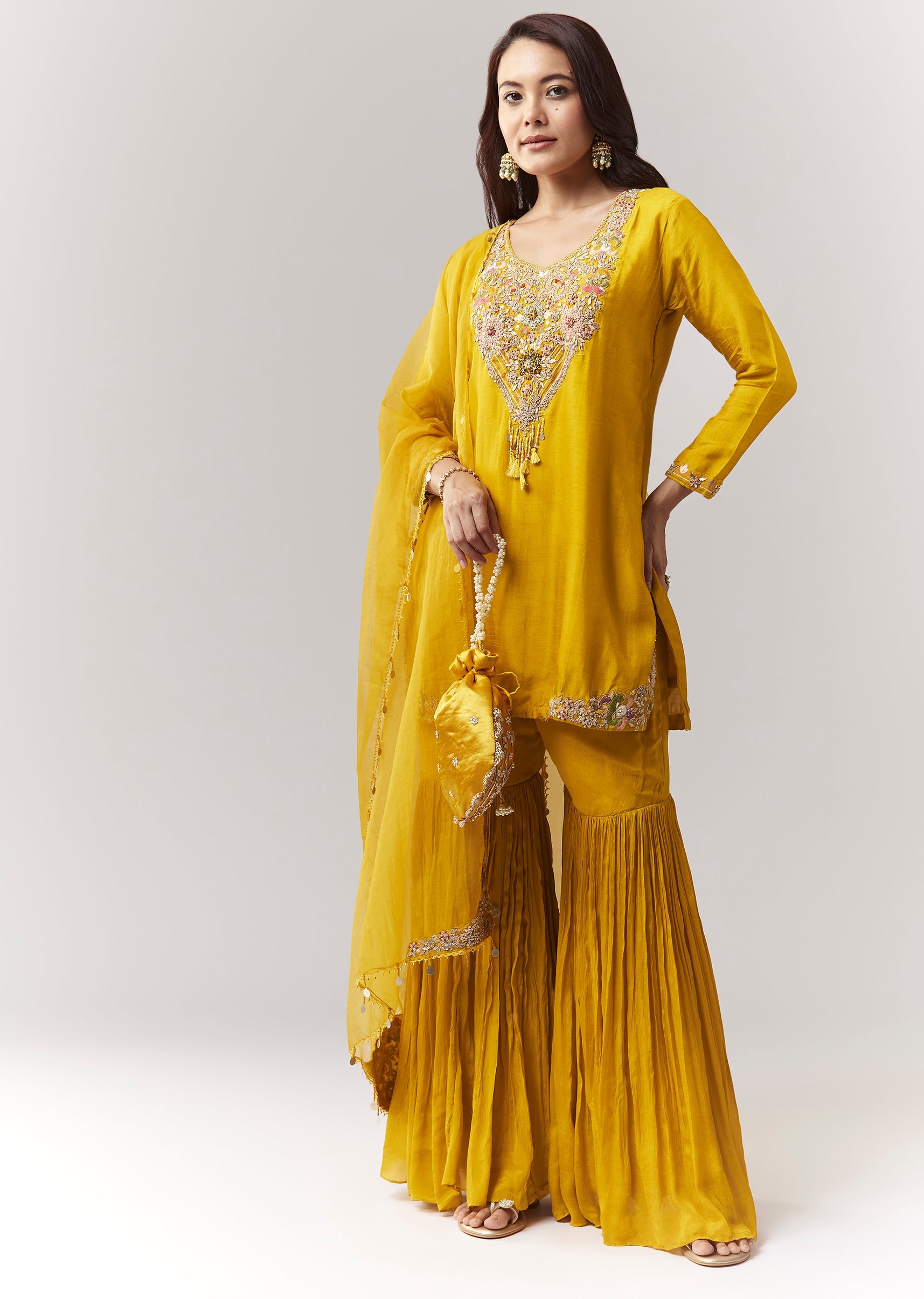 A festive yellow straight kurta set in dola silk with zardosi/threadwork, paired with an elasticated flared sharara and organza dupatta—perfect for haldi and festive functions. Awarded as the Most Trusted... More Product Details