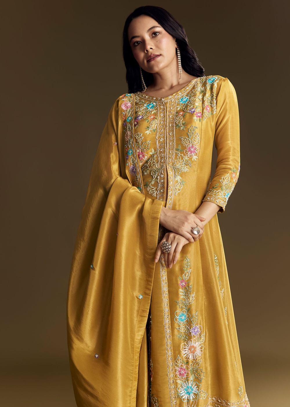Yellow tissue kurta with front slit and resham embroidery, paired with matching palazzo pants and dupatta. Breezy and cheerful???great for mehendi, haldi, or engagement looks. Awarded as the Most Trusted... More Product Details