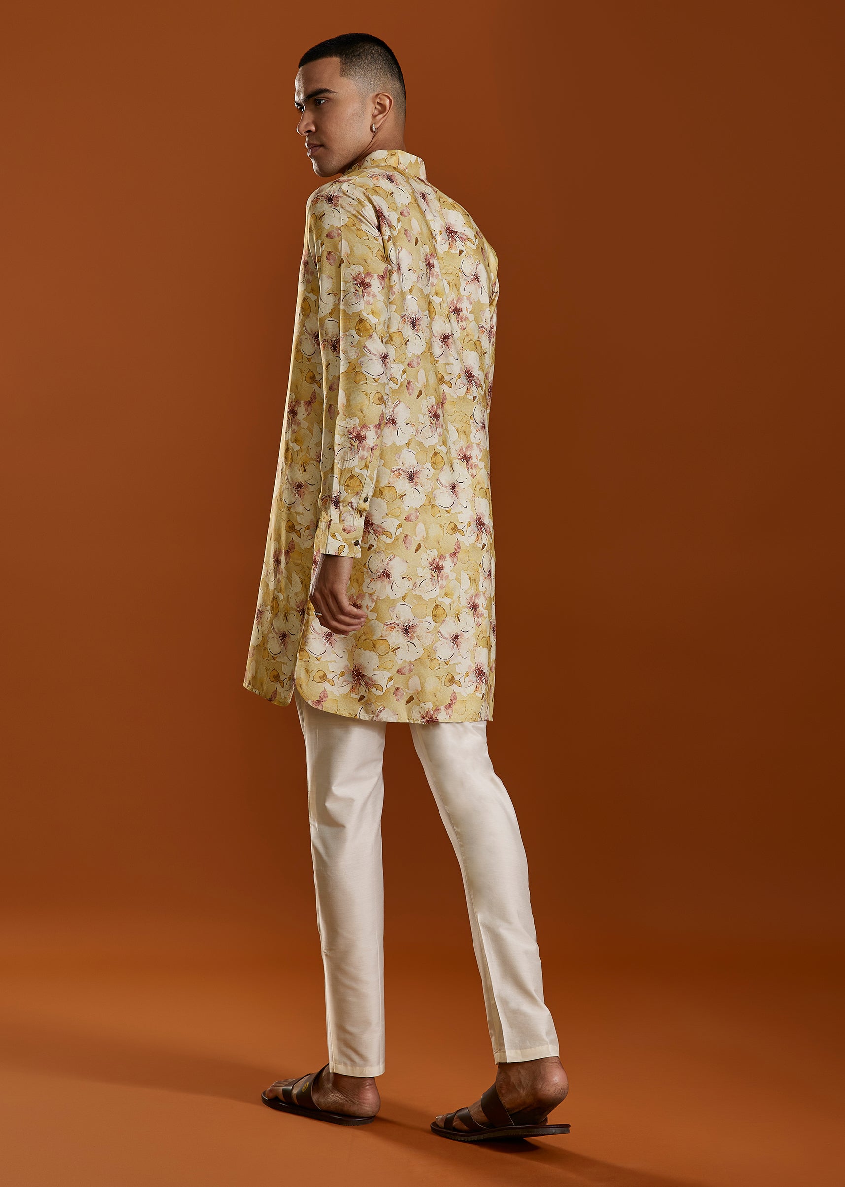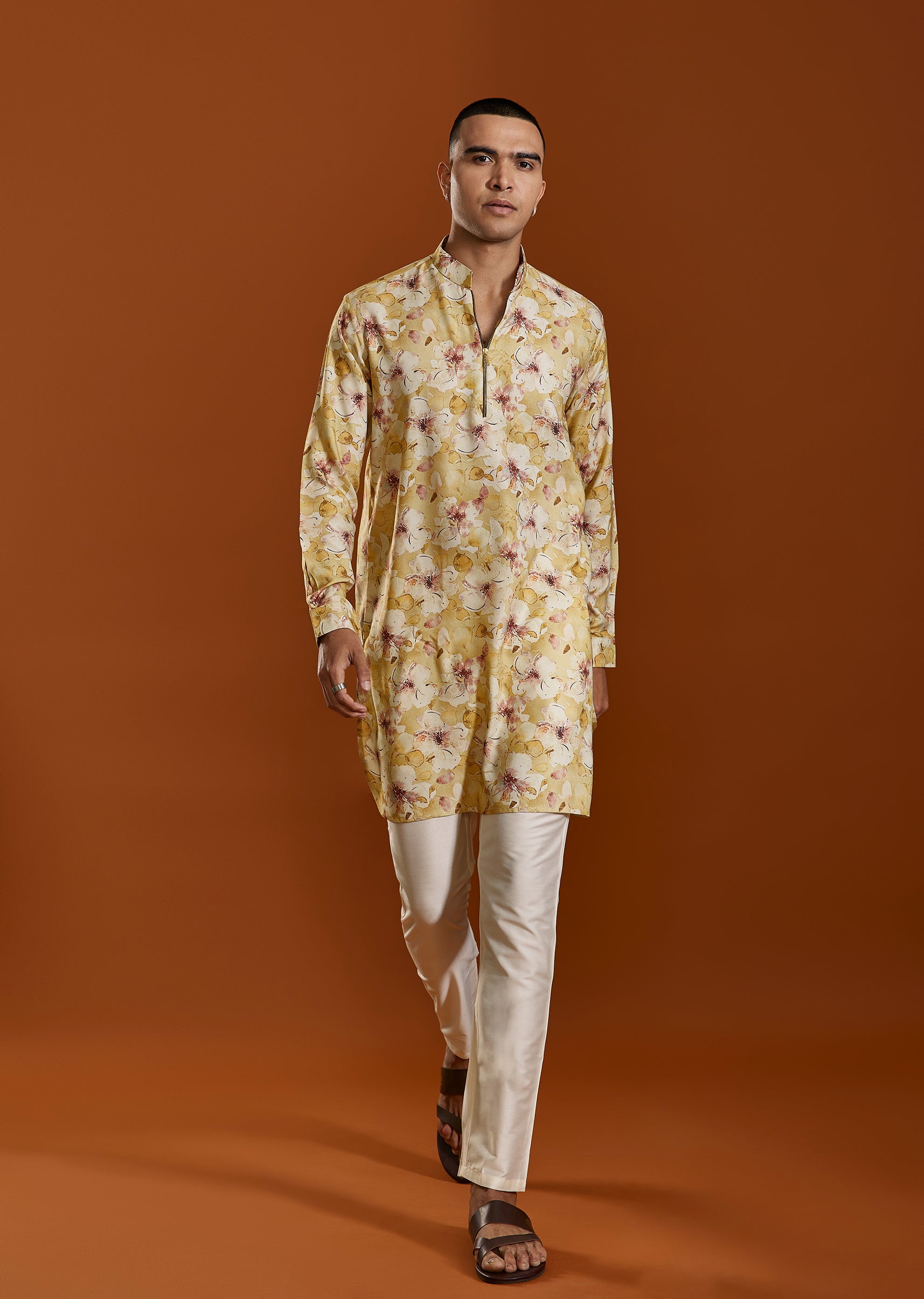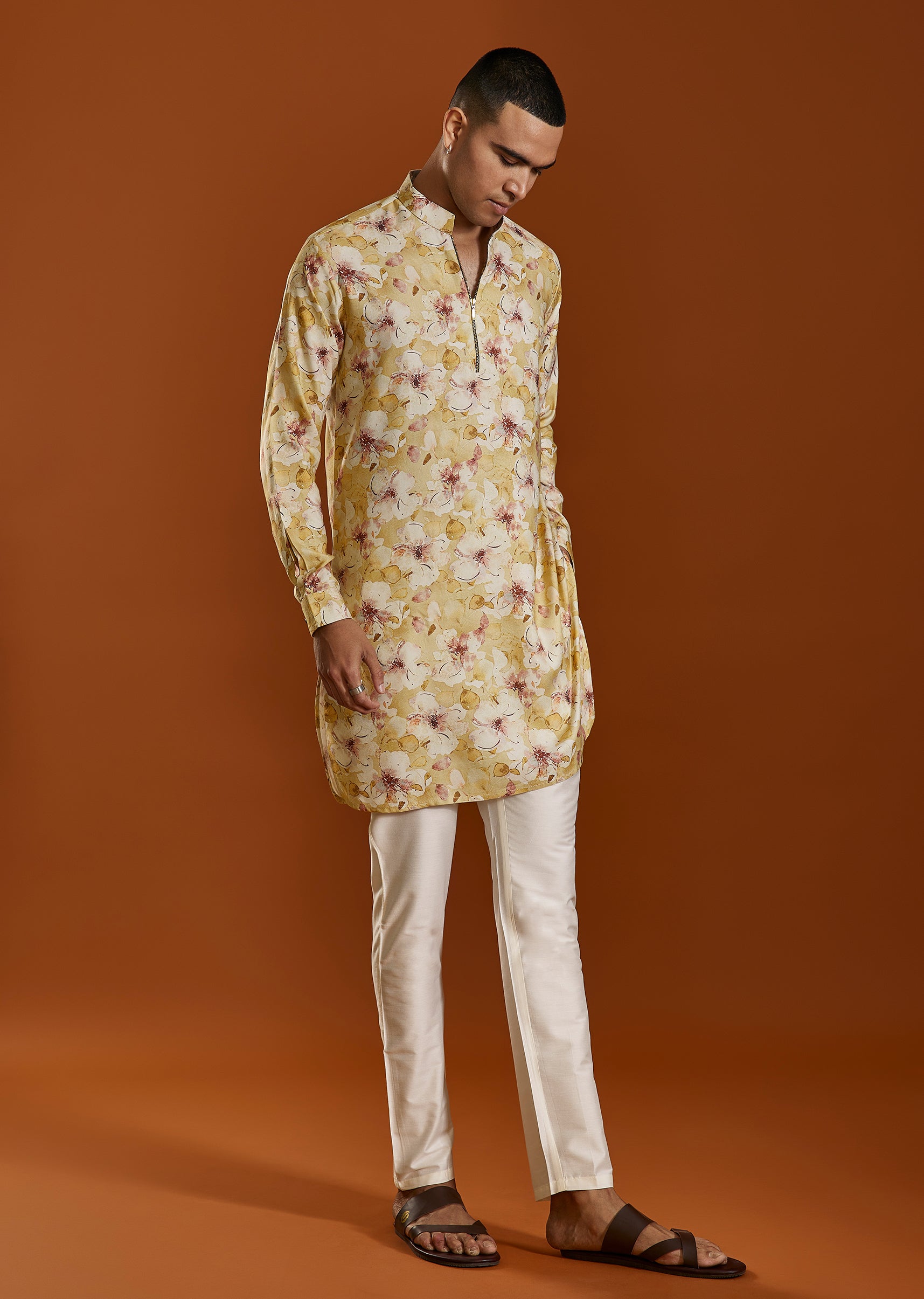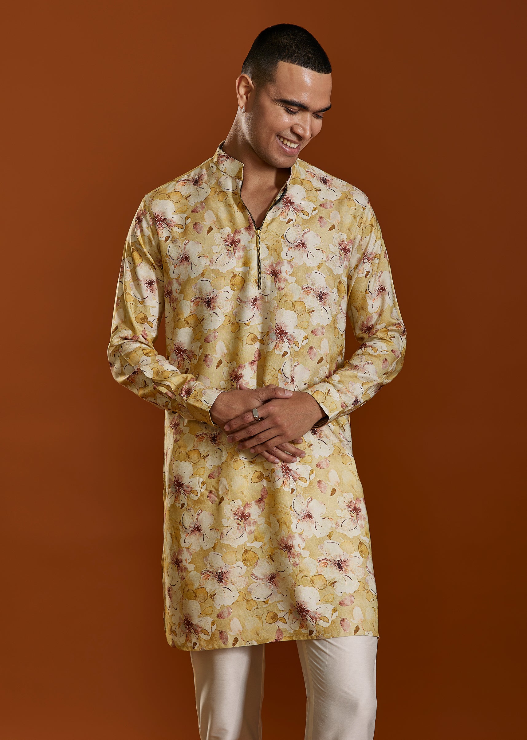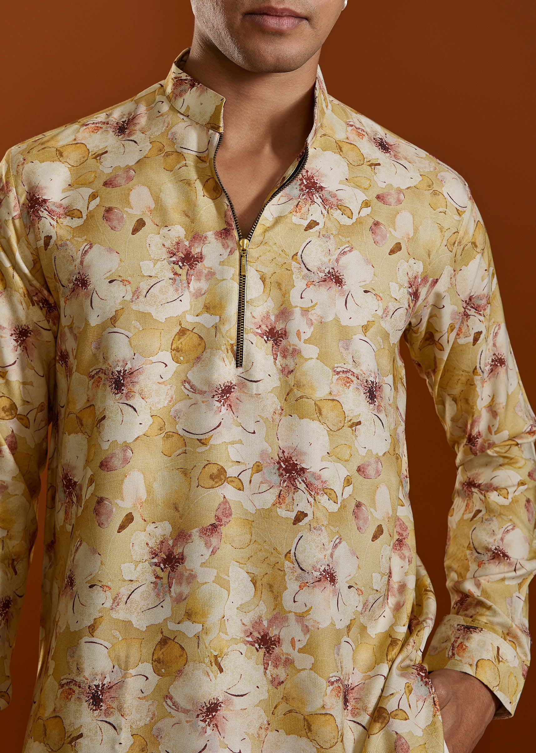 Yellow Pashmina Floral Printed Kurta Set With Zipper