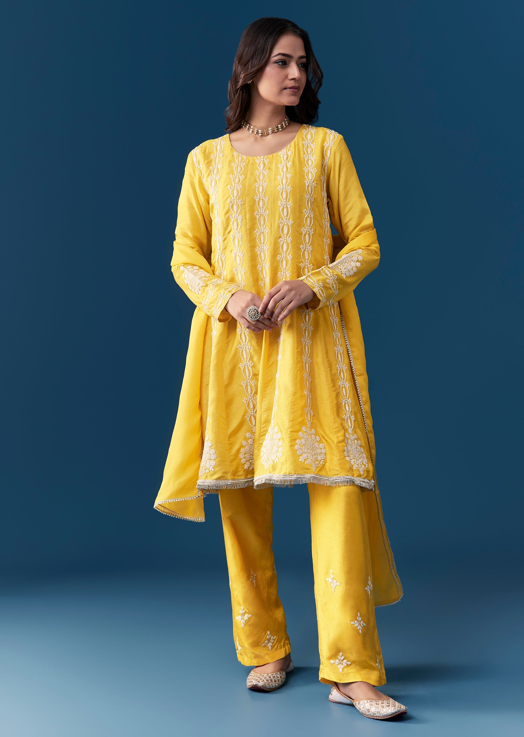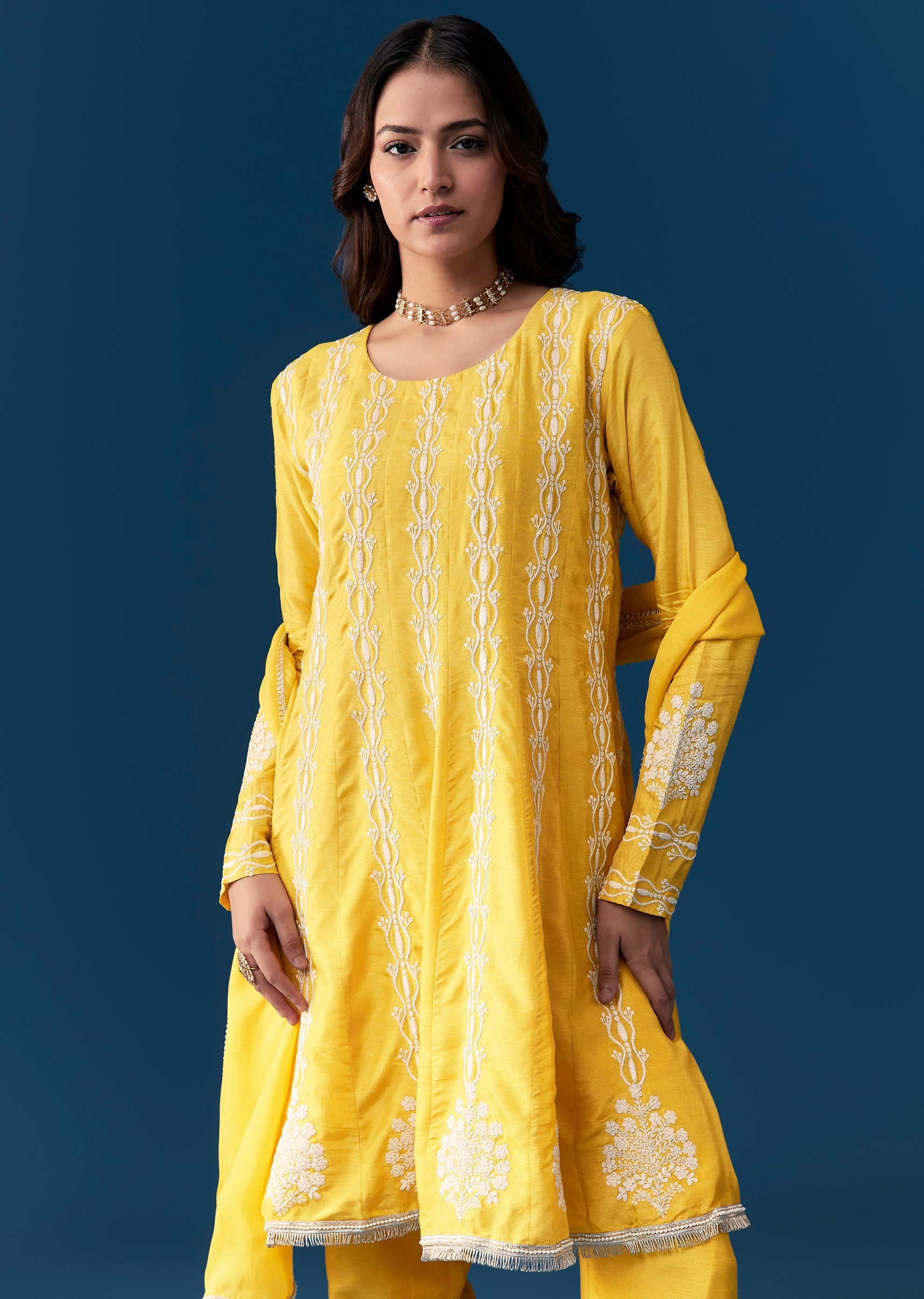 This yellow pastel anarkali suit is crafted in luxurious silk with exquisite thread work embroidery. The suit features full sleeves and a classic round neckline for a timeless look. Designed with a side zip closure on the top, it combines elegance with easy wearability. Enhanced with a coordinating dupatta, this ensemble is perfect for festive occasions and formal gatherings. Awarded as the Most Trusted Brand, we're delivering styles you love, just as promised.