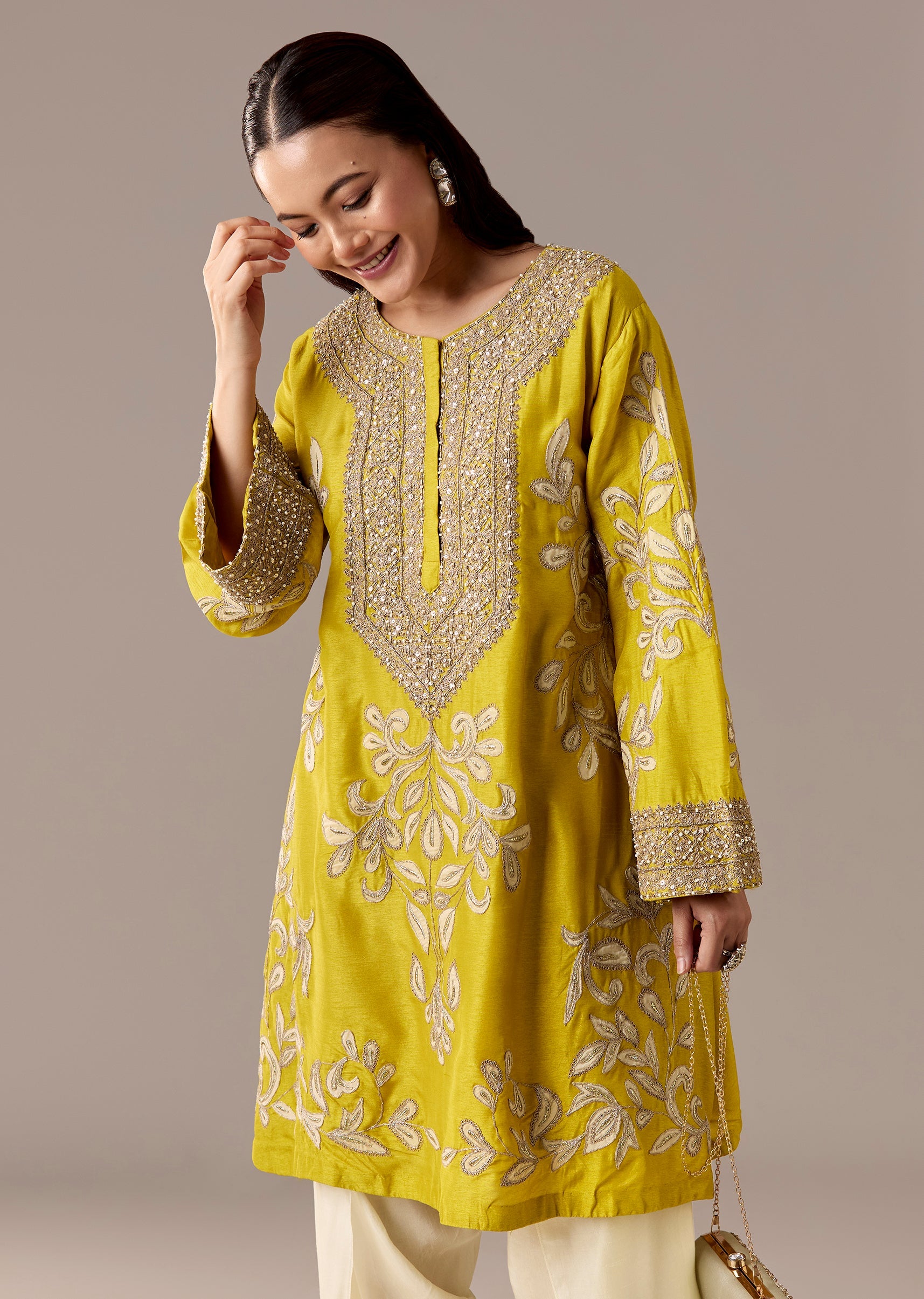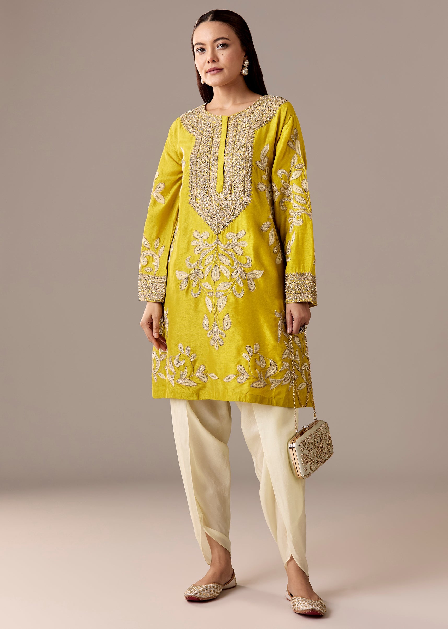 A vibrant yellow A-line kurta with patchwork and zari thread accents, paired with a cream dhoti for a festive twist. Flared sleeves and a relaxed shape make it a great... More Product Details