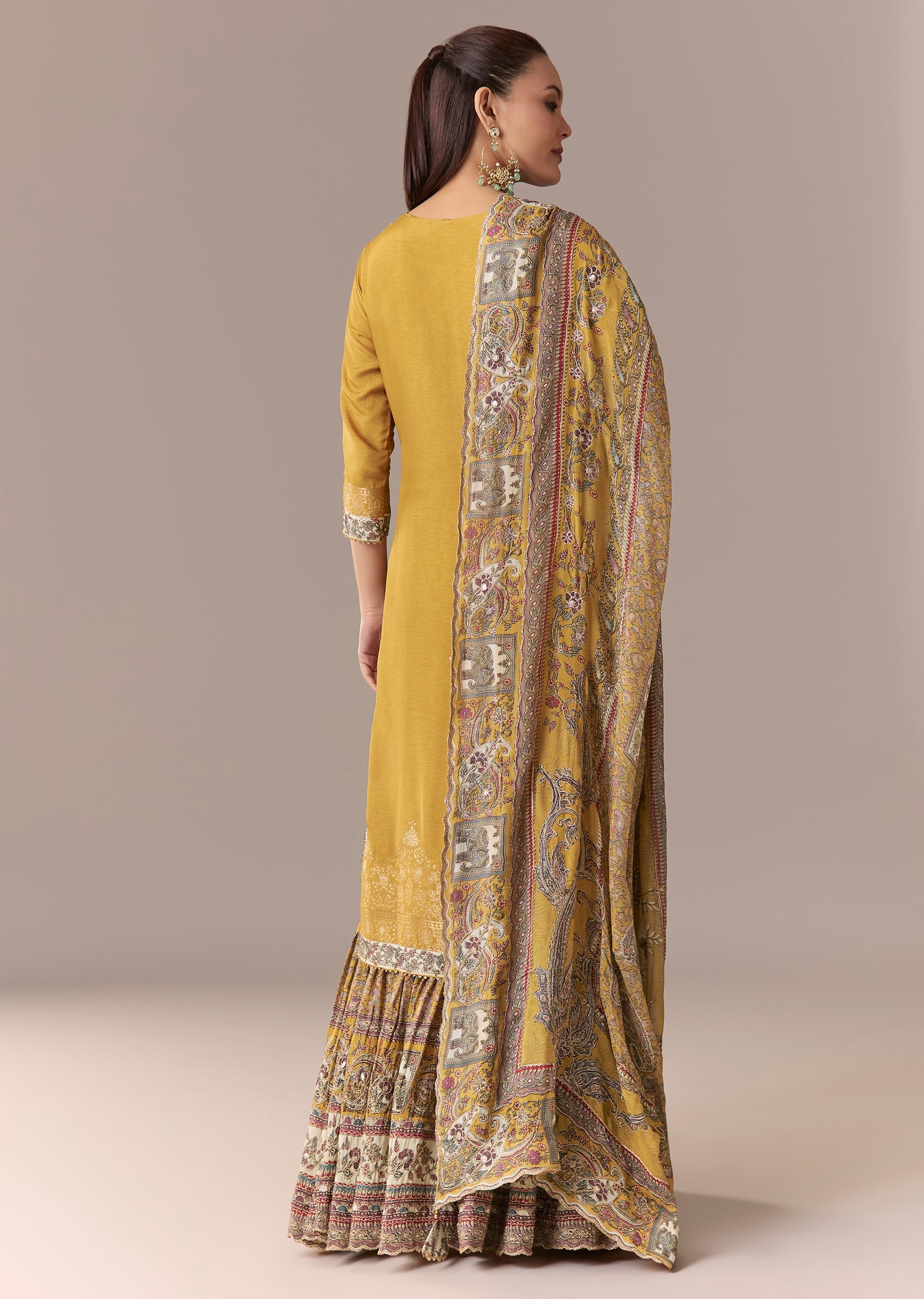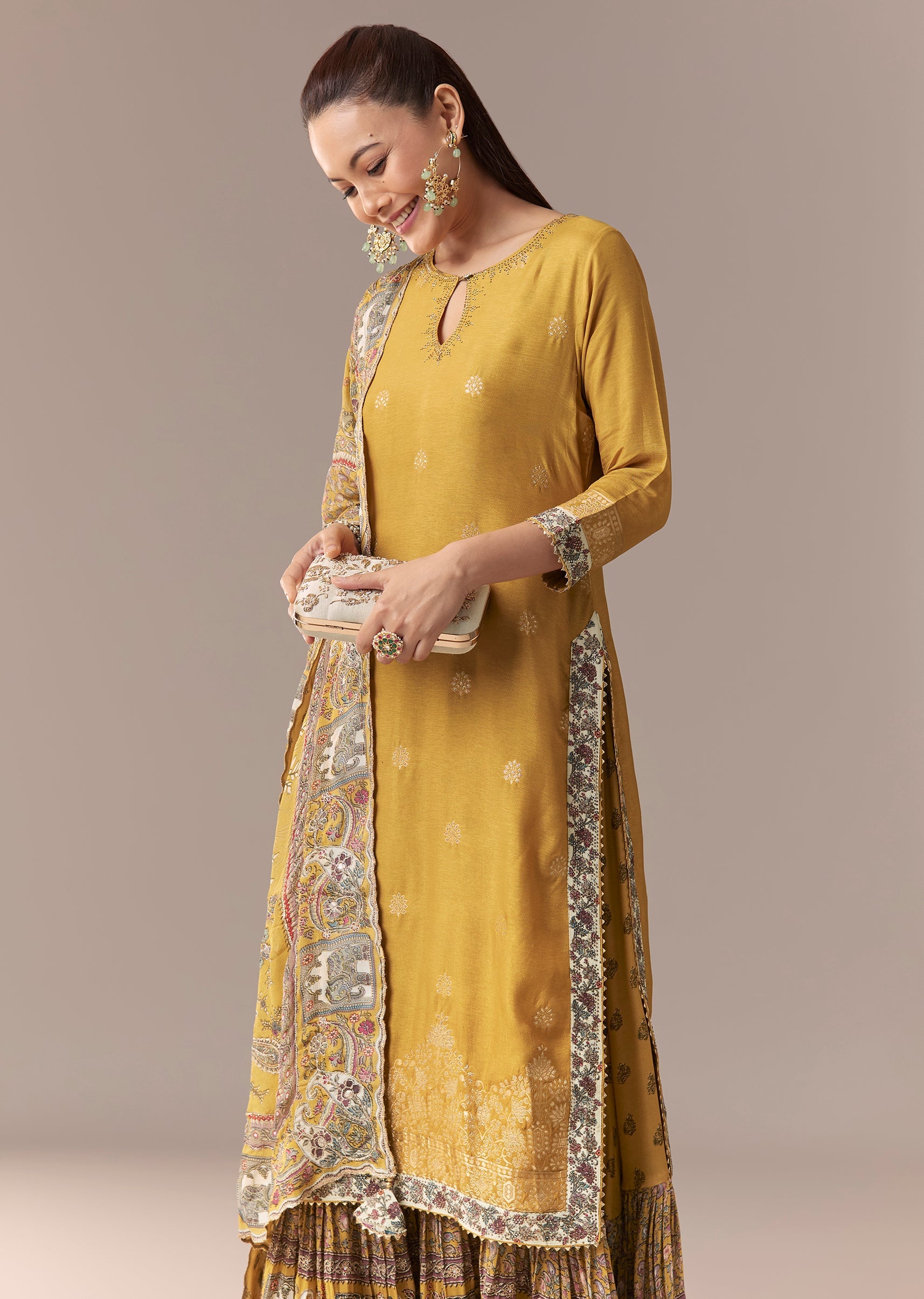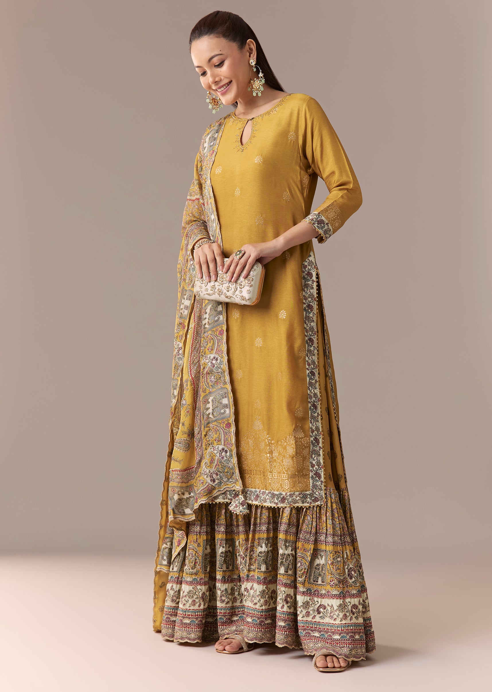 Crafted in crepe, this straight kurta features a woven finish and is paired with a printed sharara for a playful festive look. Designed with a keyhole neckline, 3/4th sleeves and... More Product Details
