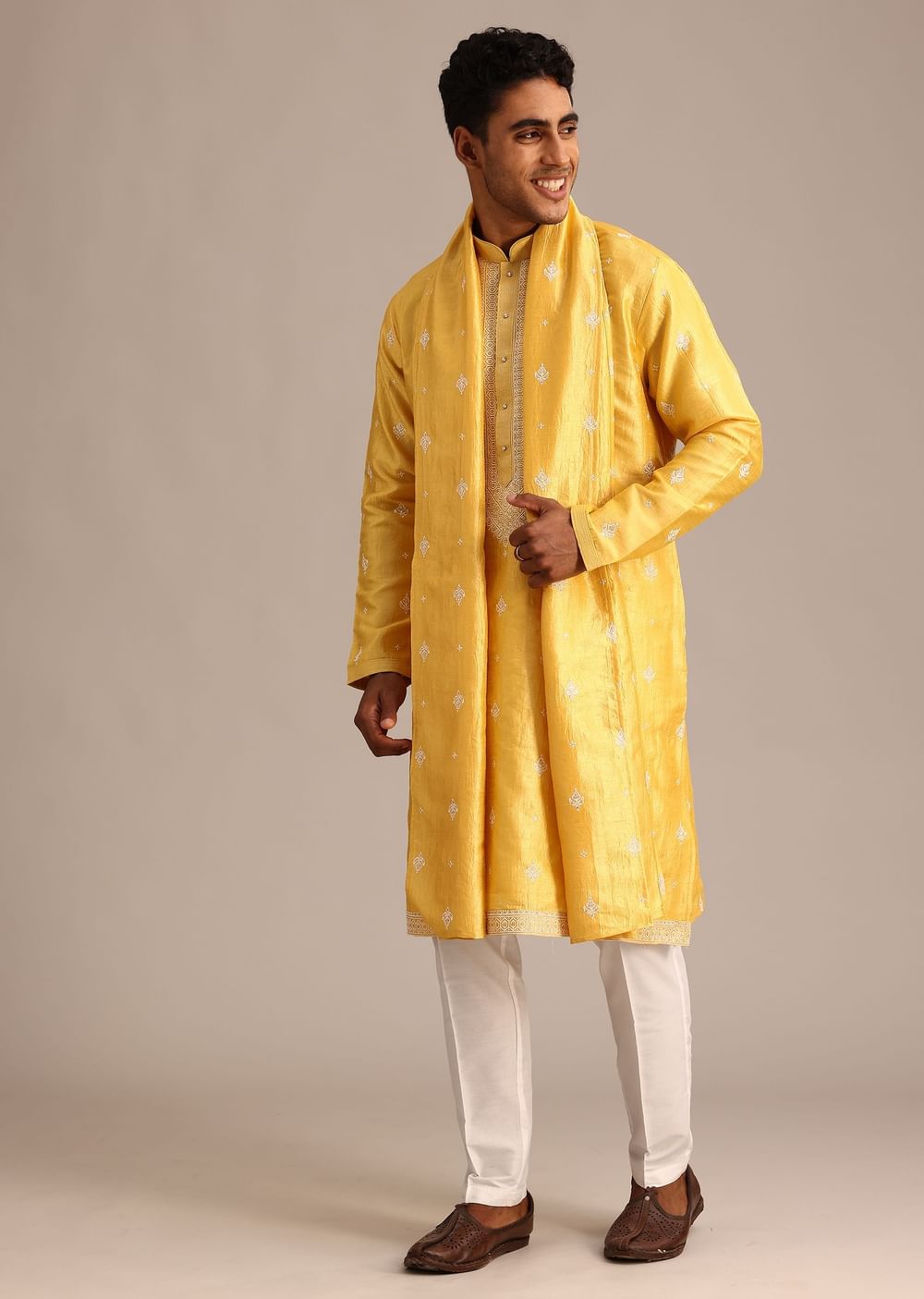 Elevate this yellow raw silk kurta set with classic mojris or leather sandals, and add a contrasting pocket square or bracelet for a hint of modern flair. A well-groomed hairstyle will add a polished touch to complete the look!
