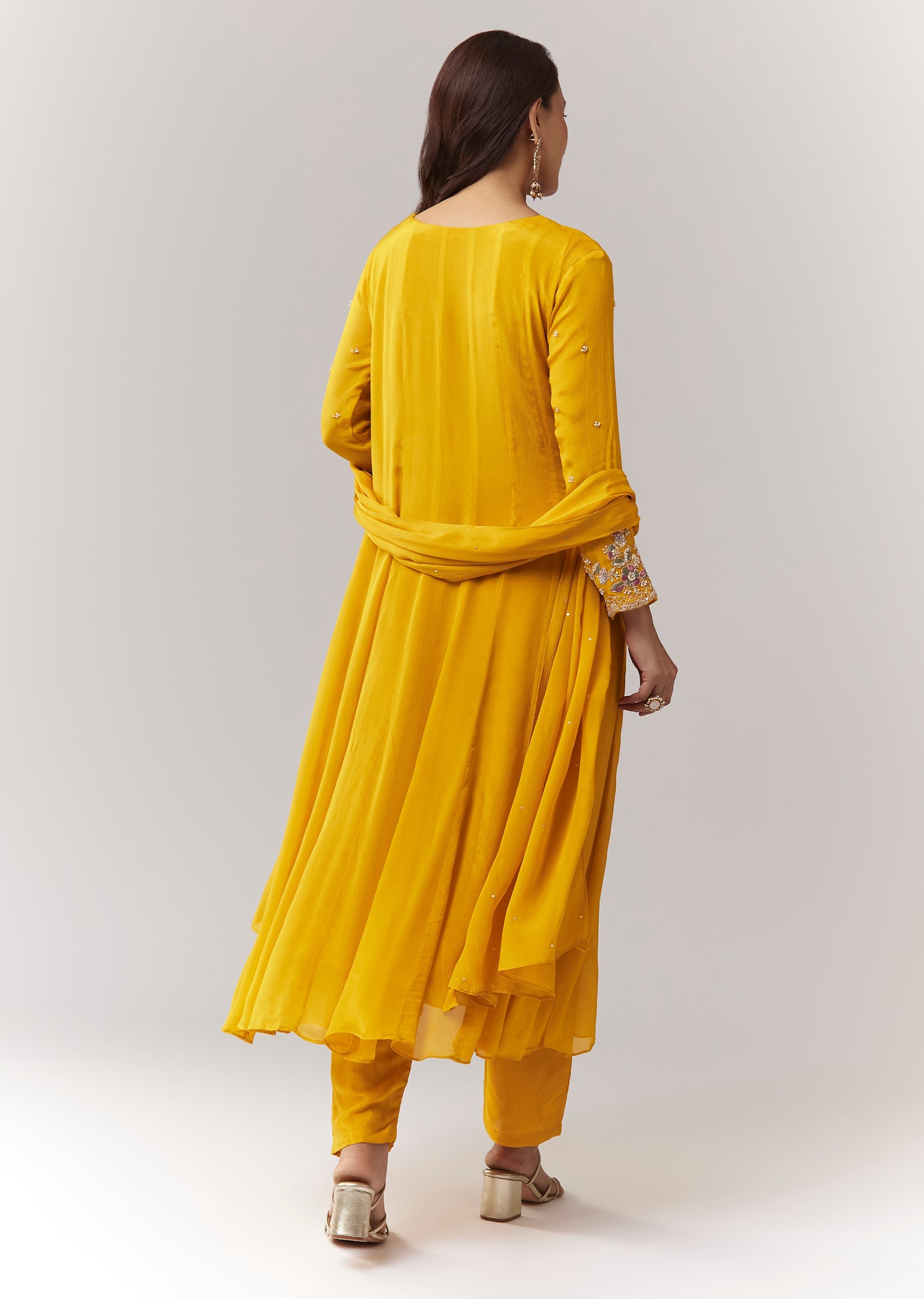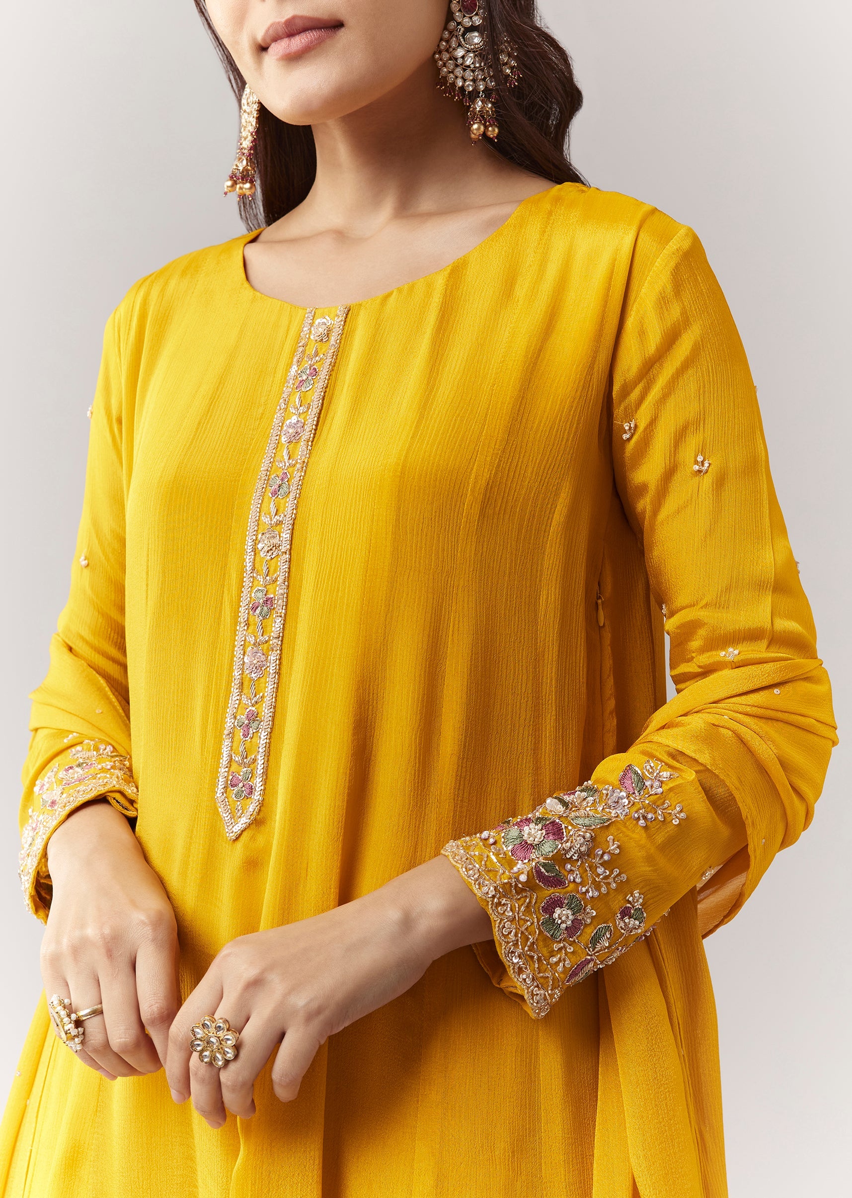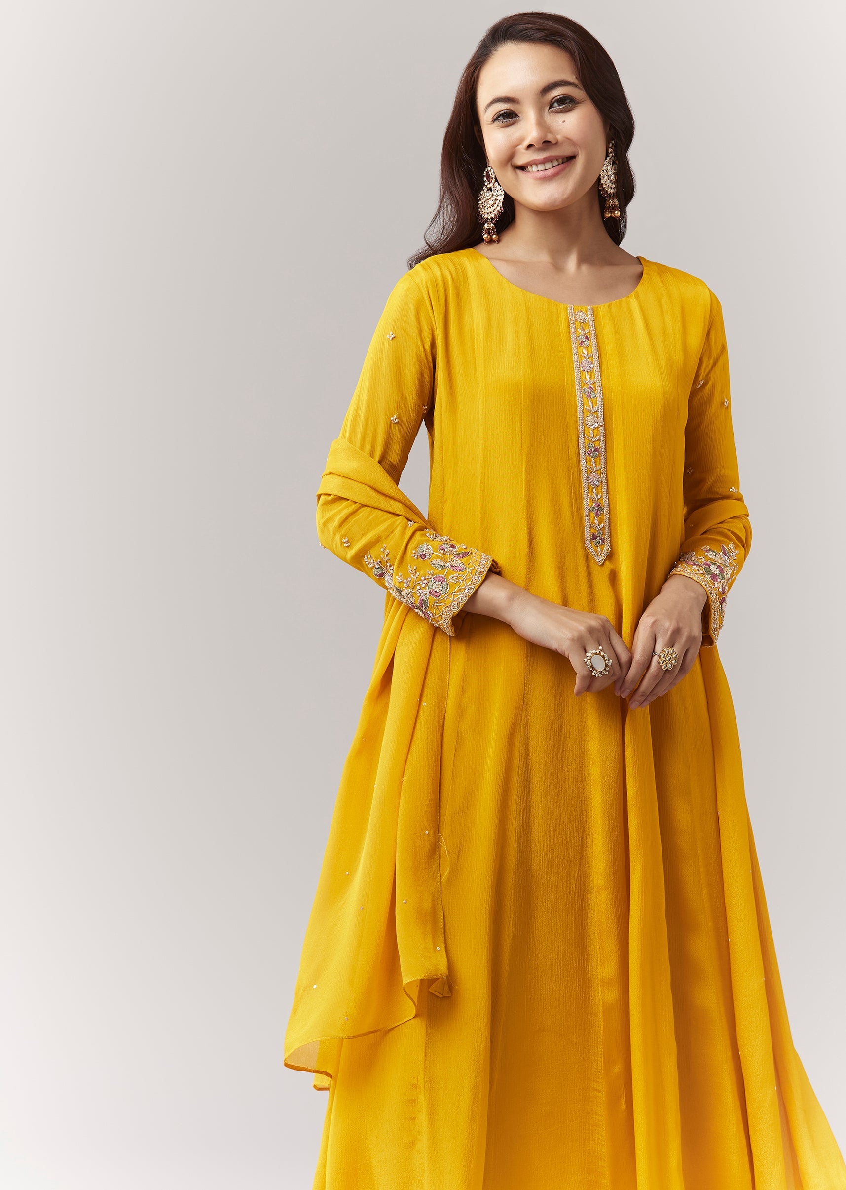 A bright festive yellow chinon anarkali with resham + cut-dana sleeve detailing, paired with straight pants and dupatta. Minimal, graceful, and easy to wear. Awarded as the Most Trusted Brand,... More Product Details