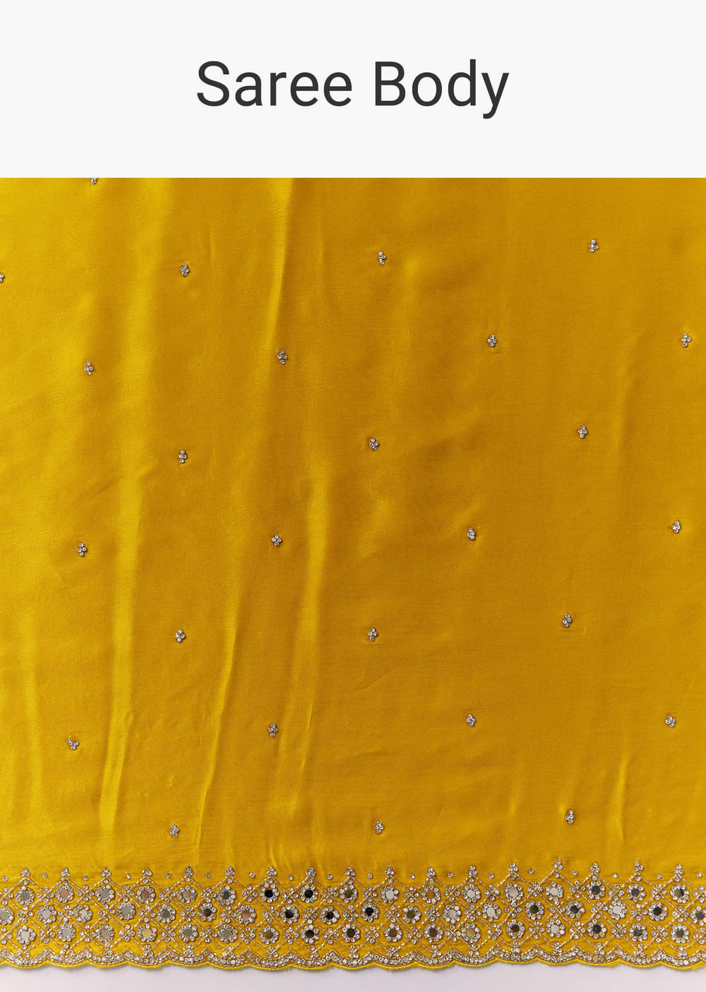Radiate festive grandeur with this yellow satin saree, featuring a richly embroidered border adorned with sequins, cutdana, mirrors, and embellished stones. The lustrous satin fabric offers a smooth, luxurious drape... More Product Details