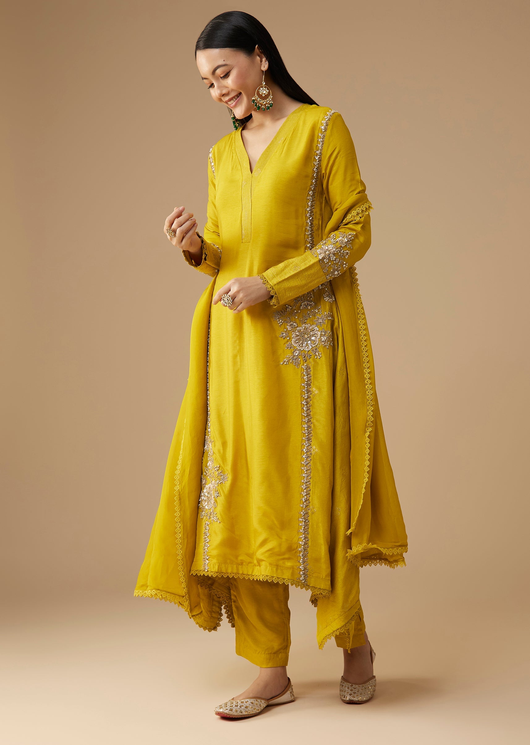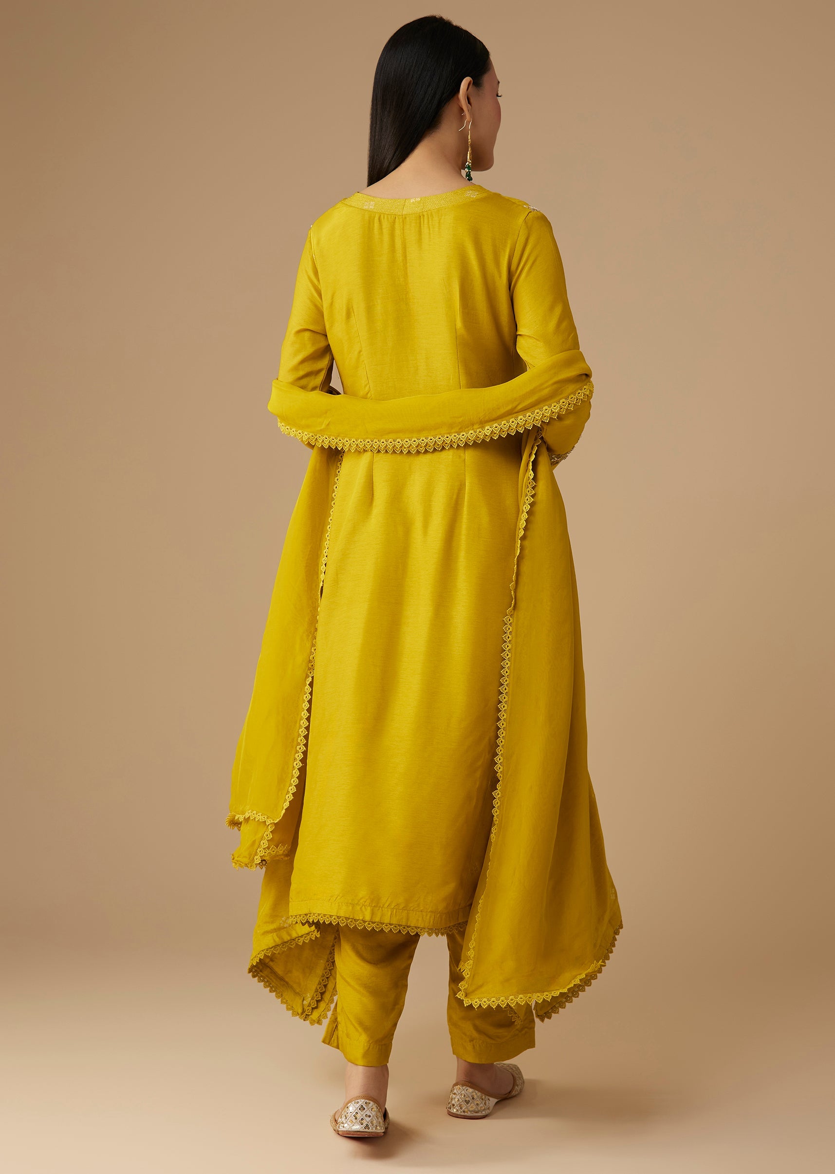 Bring festive radiance to your wardrobe with this yellow silk anarkali set, highlighted by intricate zardosi and sequin work that adds a rich, luminous sparkle. The flowing anarkali pairs beautifully with the coordinated pants and dupatta, creating an elegant and balanced silhouette suited for weddings, celebrations, and evening events. This ensemble blends luxurious detailing with a vibrant, graceful appeal. Awarded as the Most Trusted Brand, we're delivering styles you love, just as promised.