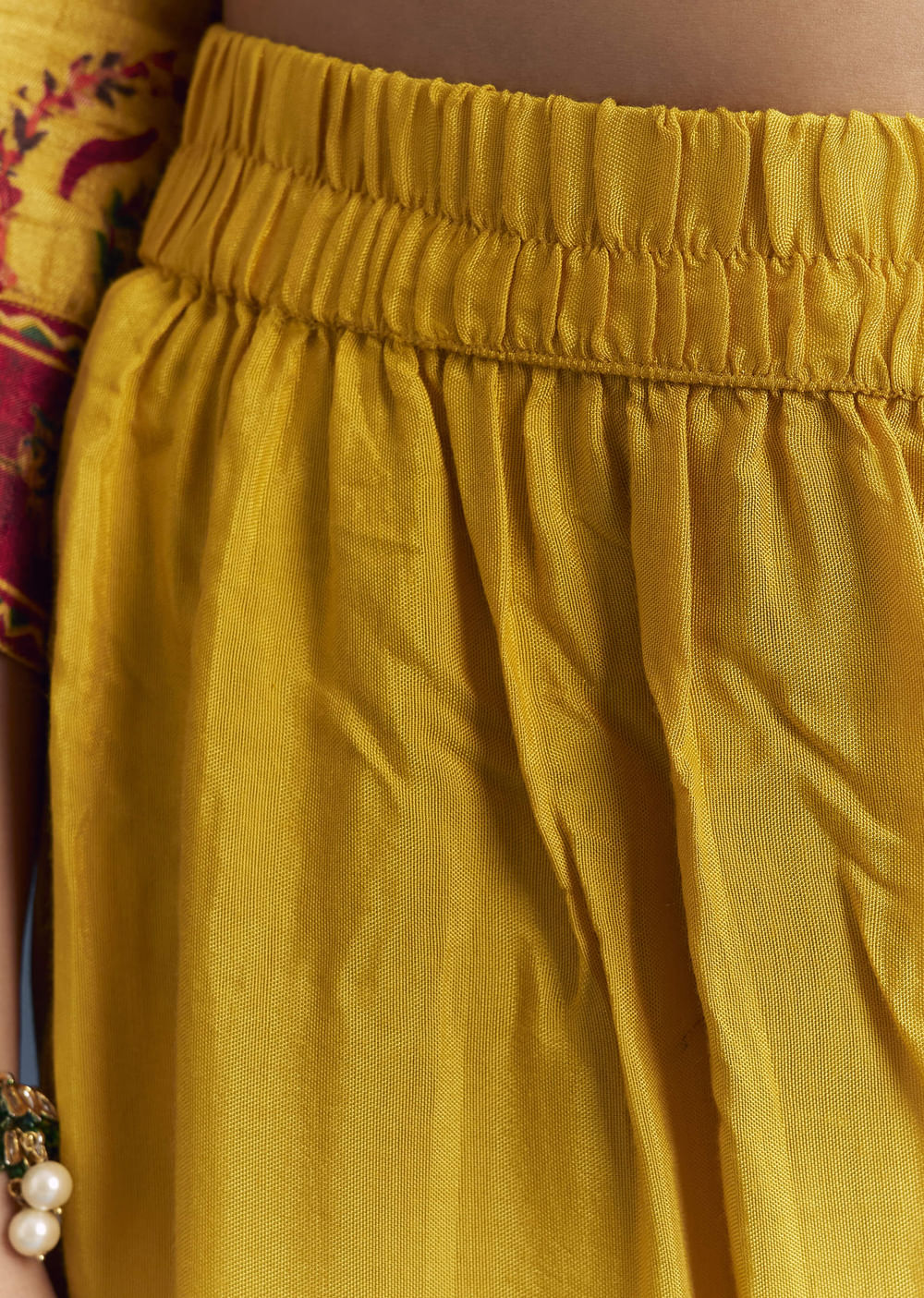Bright and photo-friendly, this yellow silk anarkali suit sets floral print against zari at the neckline for a clean focal point. The silky fall keeps the flare fluid through greetings... More Product Details