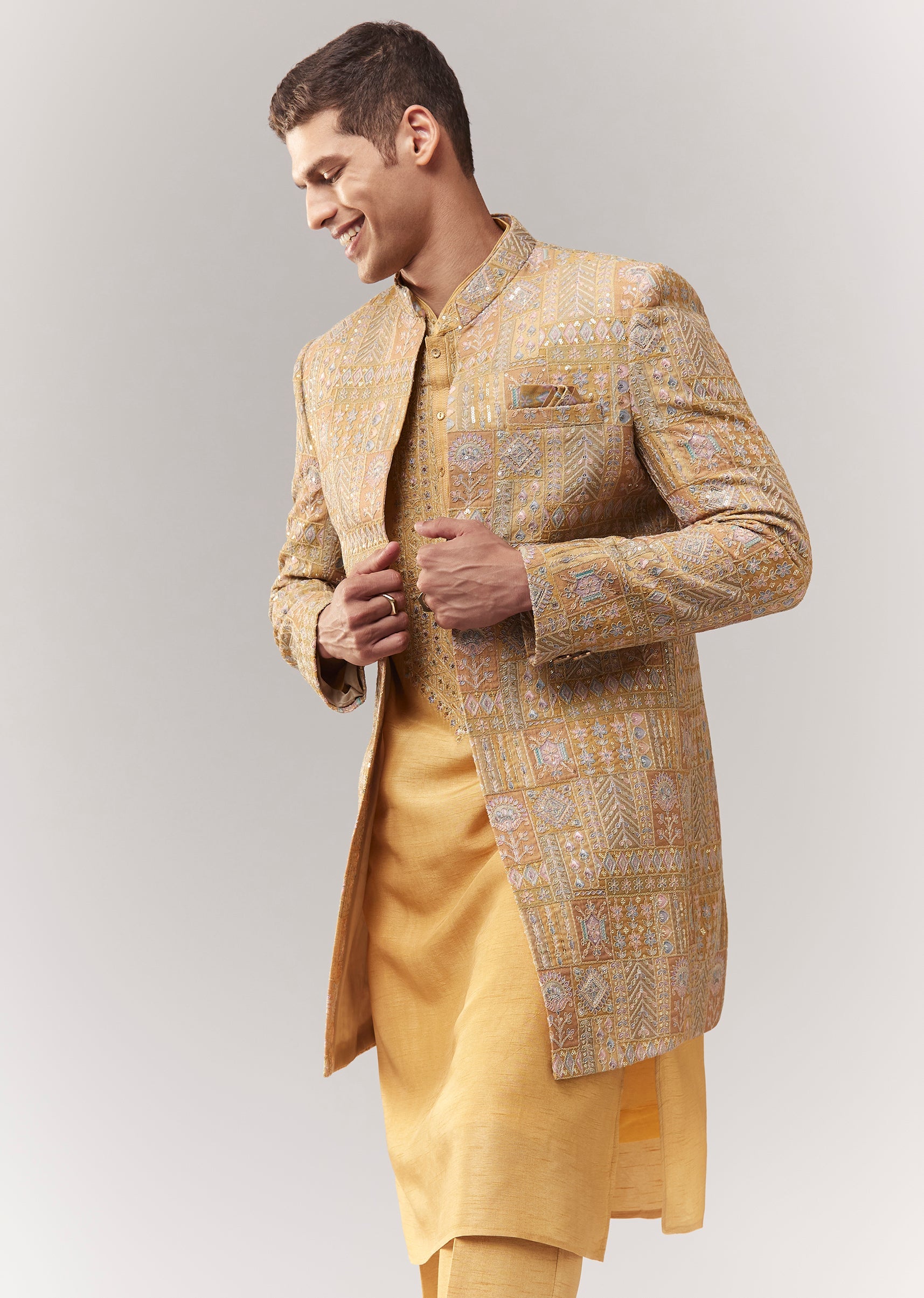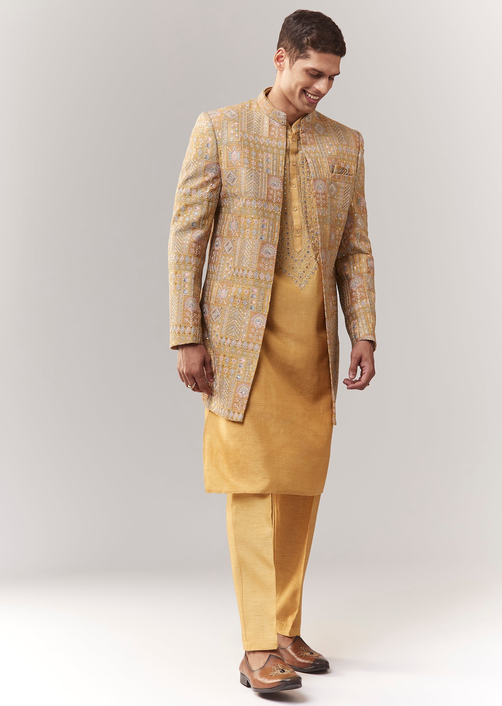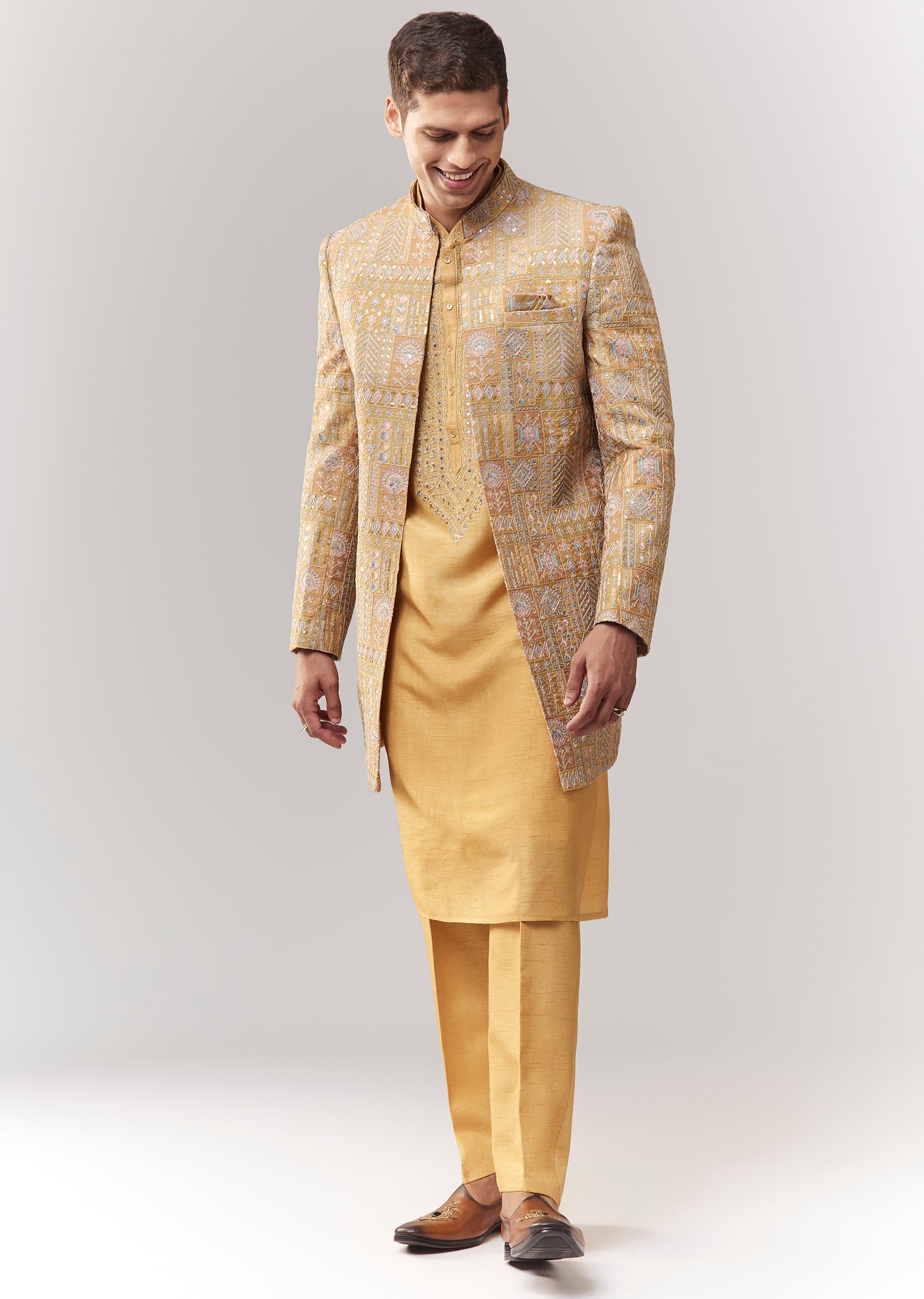 A festive yellow silk indo-western featuring thread/resham and sequin detailing. Mandarin collar, full sleeves, and front button closure with hook-eye fastening. Includes indo-western kurta/jacket styling with straight pants (mid-waist). Ideal for wedding and haldi functions for groomsmen. Awarded as the Most Trusted Brand, we're delivering styles you love, just as promised.