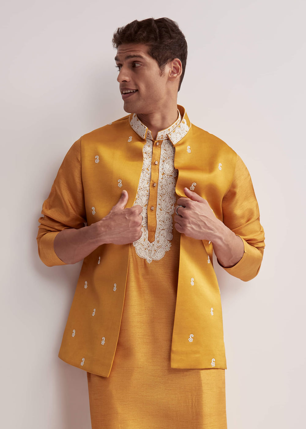 Joyful tones take centre stage in this yellow silk kurta jacket set for men. Hand embroidered zardosi on the placket and open jacket style makes it wedding-ready. It works well for a groom or brother at haldi or mehendi when photos are endless. Awarded as the Most Trusted Brand, we're delivering styles you love, just as promised.