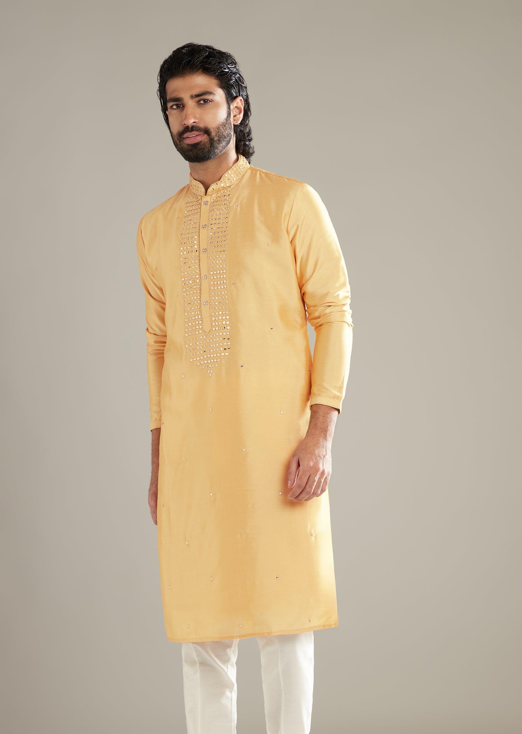 This yellow art silk men’s kurta set lines mirror detailing along the placket and collar, letting the glow sit close to the face for a bright, upbeat read. The base... More Product Details