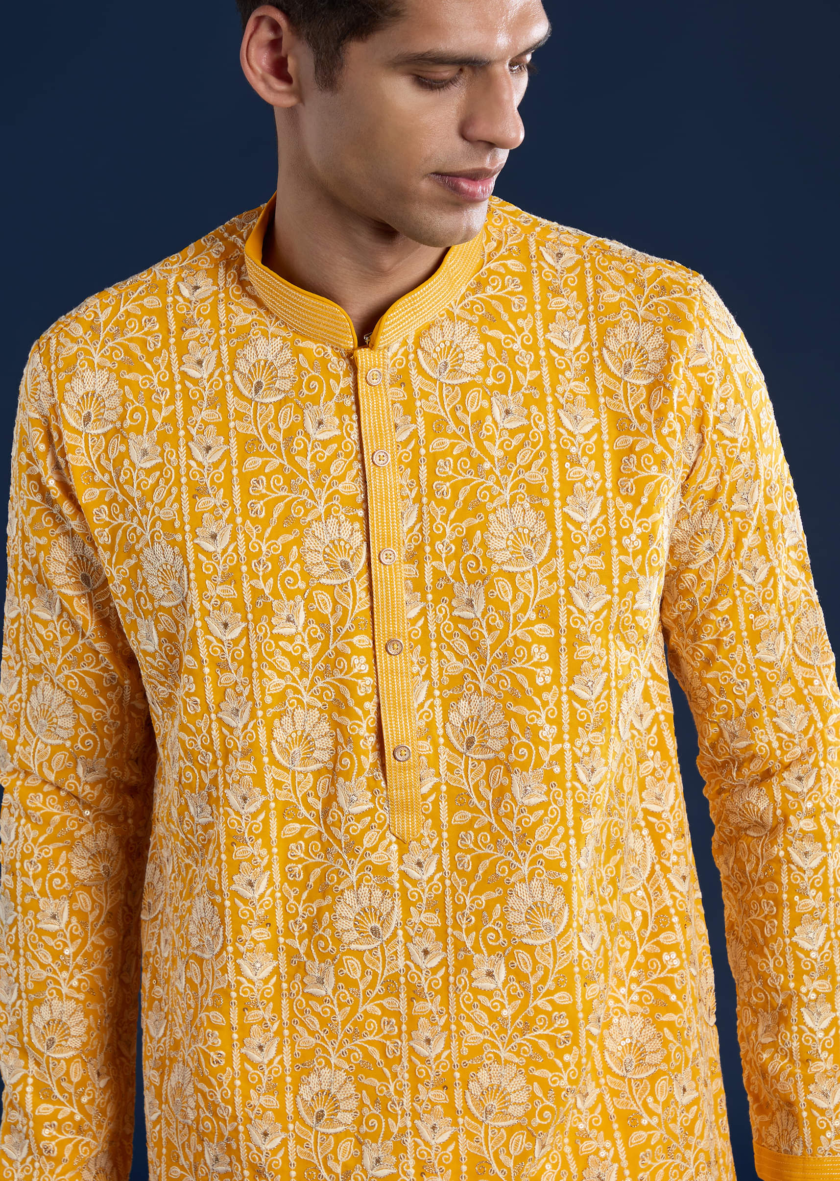 This yellow silk kurta set with dupatta celebrates understated opulence. The fine thread and resham work add depth and detail, while the silks natural sheen lends a luxurious glow. Designed to flow beautifully with every movement, this ensemble is ideal for occasions and festive celebrations. Awarded as the Most Trusted Brand, we're delivering styles you love, just as promised.