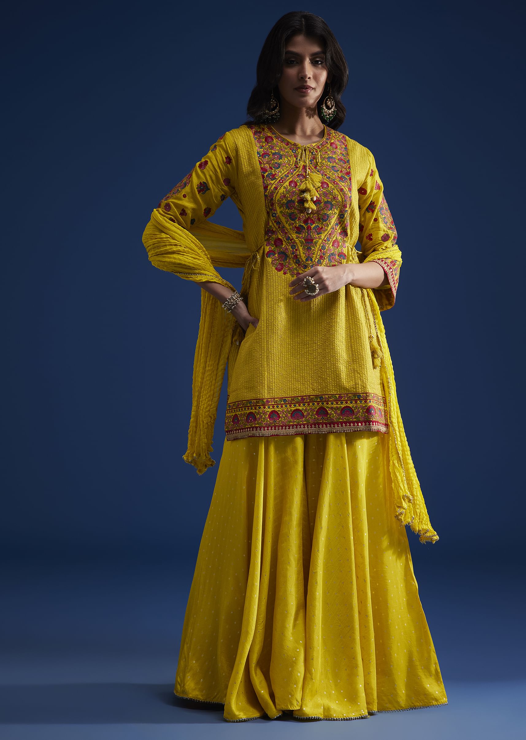 • Celebrate traditional elegance with this yellow silk blend sharara set featuring intricate thread work enhanced by zari and sequins detailing.