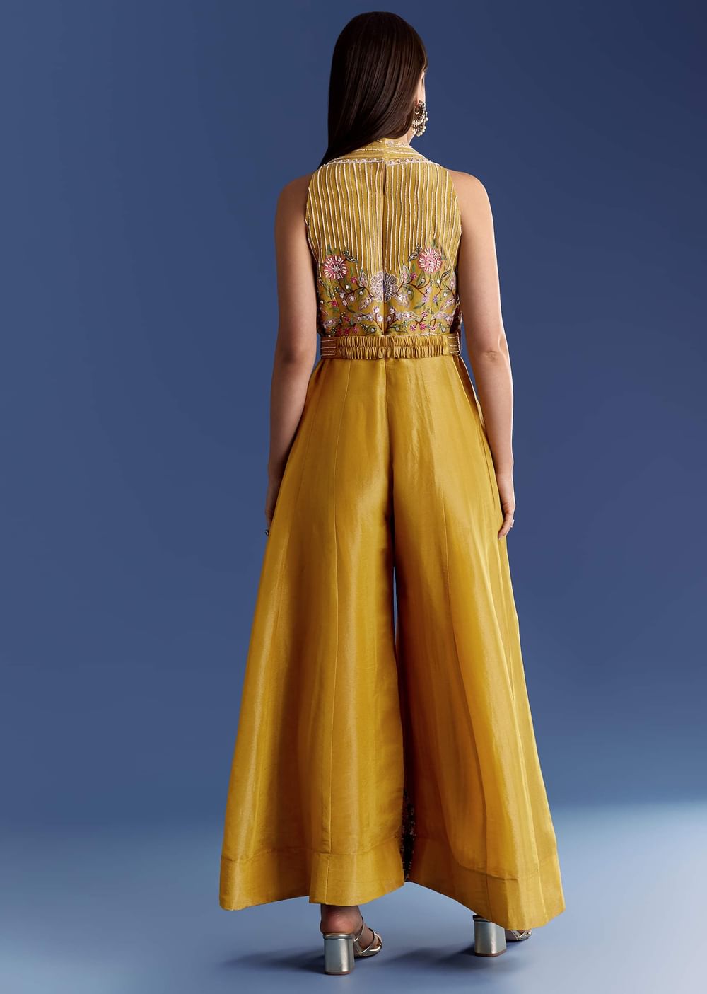In a hue that captures sunlight, this tissue jumpsuit is enhanced with moti, cut dana, and resham work. The statement waist belt creates a sculpted silhouette meant for sangeet sparkle.... More Product Details