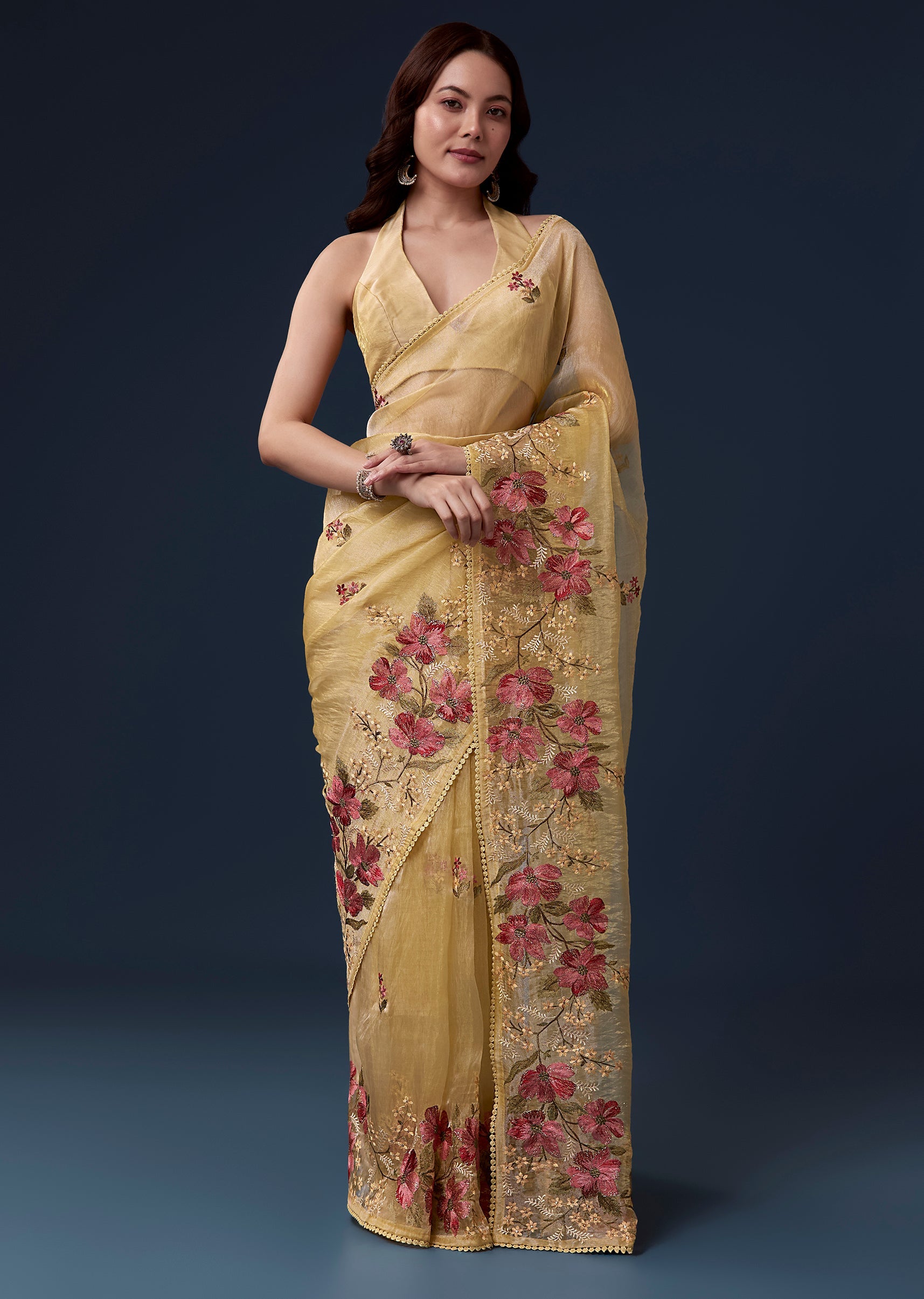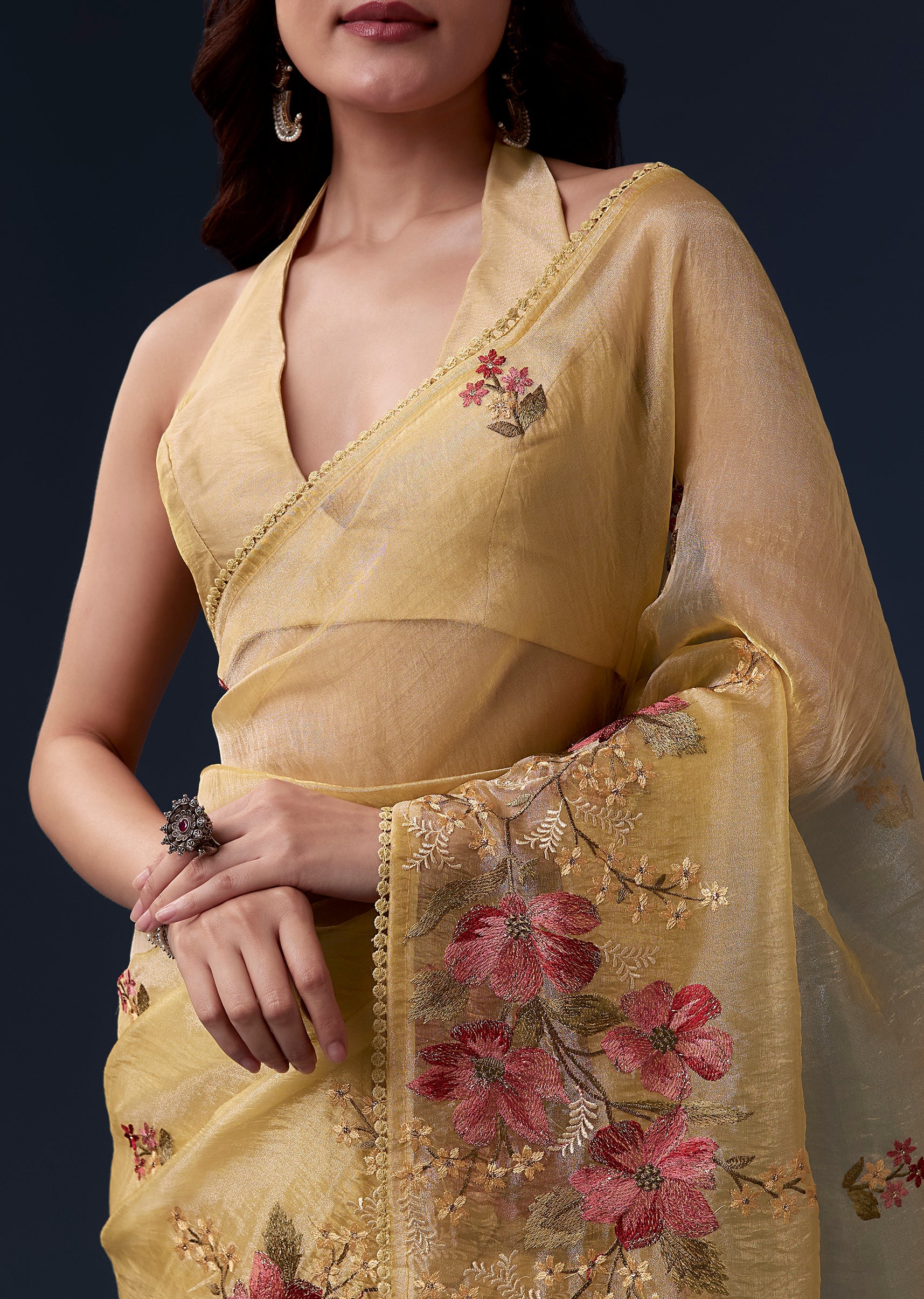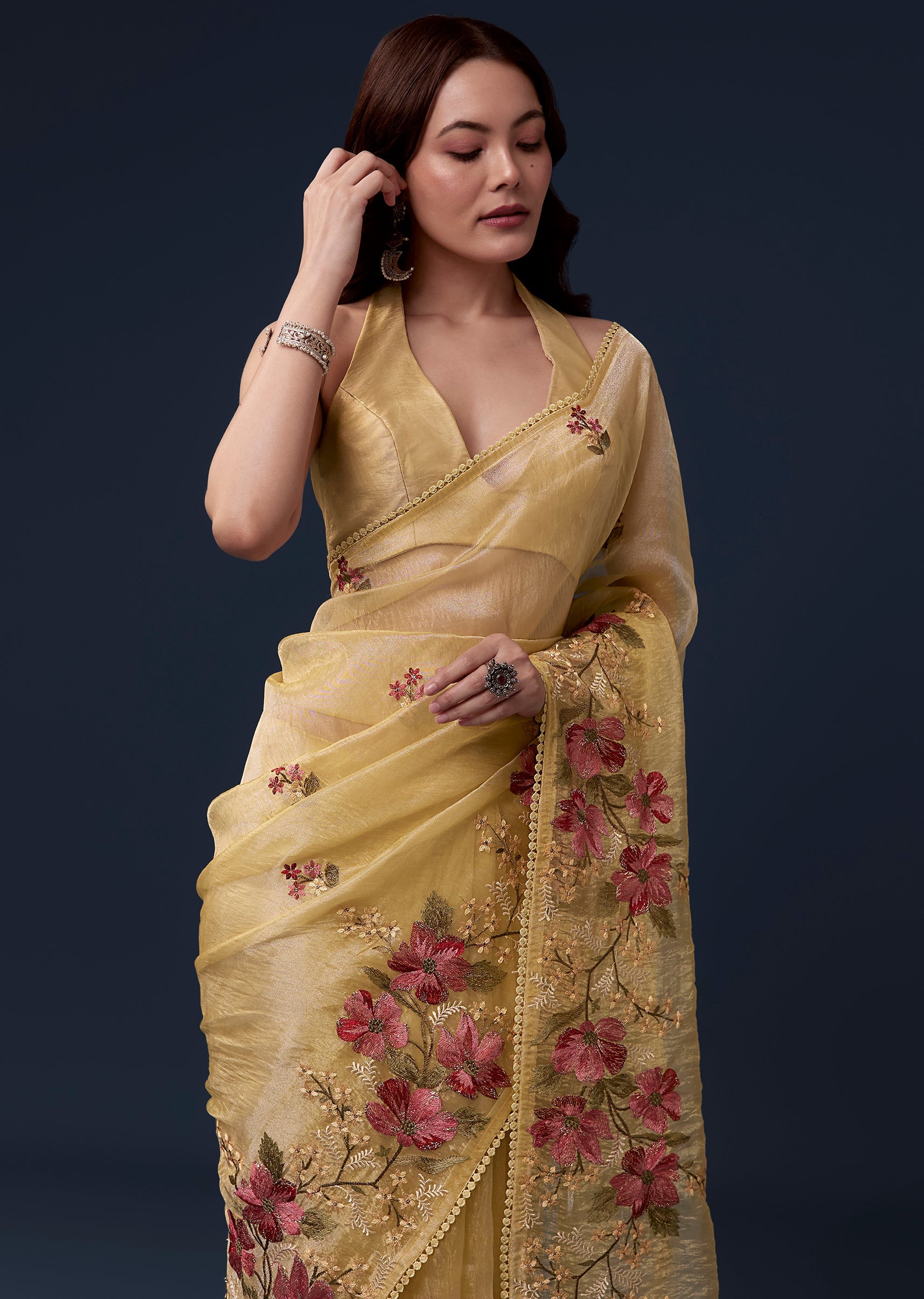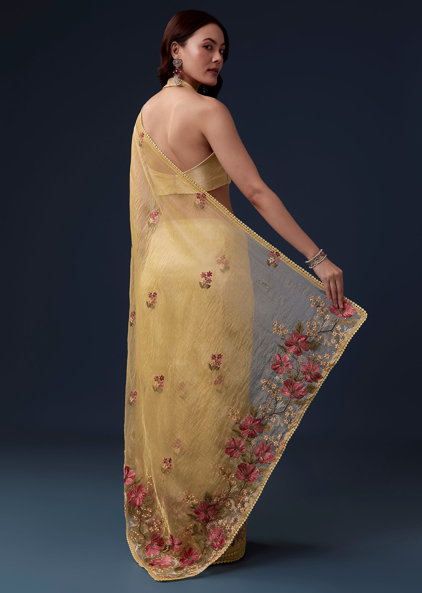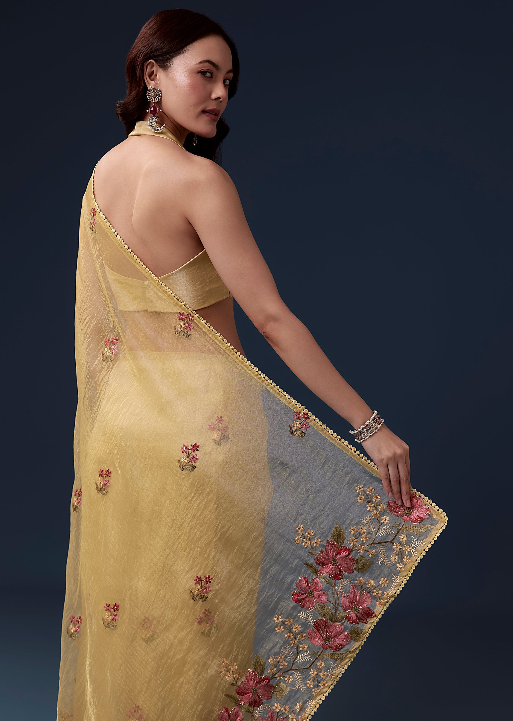 Yellow Tissue Organza Saree With Multicolor Resham Thread And Lace Border