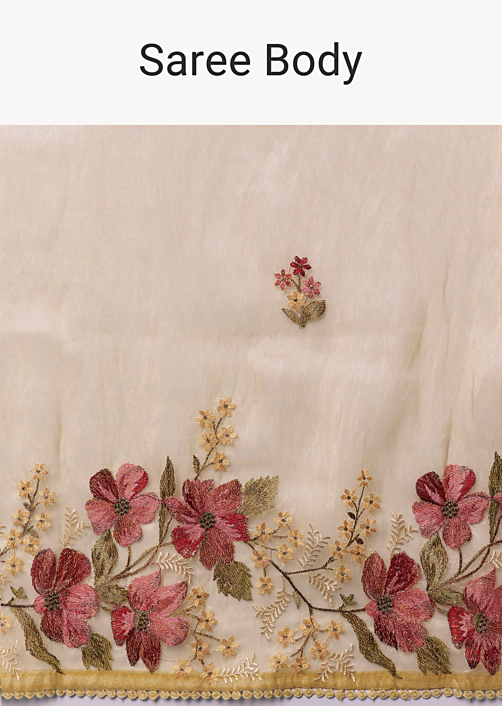 Bright cheerful and festive this yellow tissue organza saree is perfect for haldi and casual wedding celebrations. The soft pastel hue is enhanced with delicate floral embroidery in multicolor resham thread and a subtle lace border creating a playful yet elegant appeal. The saree comes with unstitched blouse fabric allowing a customized and comfortable fit. Ideal for daytime rituals it exudes charm freshness and celebration ready style. Awarded as the Most Trusted Brand, we're delivering styles you love, just as promised.