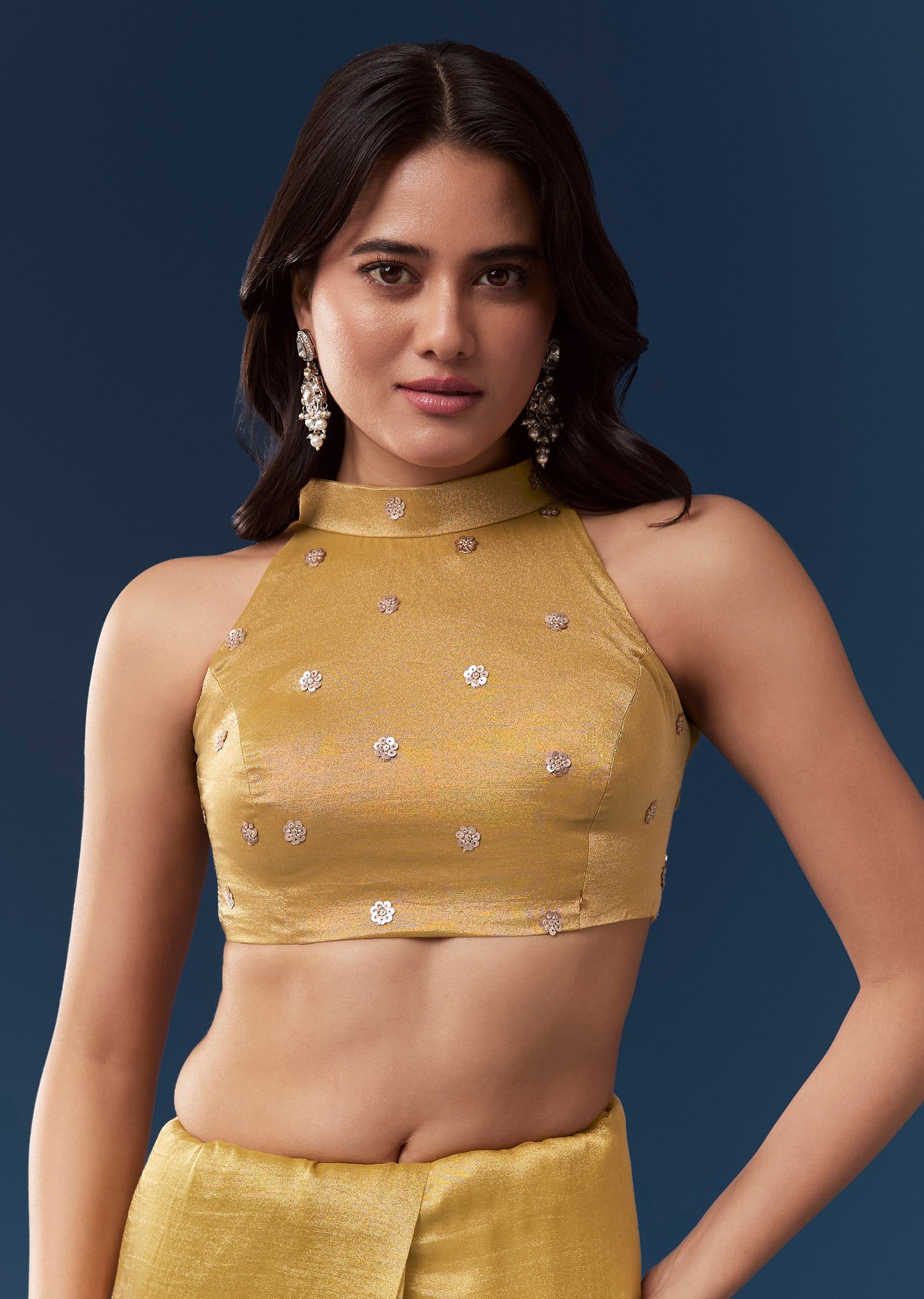 This yellow tissue saree brings pastel festive charm perfect for engagements, haldi ceremonies, or wedding guest looks. The scallop heavy embroidered border is adorned with sequins, cutdana, and beads, while... More Product Details