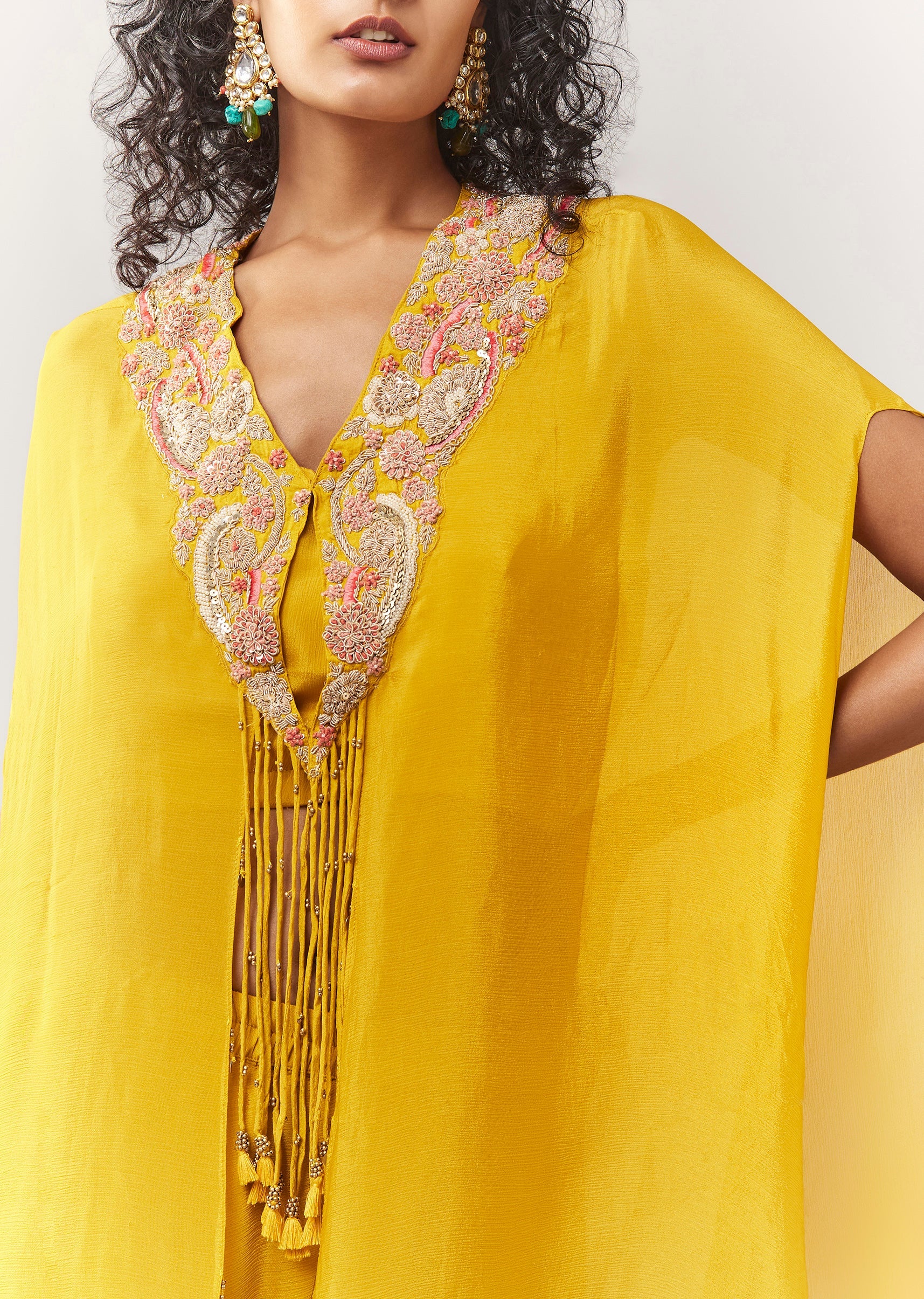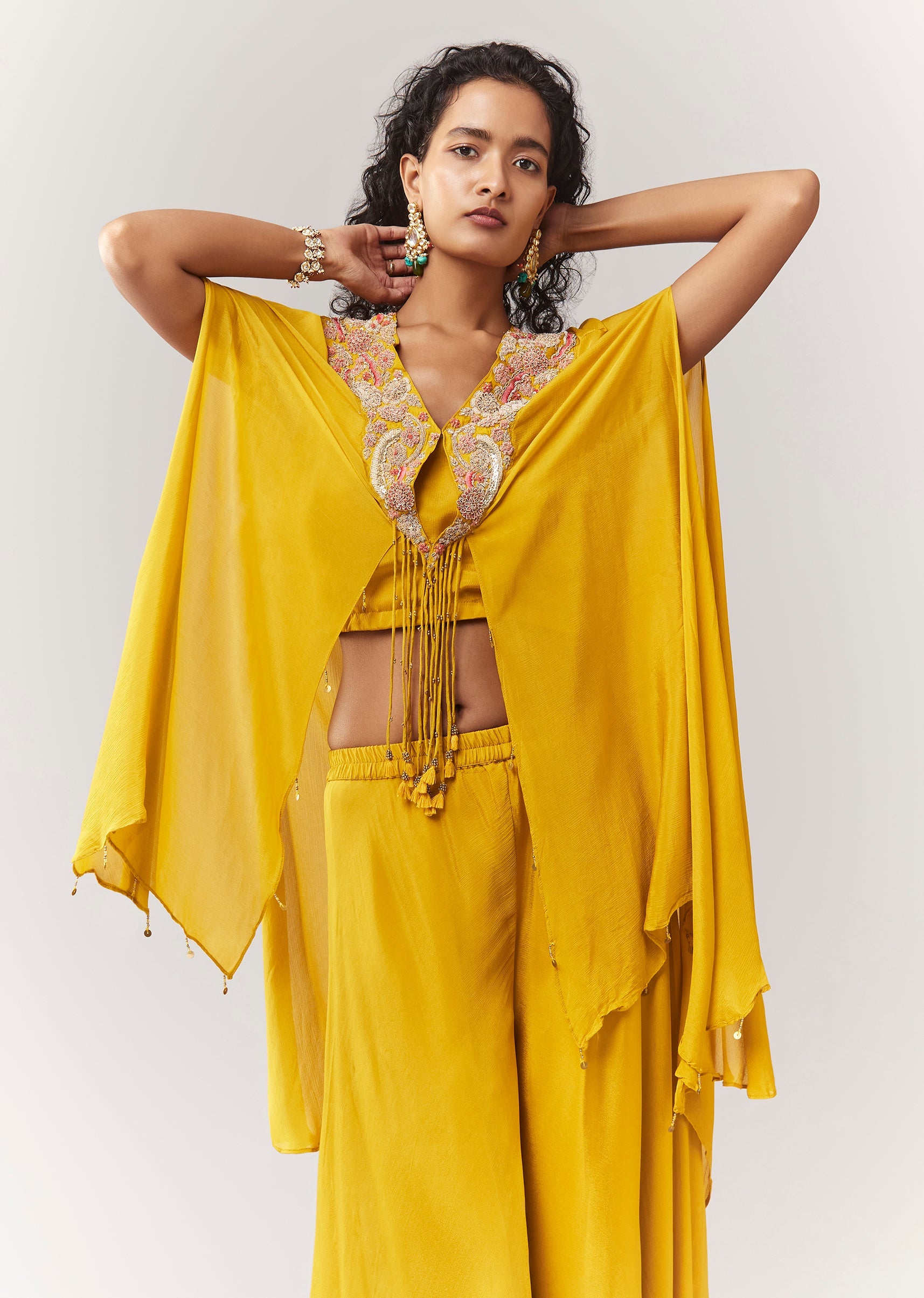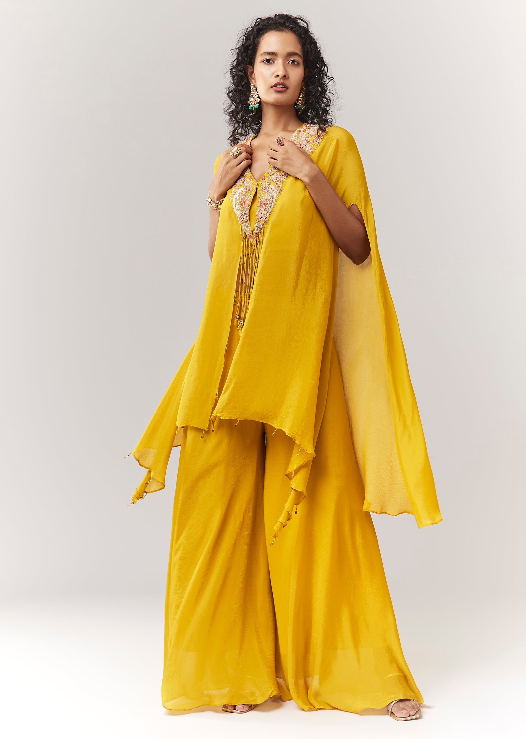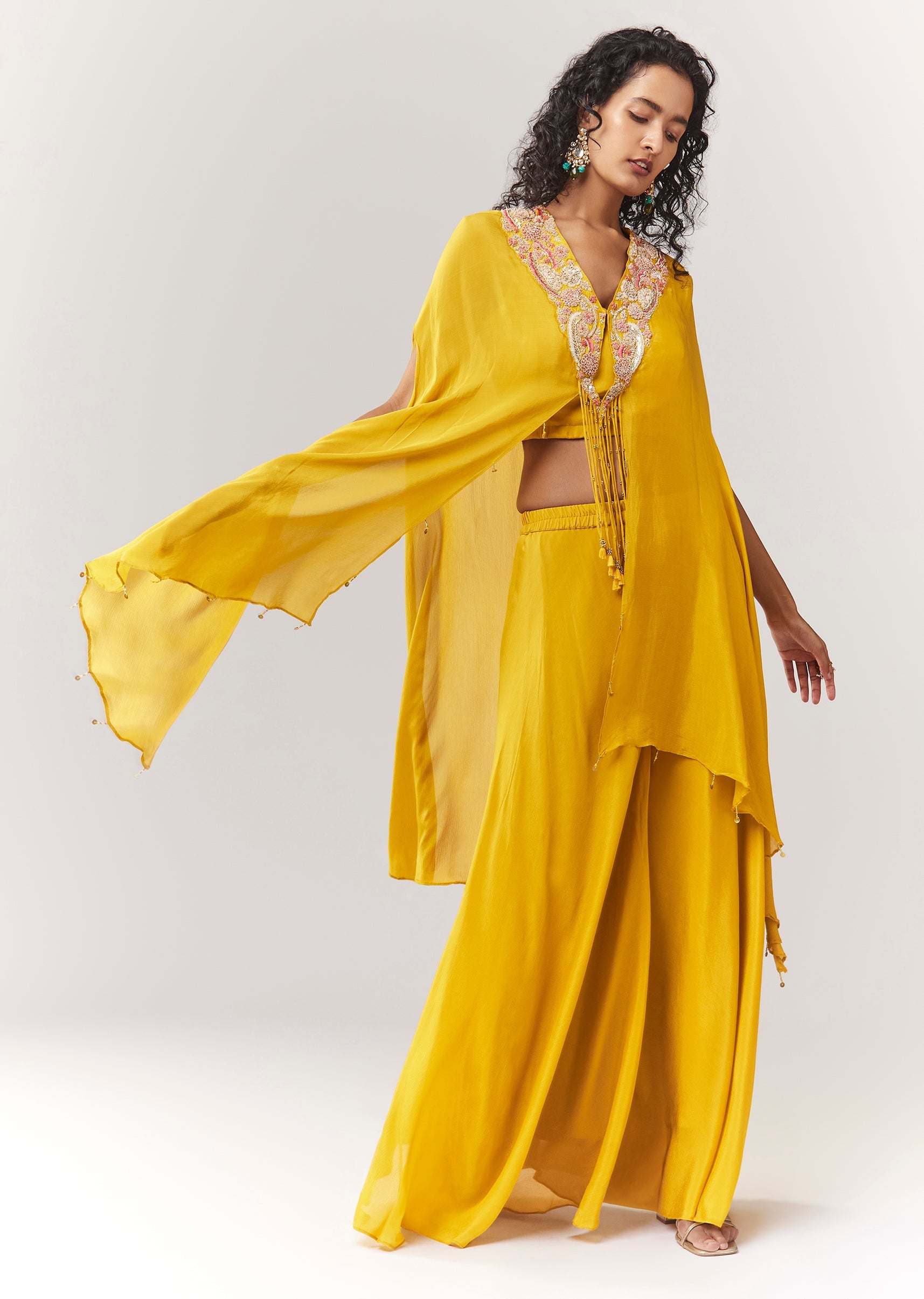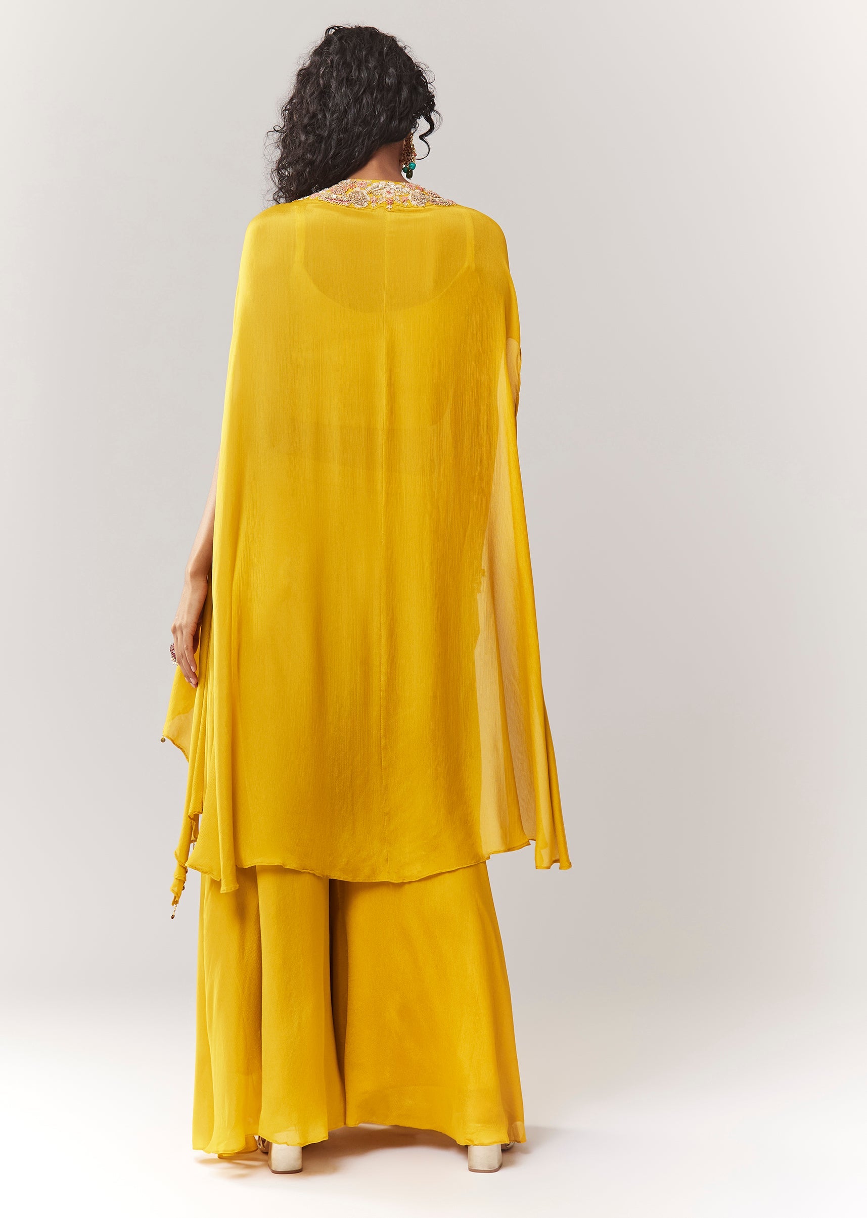 Yellow Zardosi And Moti Cape Set With Palazzo